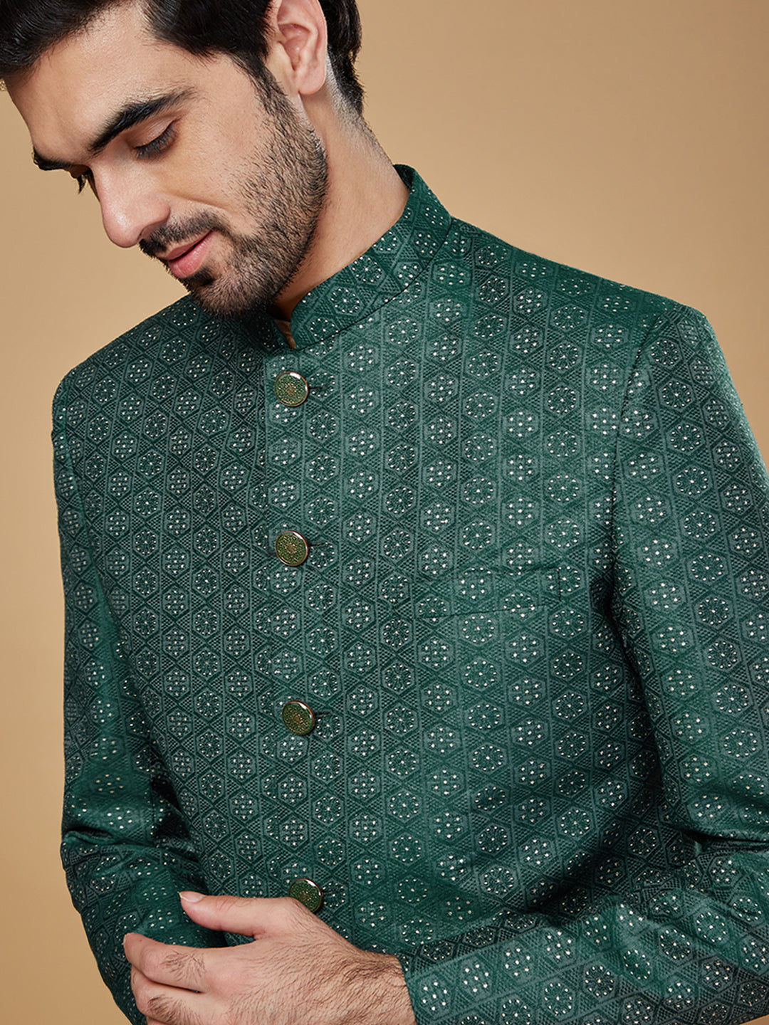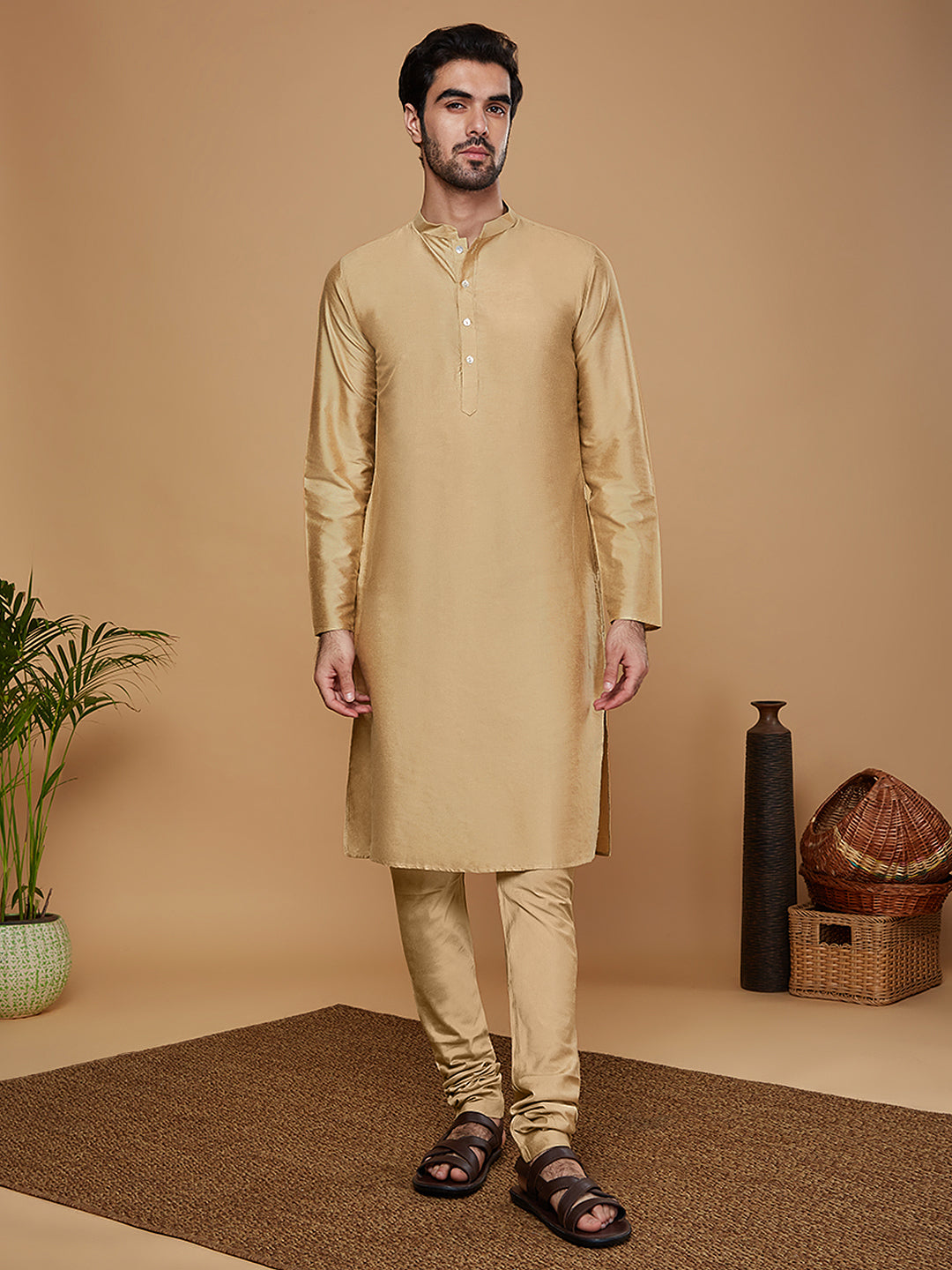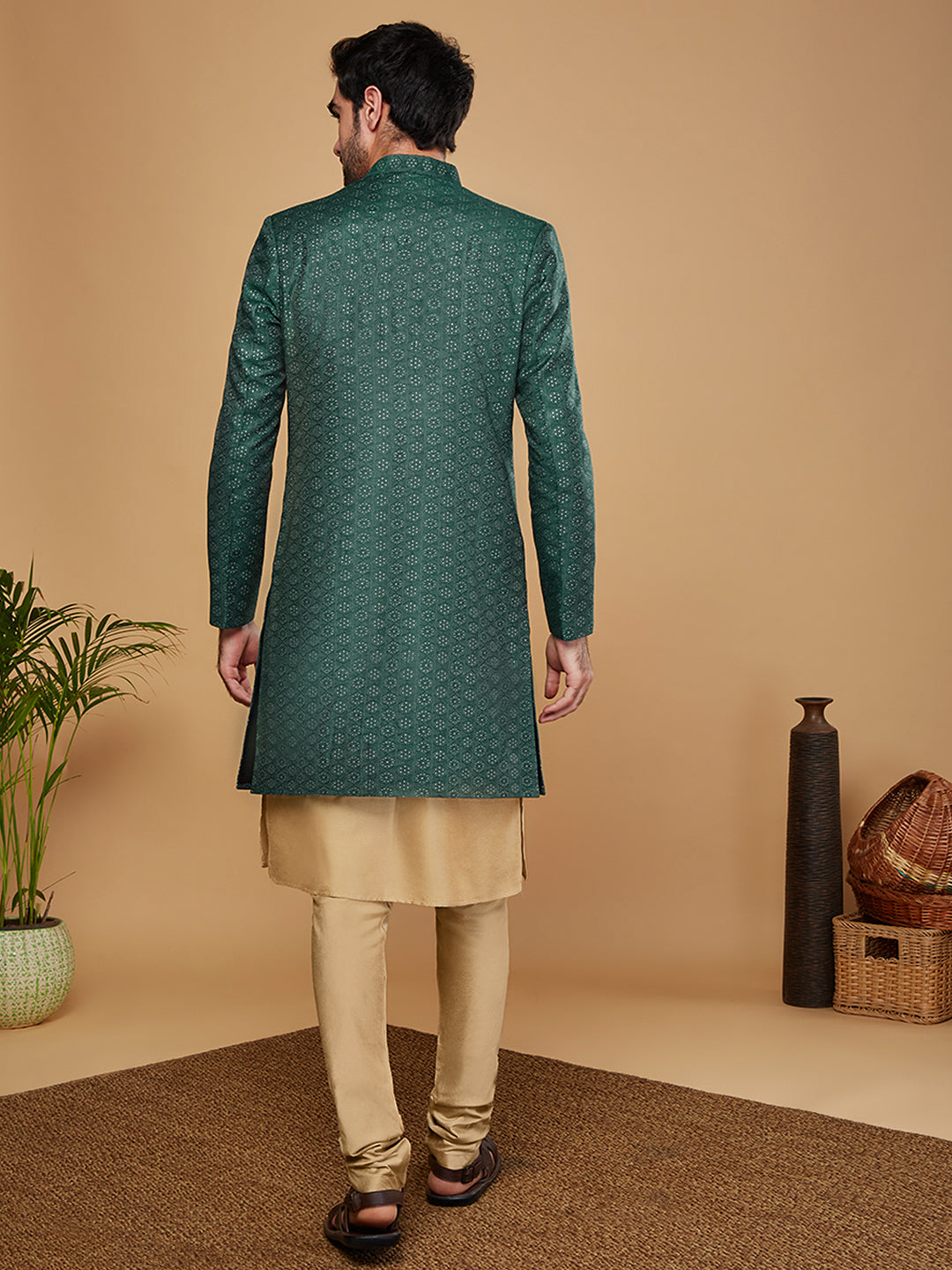 Flaunt your look in this Sherwani set crafted by the designers at Kisah. This Sherwani set is an exquisite set designed in Silk Blend Fabric in Gold. The design all over the Sherwani sets a parting glamorous style.This is a look that satiates traditional fashion needs at its best..