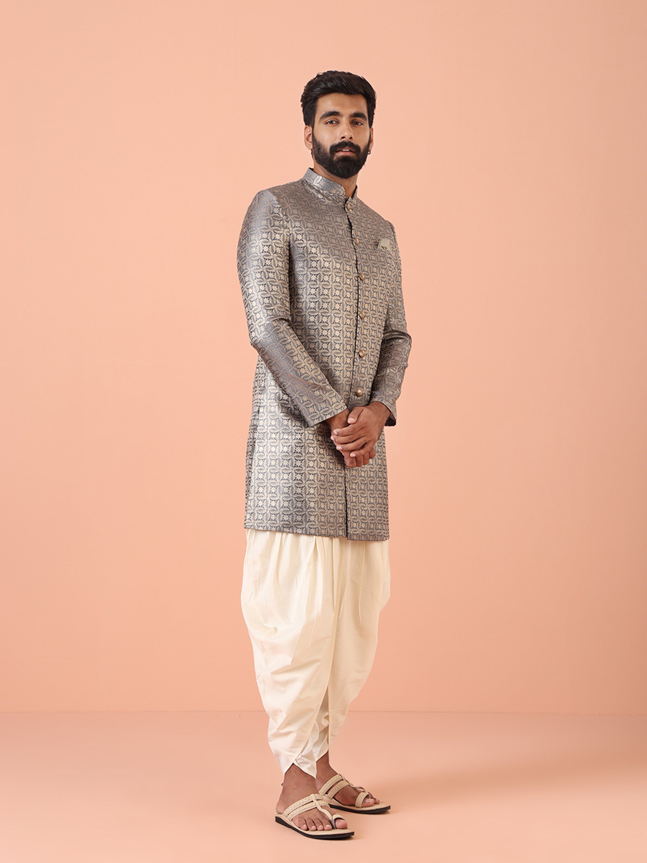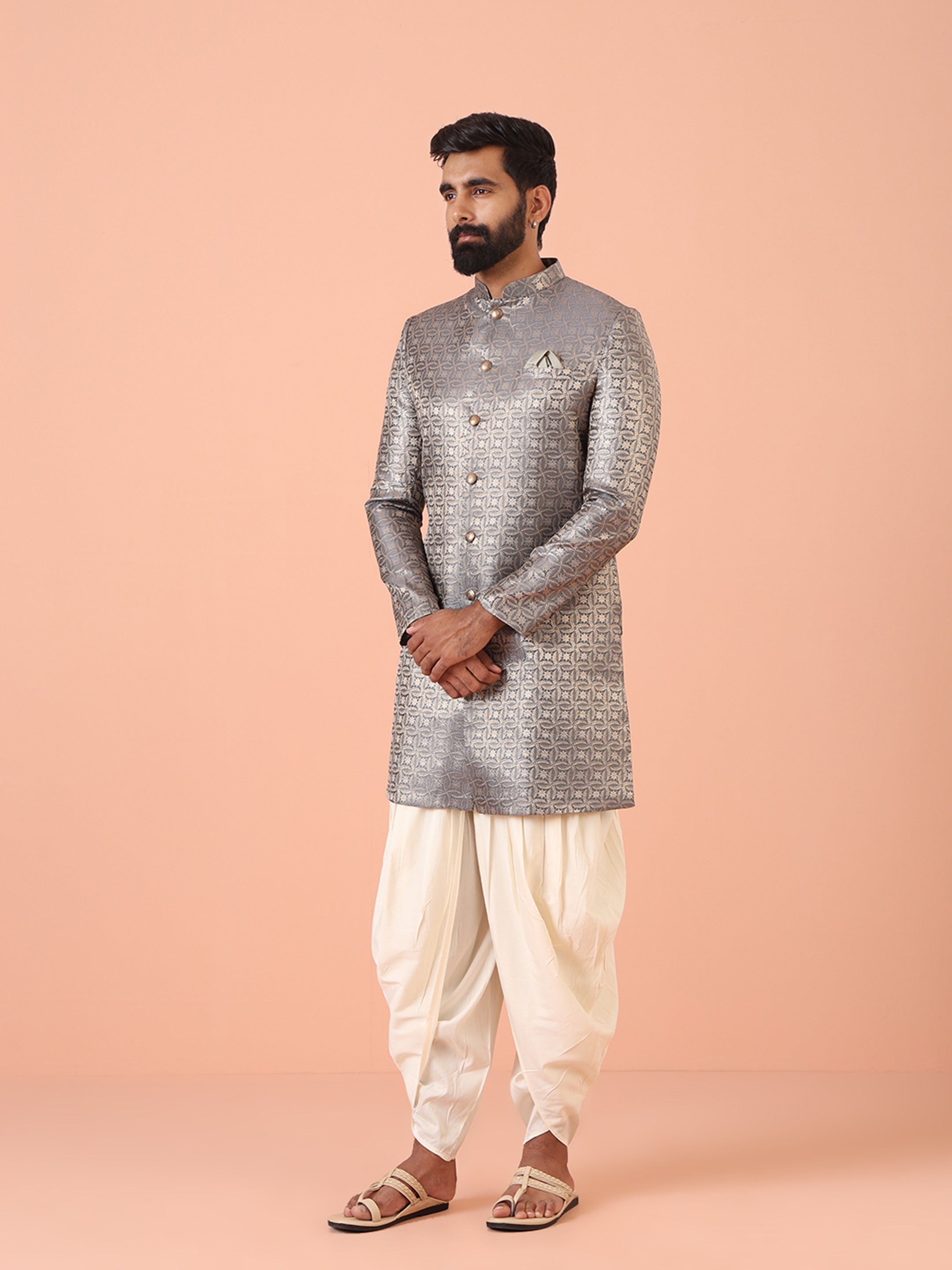 Experience classic elegance with this Men's Grey Color Silk Blend Indo Western Indo Western Set. The Jacquard Pattern adds a refined touch, while the breathable fabric ensures comfort throughout the day. Ideal for festive events or casual wear, this Indo Western Indo Western is a wardrobe essential.