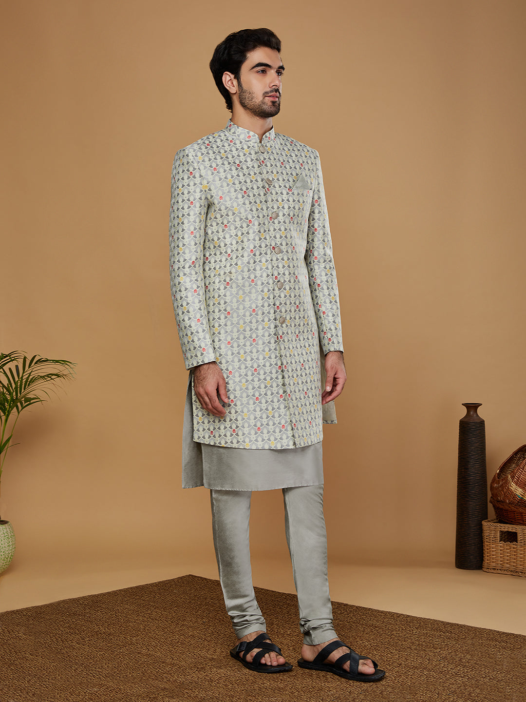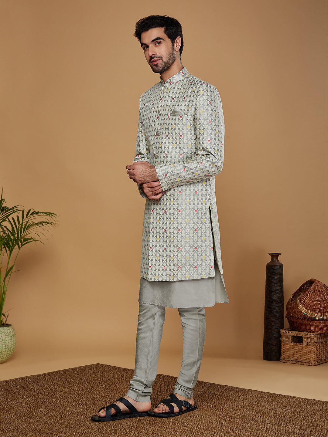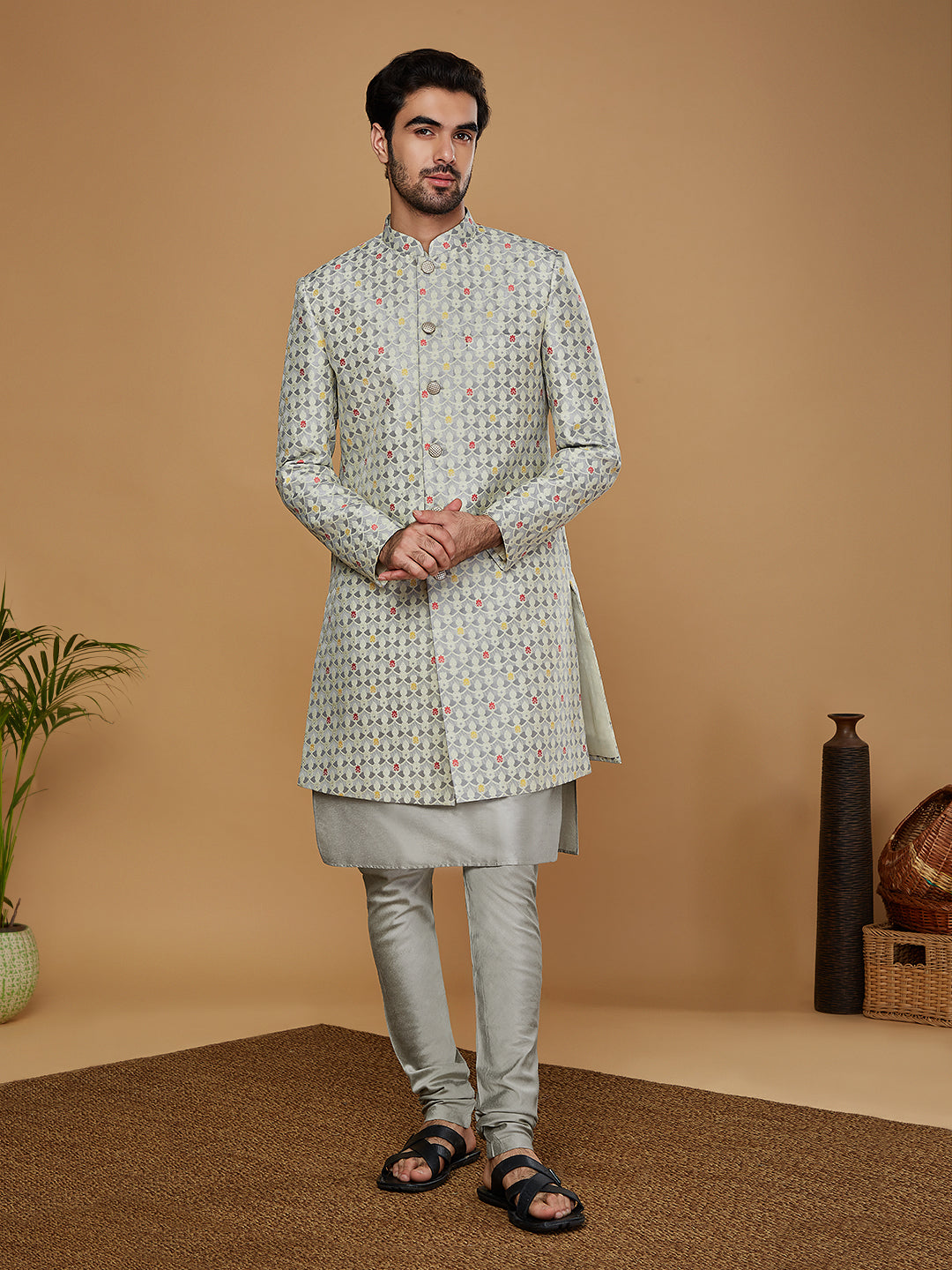 Flaunt your look in this Sherwani set crafted by the designers at Kisah. This Sherwani set is an exquisite set designed in Silk Blend Fabric in Off White. The design all over the Sherwani sets a parting glamorous style.This is a look that satiates traditional fashion needs at its best..