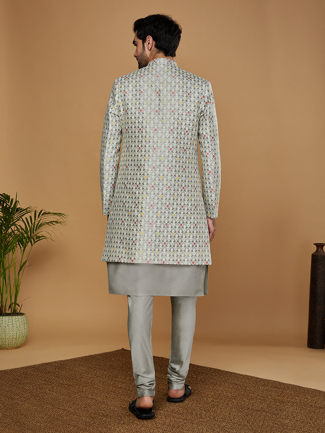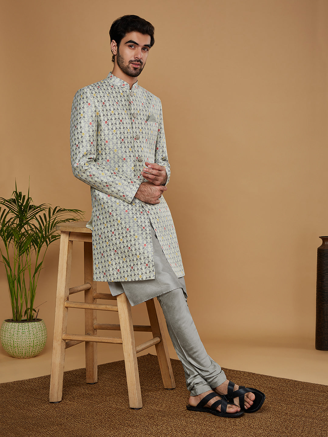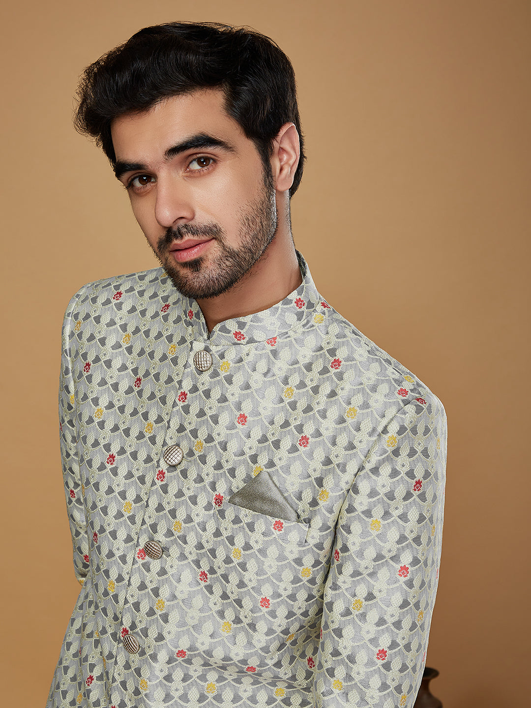Flaunt your look in this Sherwani set crafted by the designers at Kisah. This Sherwani set is an exquisite set designed in Silk Blend Fabric in Off White. The design all over the Sherwani sets a parting glamorous style.This is a look that satiates traditional fashion needs at its best..