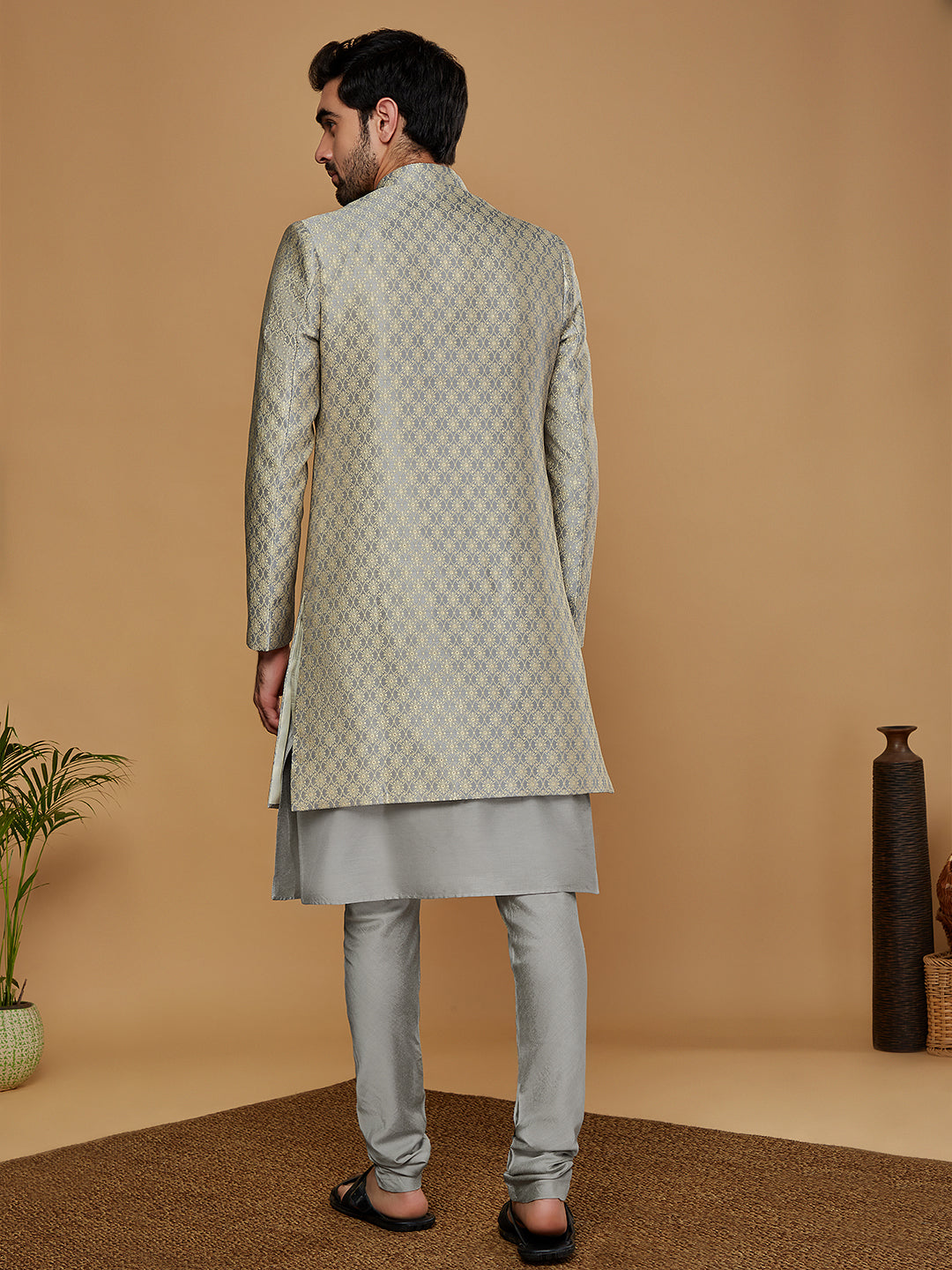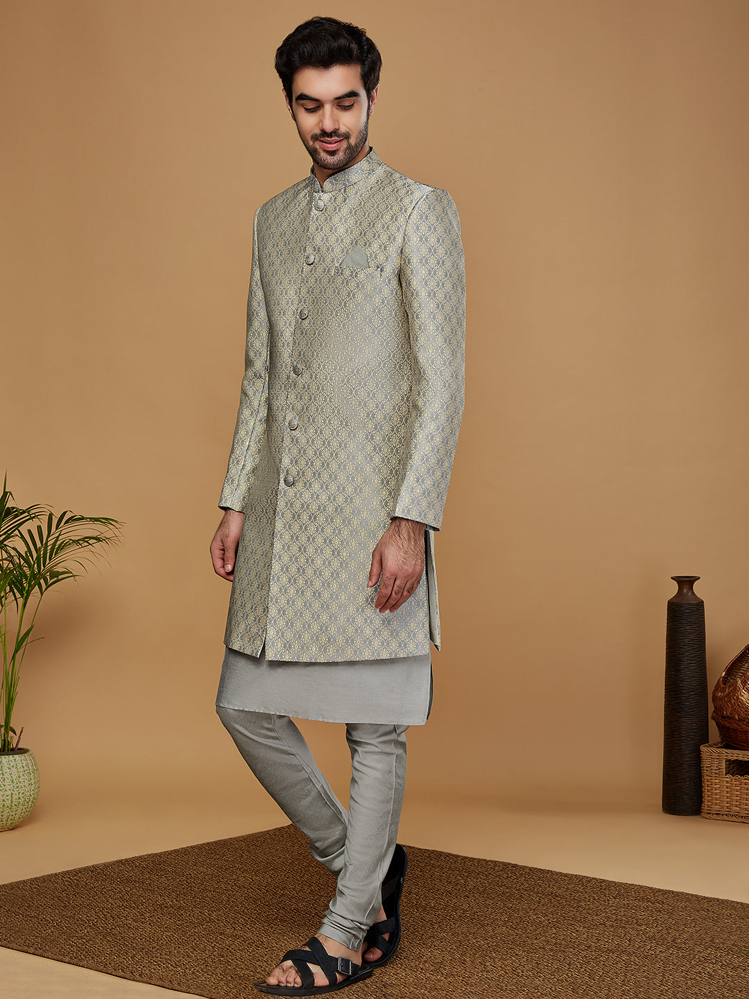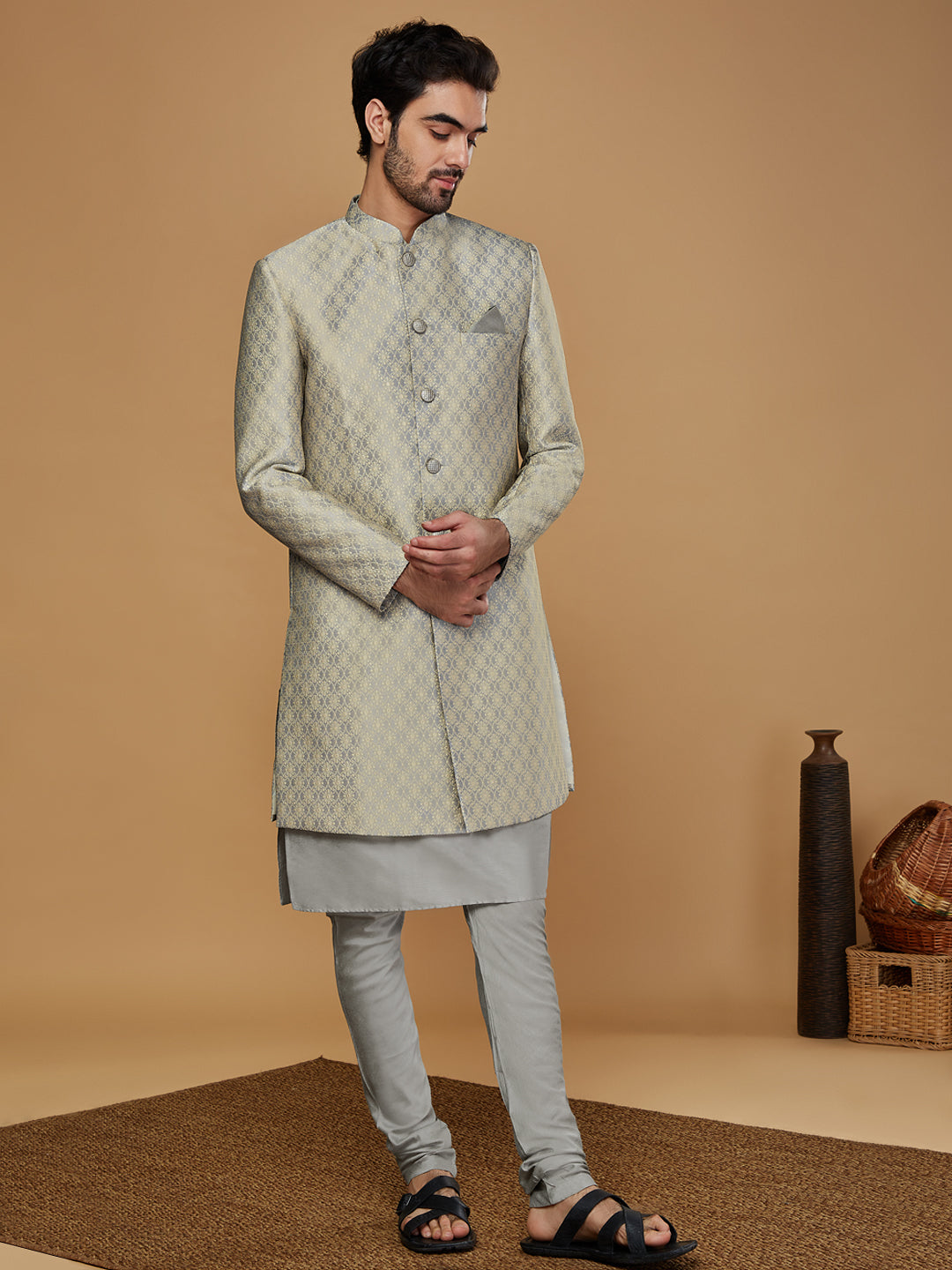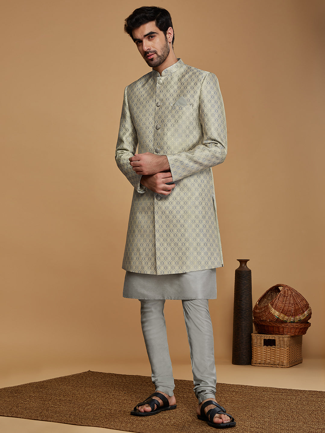 Flaunt your look in this Sherwani set crafted by the designers at Kisah. This Sherwani set is an exquisite set designed in Silk Blend Fabric in Off White. The design all over the Sherwani sets a parting glamorous style.This is a look that satiates traditional fashion needs at its best..