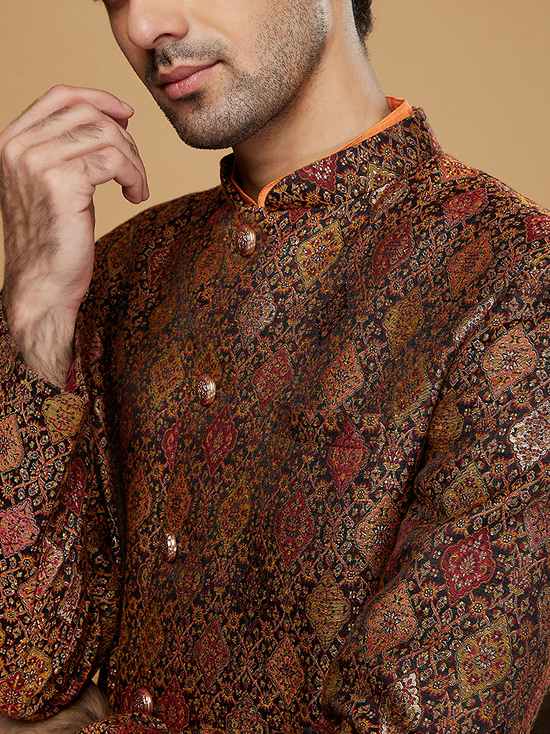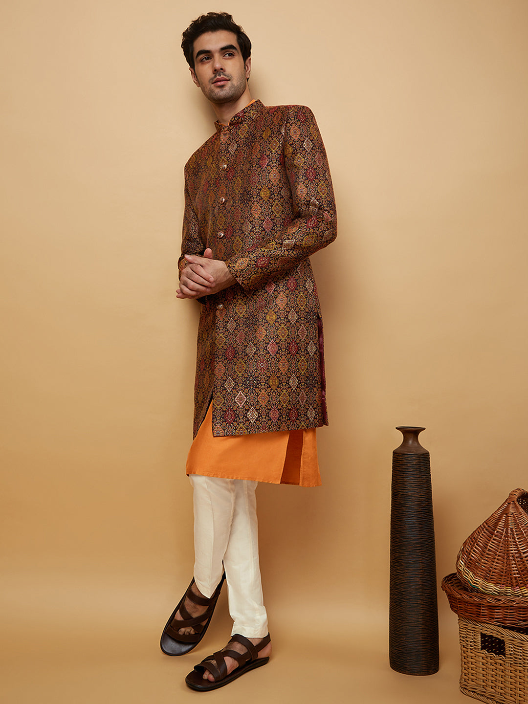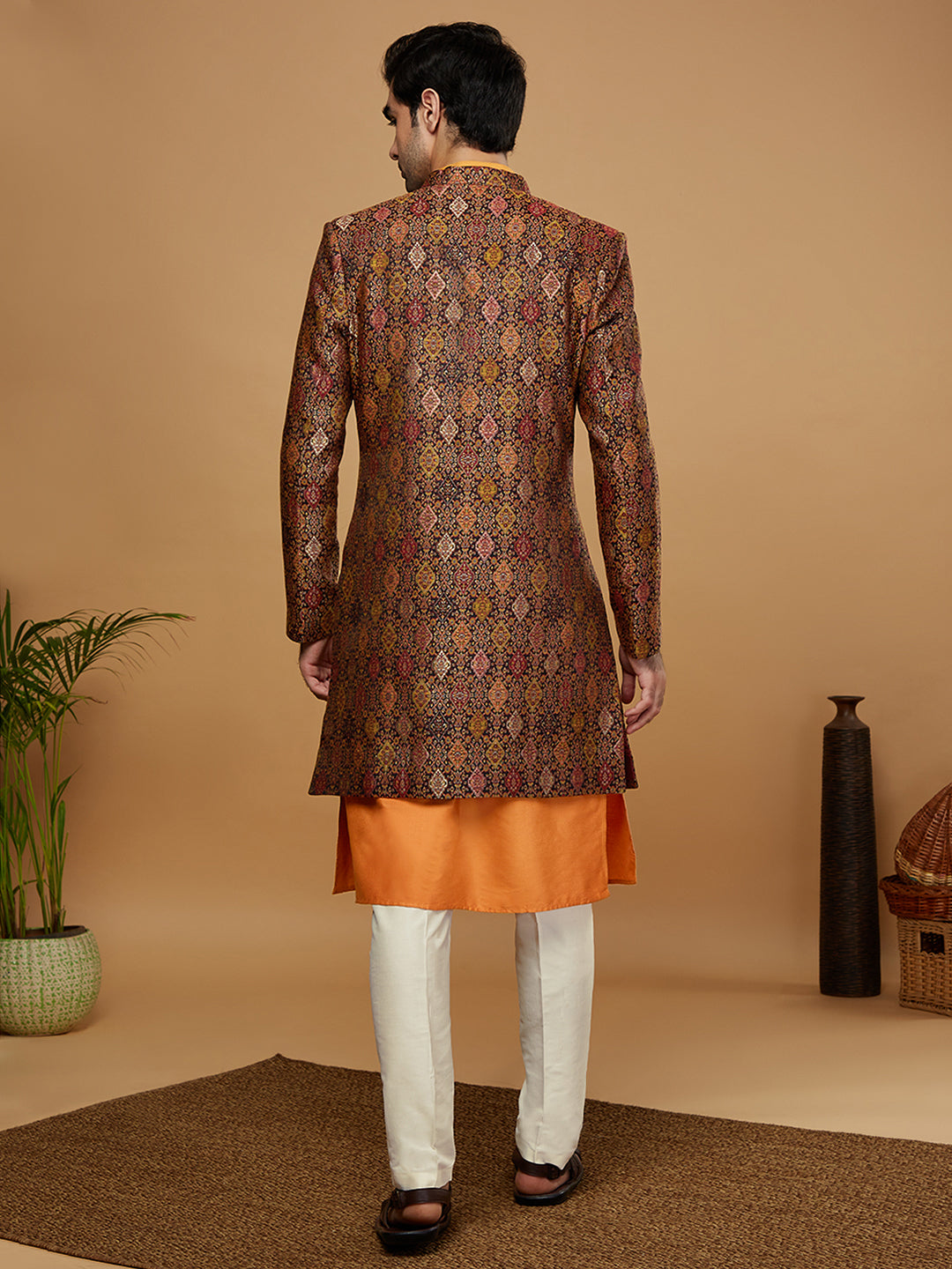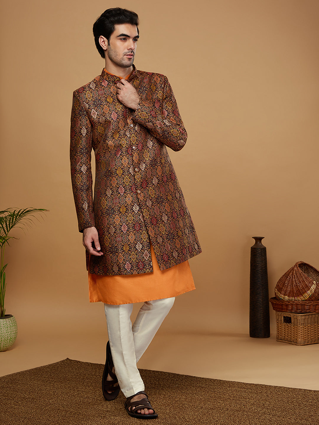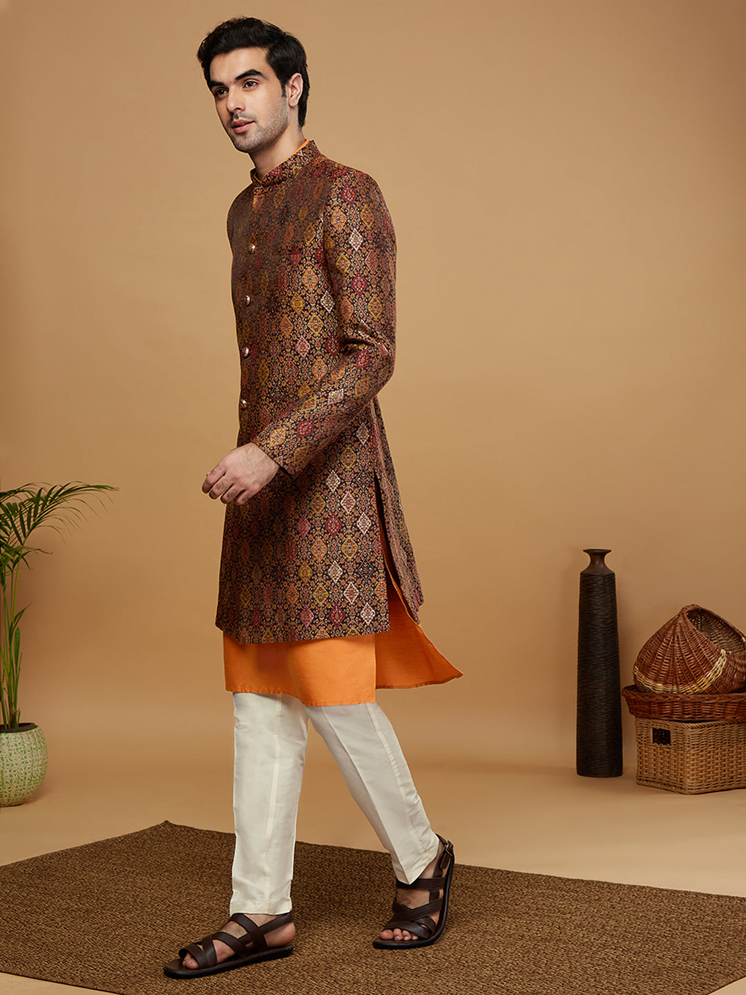 Flaunt your look in this Sherwani set crafted by the designers at Kisah. This Sherwani set is an exquisite set designed in Silk Blend Fabric in . The design all over the Sherwani sets a parting glamorous style.This is a look that satiates traditional fashion needs at its best..