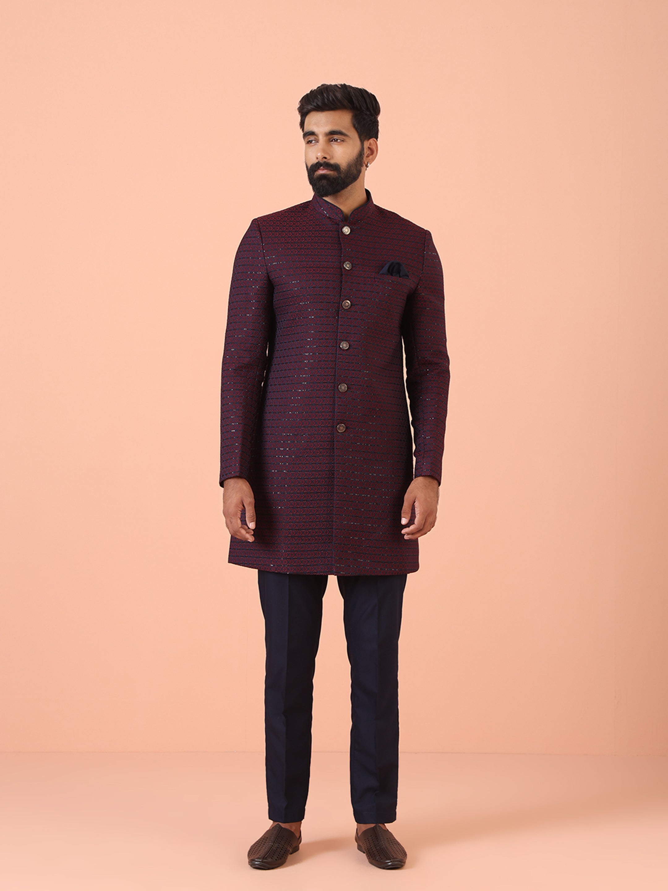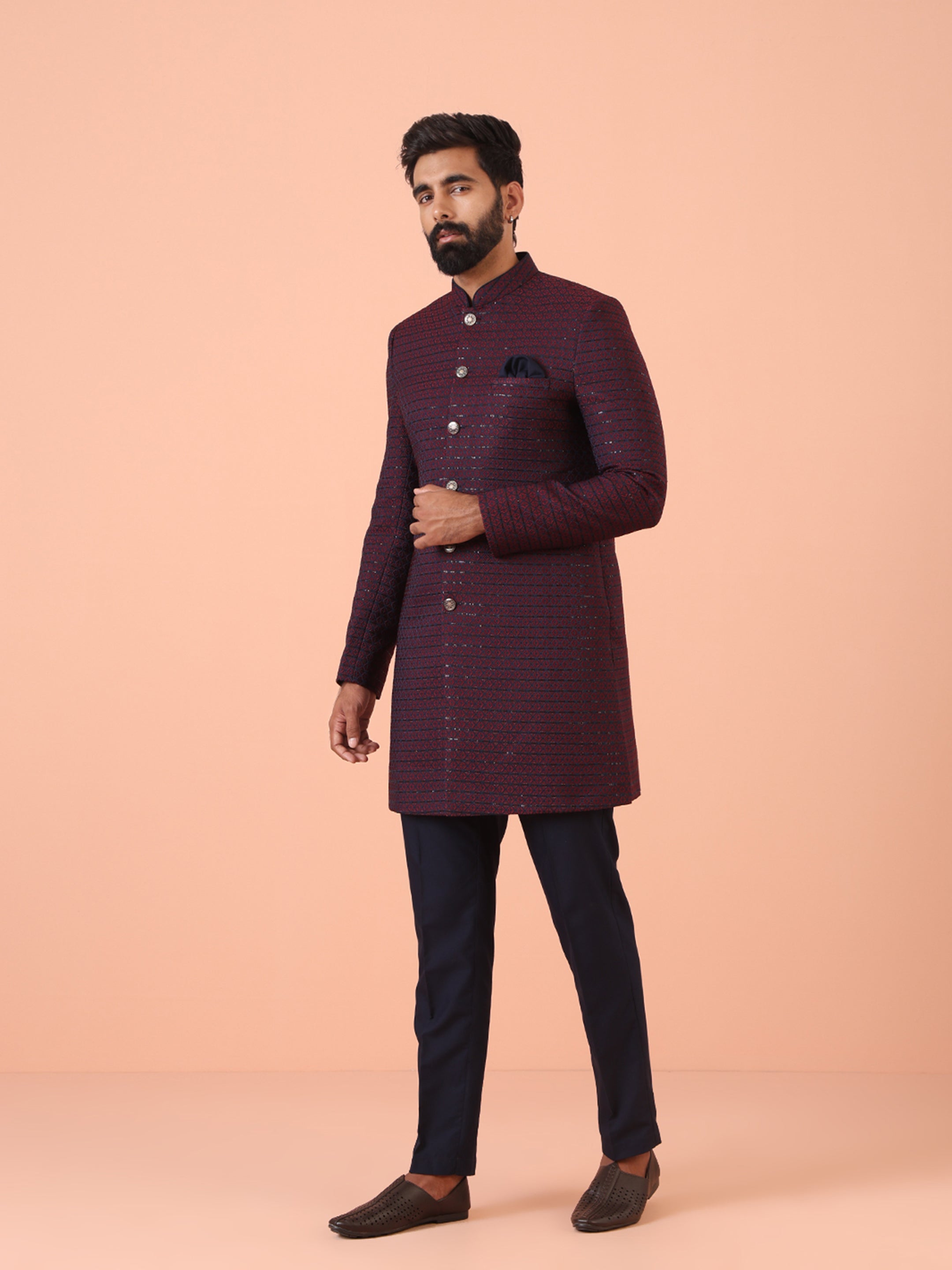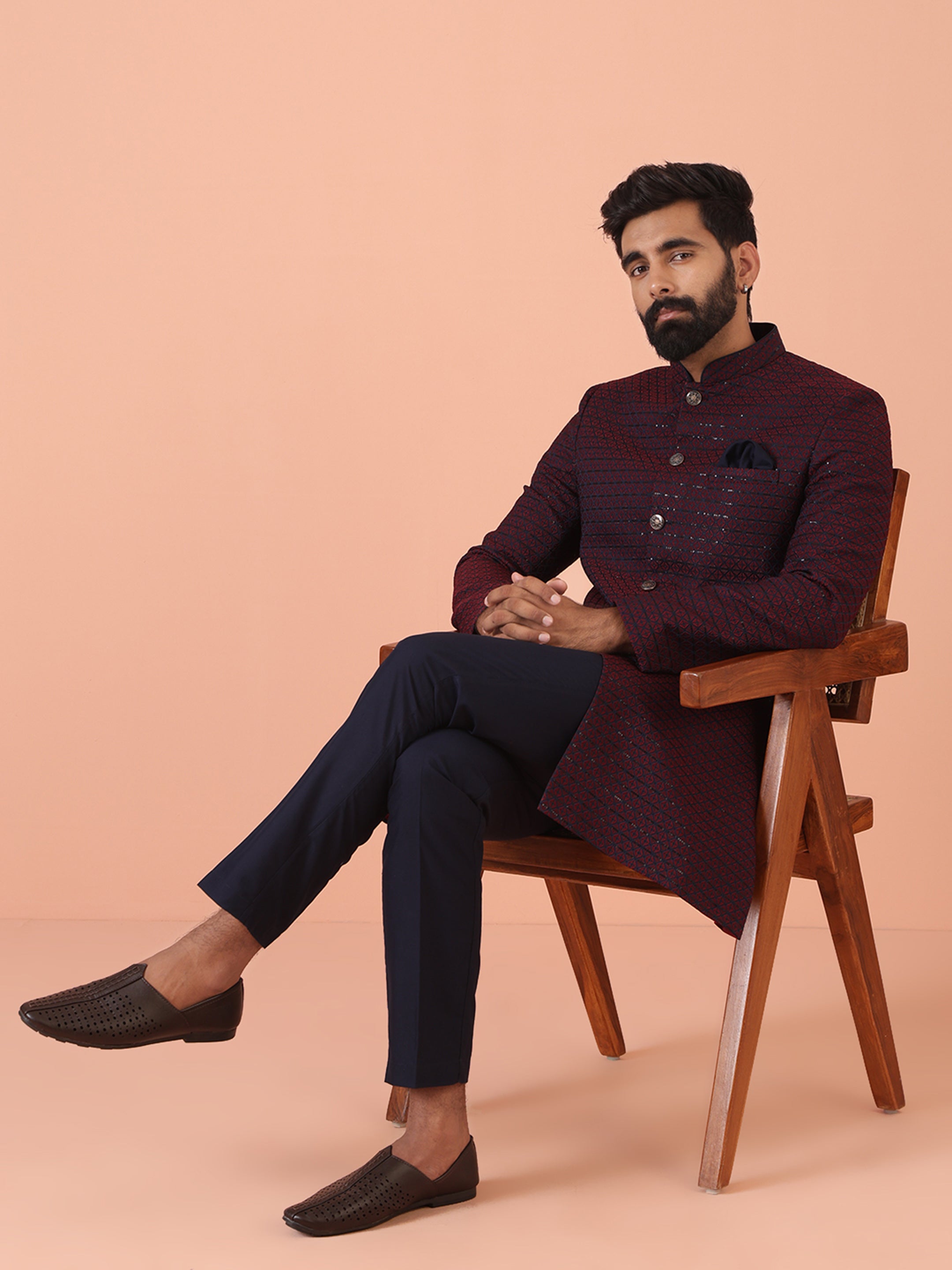 Experience classic elegance with this Men's Navy Blue Color Silk Blend Indo Western Indo Western Trouser Set. The Jacquard Pattern adds a refined touch, while the breathable fabric ensures comfort throughout the day. Ideal for festive events or casual wear, this Indo Western Indo Western Trouser Set is a wardrobe essential.