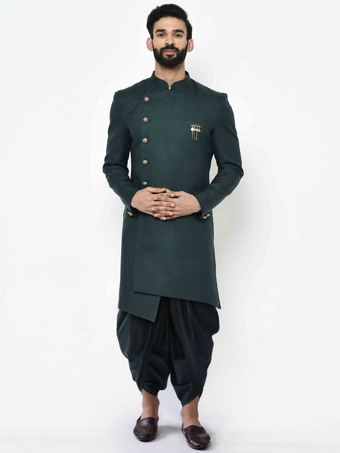 Dark Green Solid Sherwani with Black Dhoti