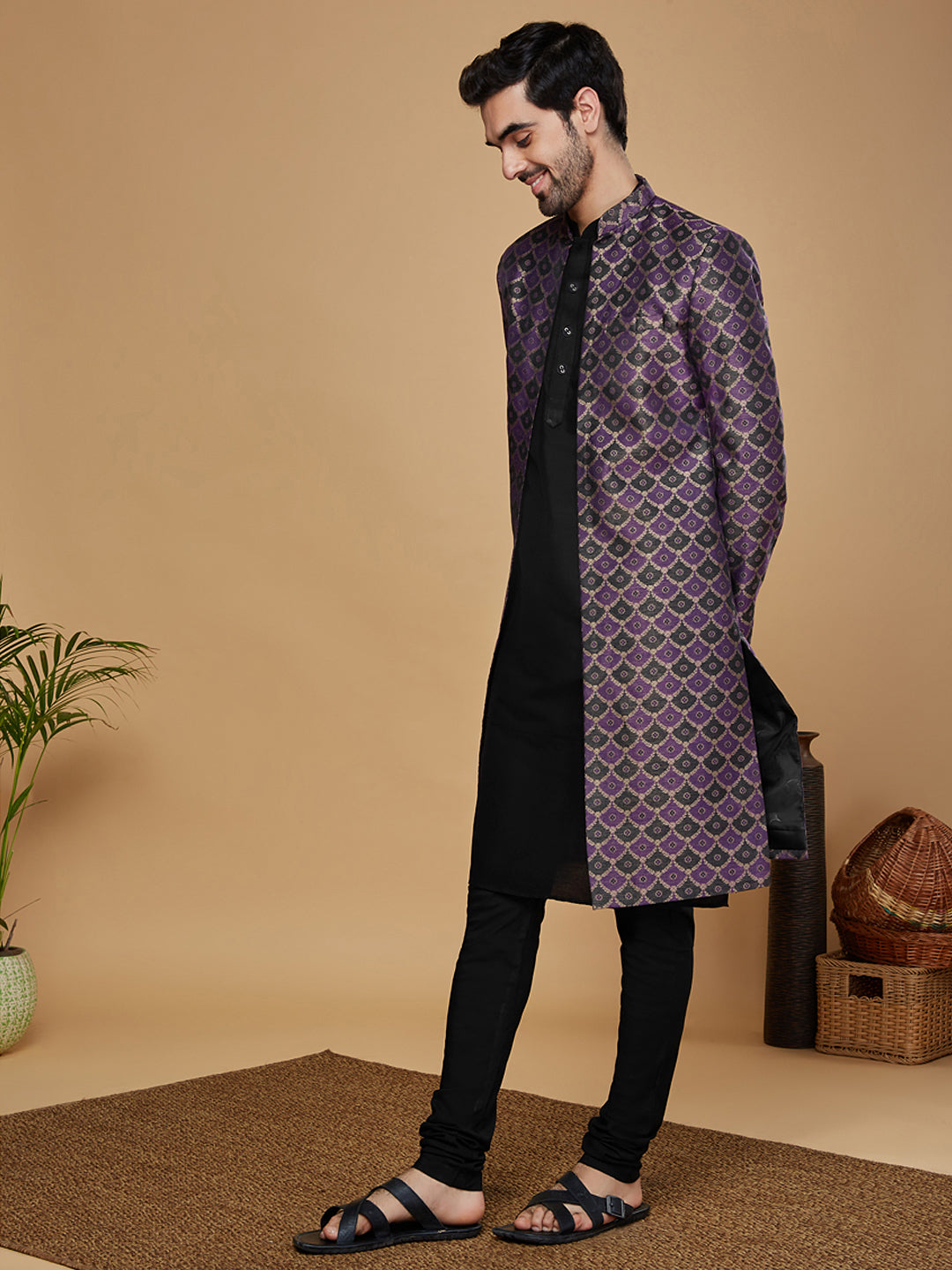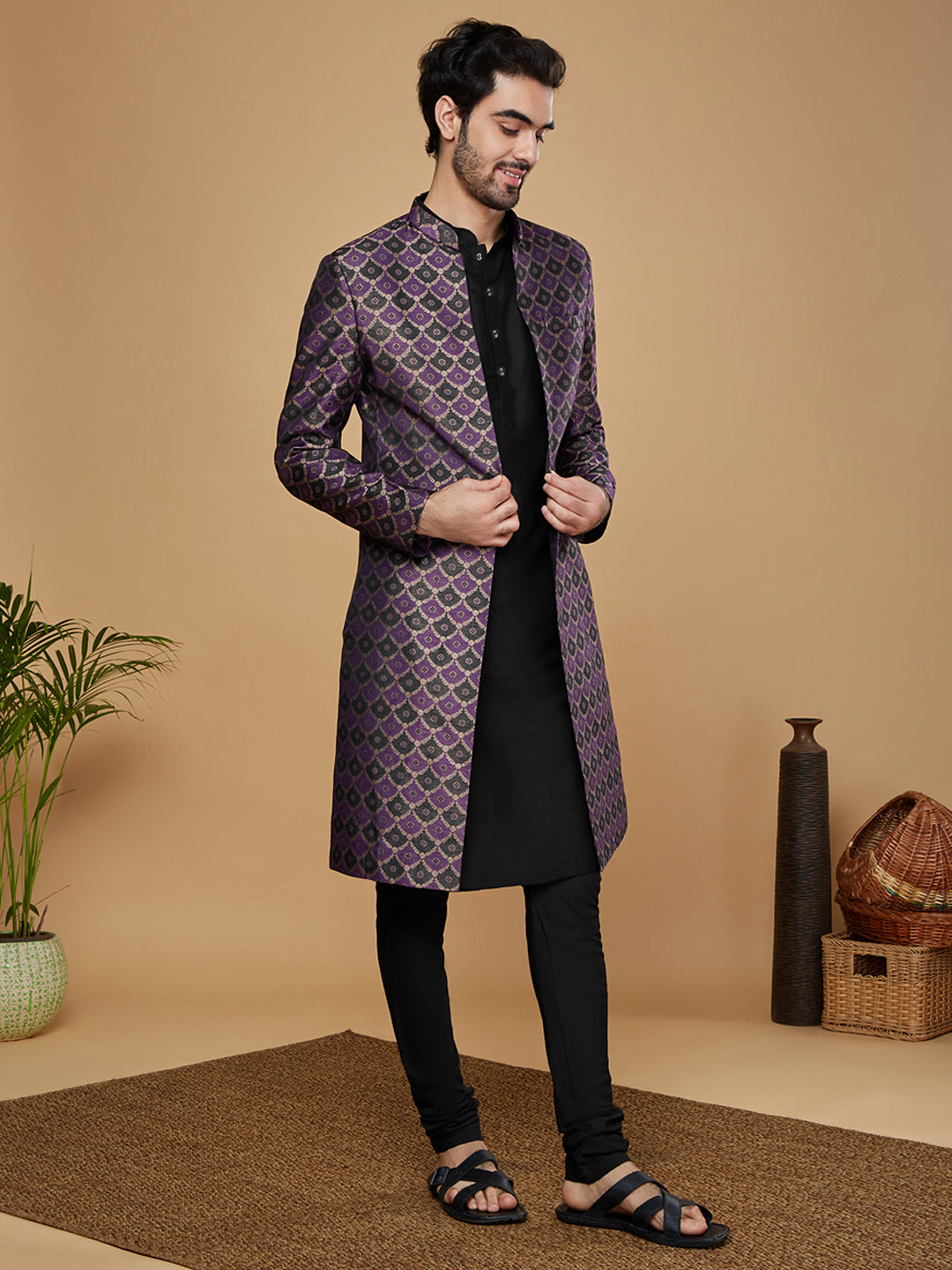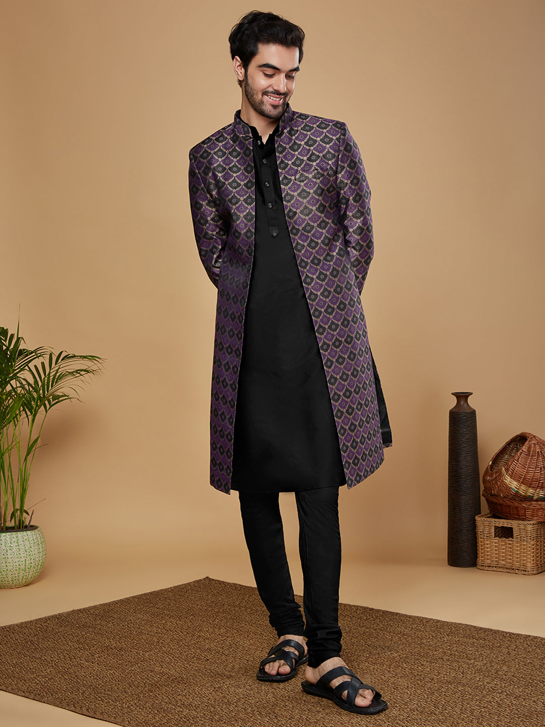 Flaunt your look in this Sherwani set crafted by the designers at Kisah. This Sherwani set is an exquisite set designed in Silk Blend Fabric in Black. The design all over the Sherwani sets a parting glamorous style. This is a look that satiates traditional fashion needs at its best..