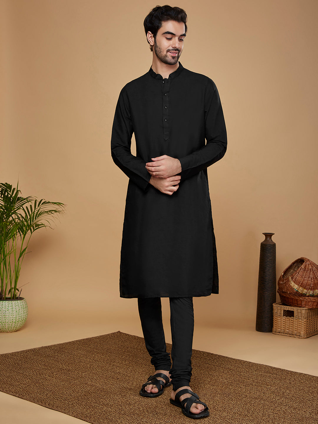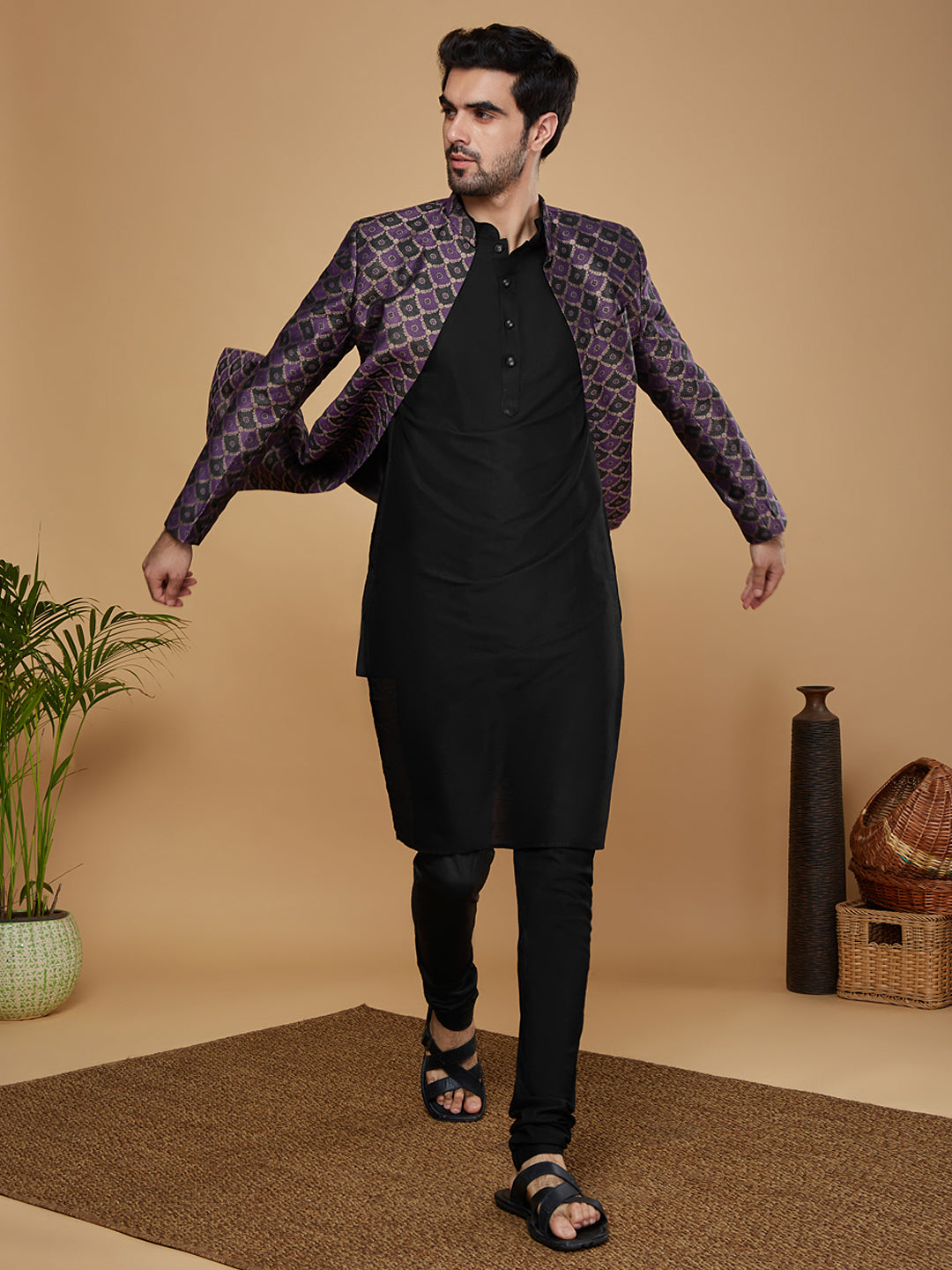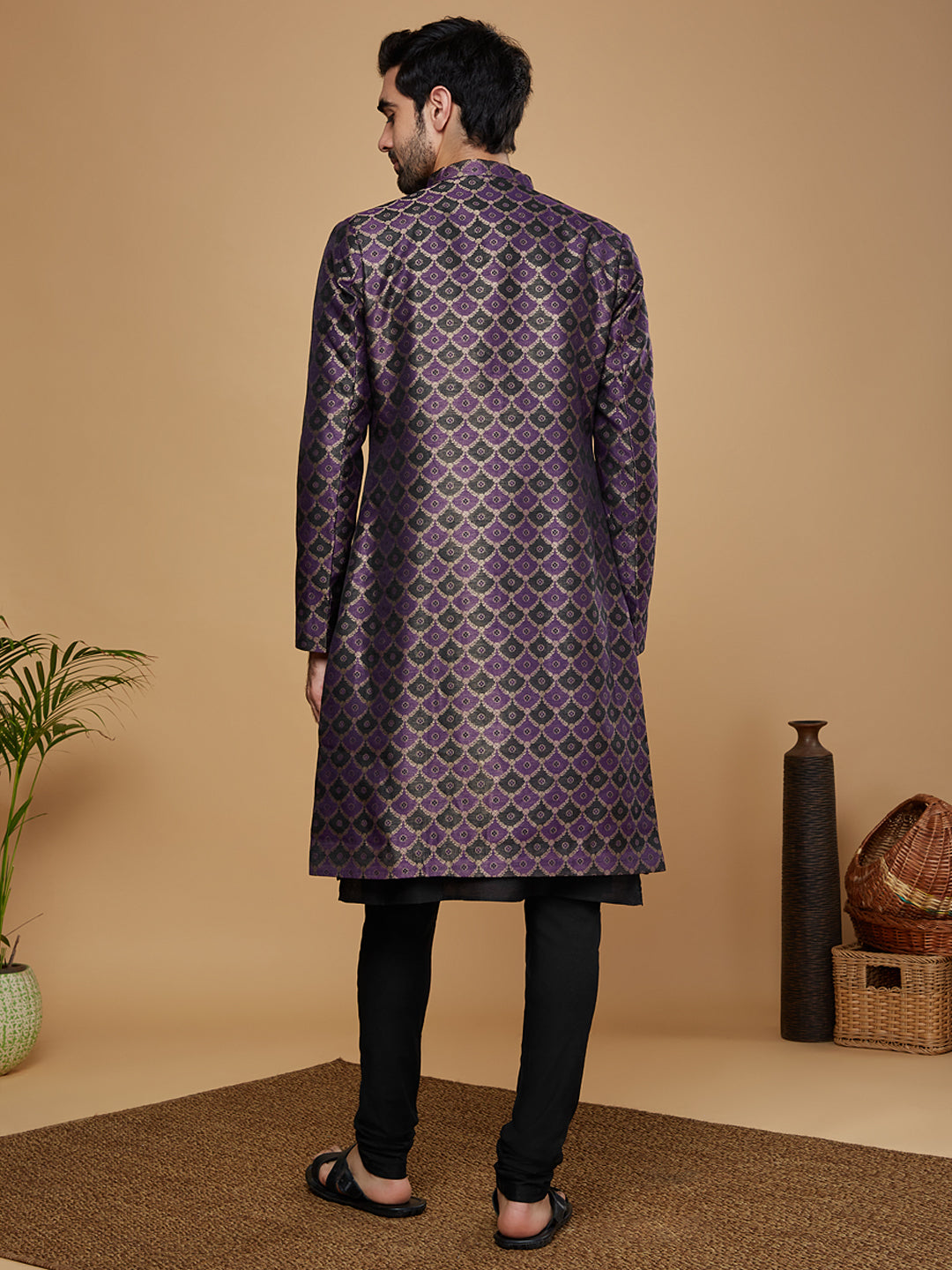 Flaunt your look in this Sherwani set crafted by the designers at Kisah. This Sherwani set is an exquisite set designed in Silk Blend Fabric in Black. The design all over the Sherwani sets a parting glamorous style. This is a look that satiates traditional fashion needs at its best..