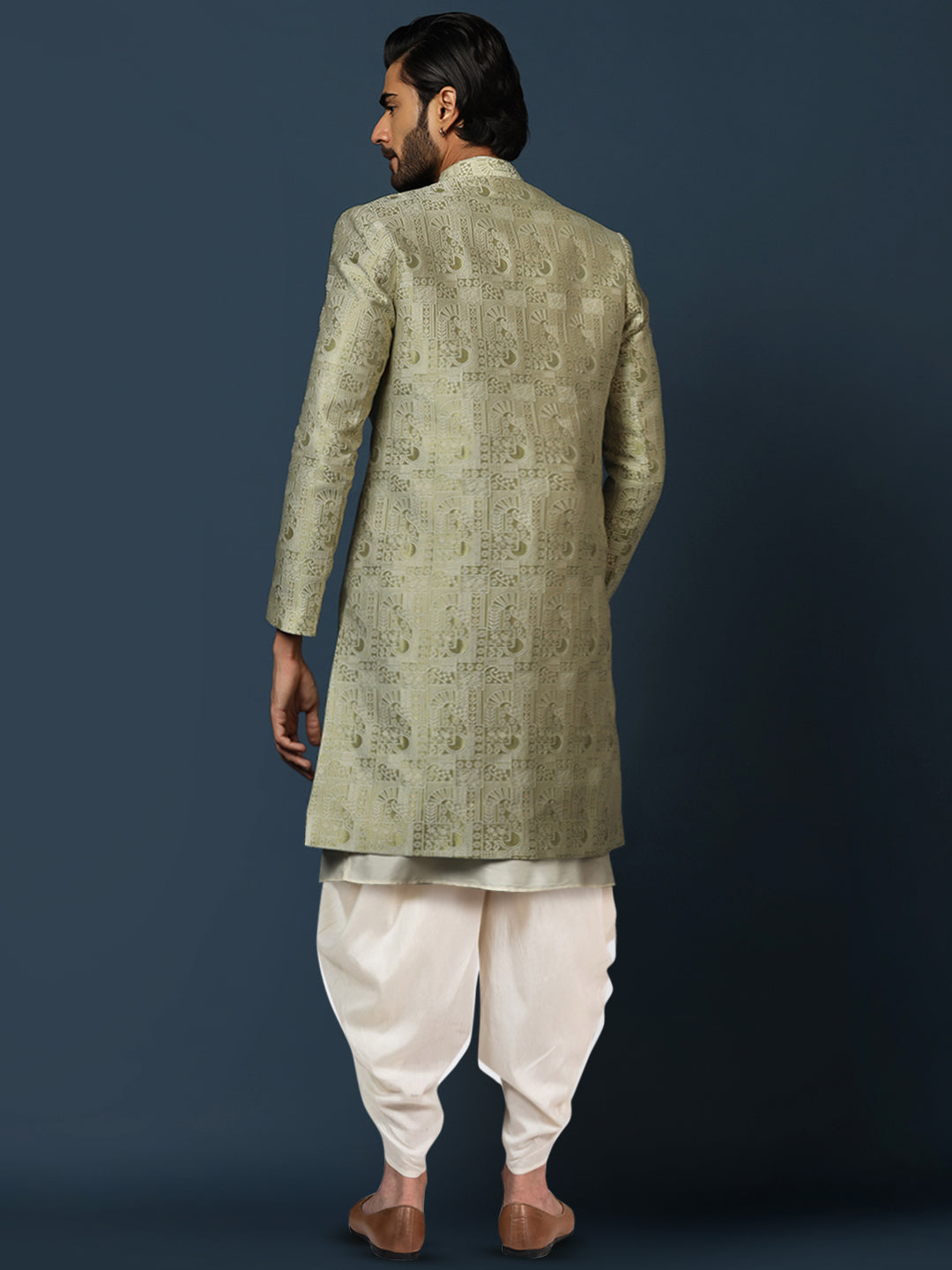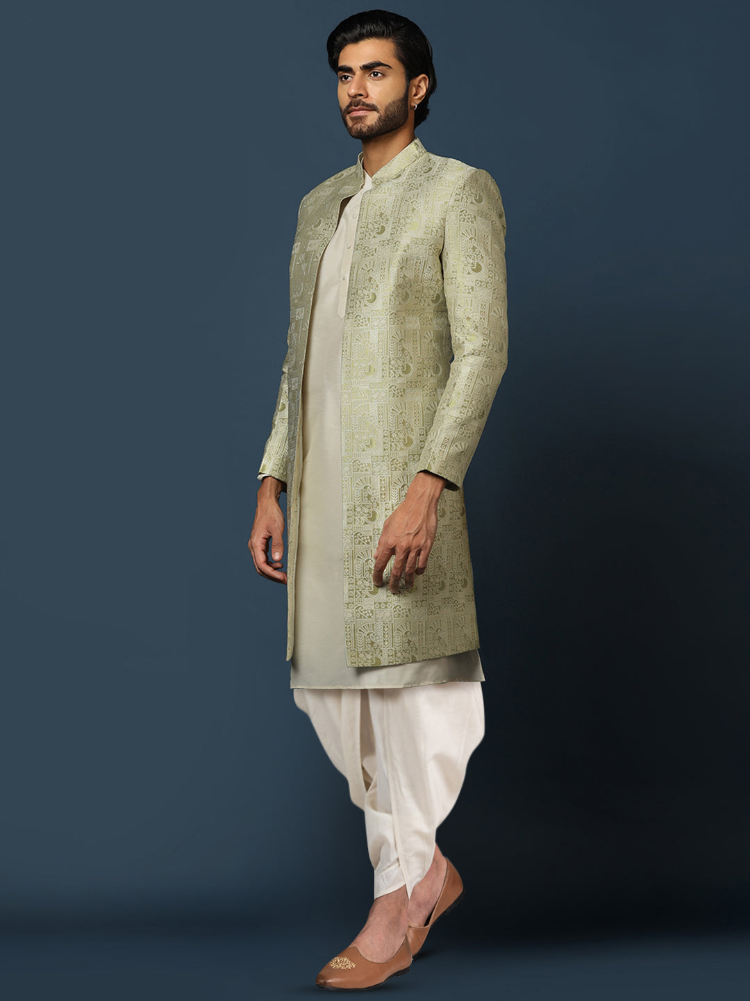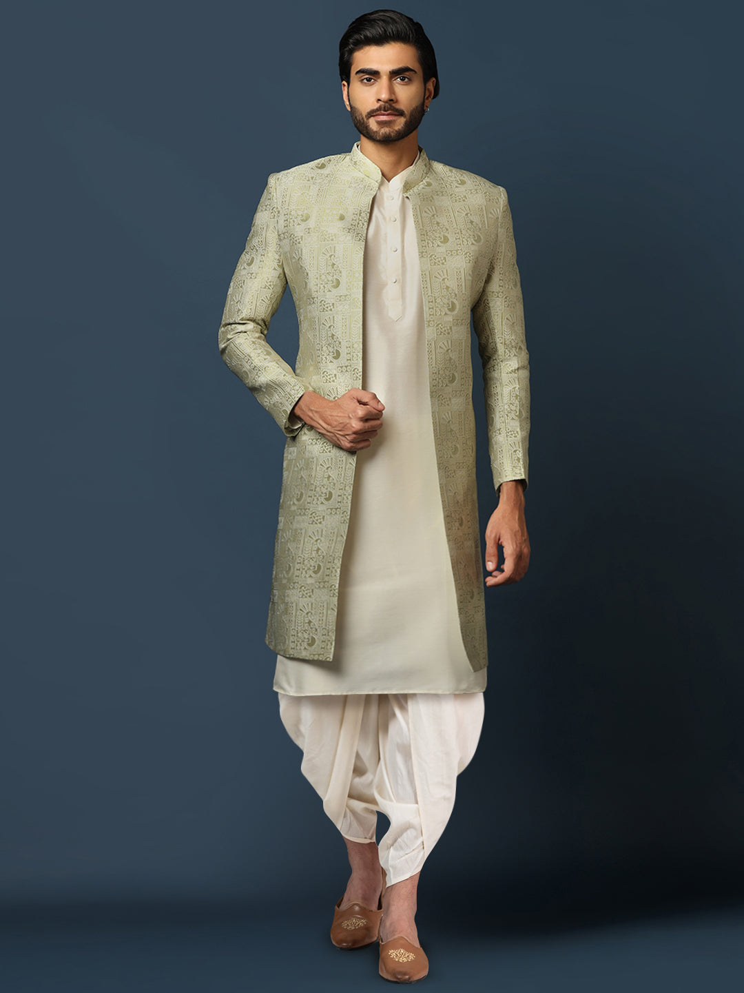 This Indowestern set is an elegant mandarin collar style that is perfect for occasional wear. With a full sleeve design, Beige colour and Cotton fabric, it will make you look stylish. Featuring a Kurta, Indowestern & Bottomwear, it is perfect for formal occasions.