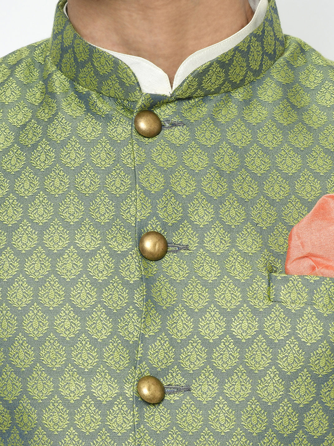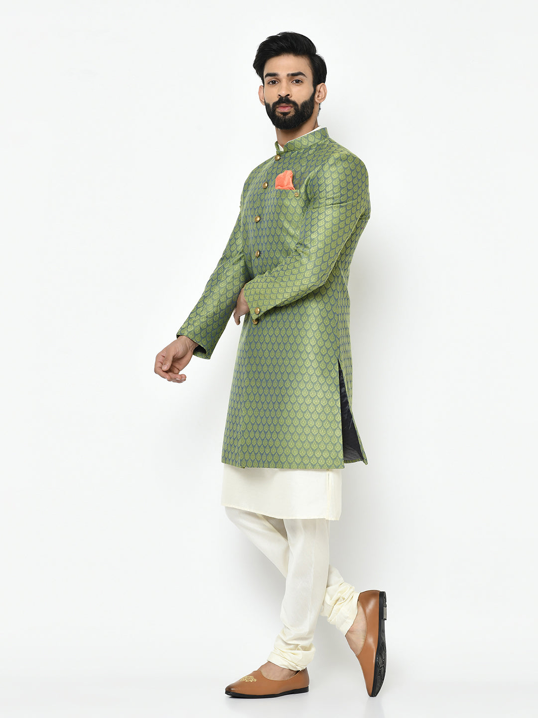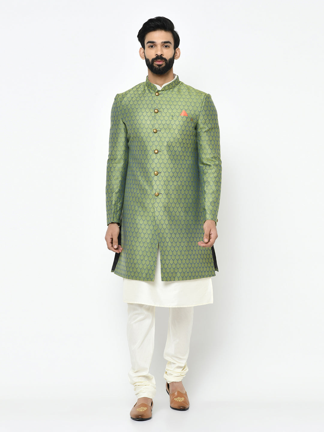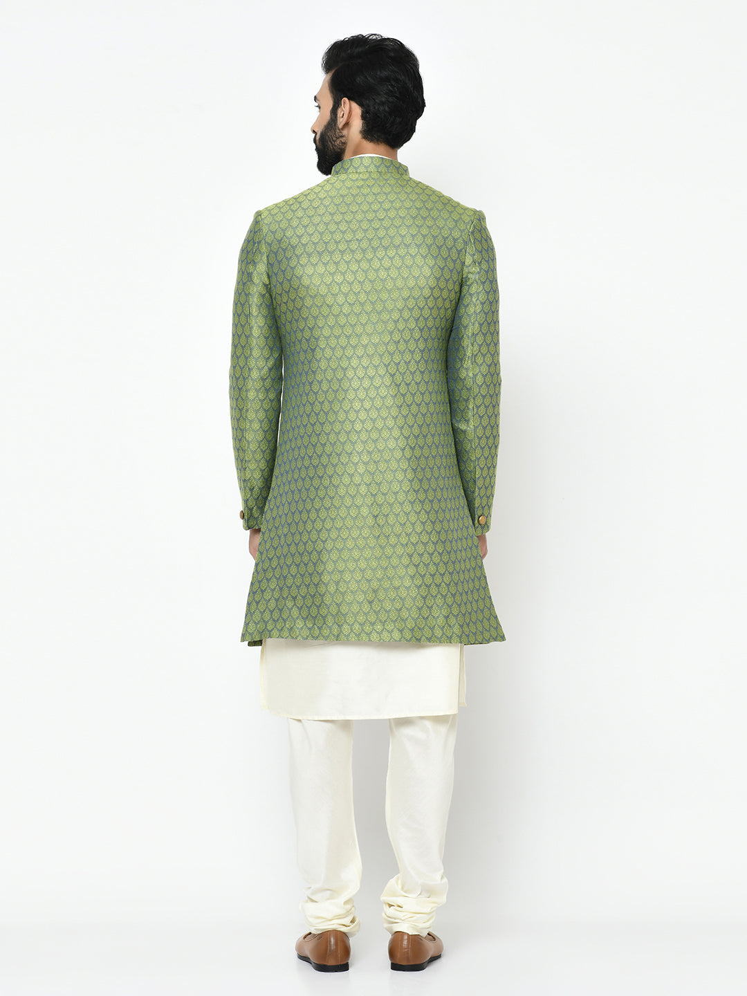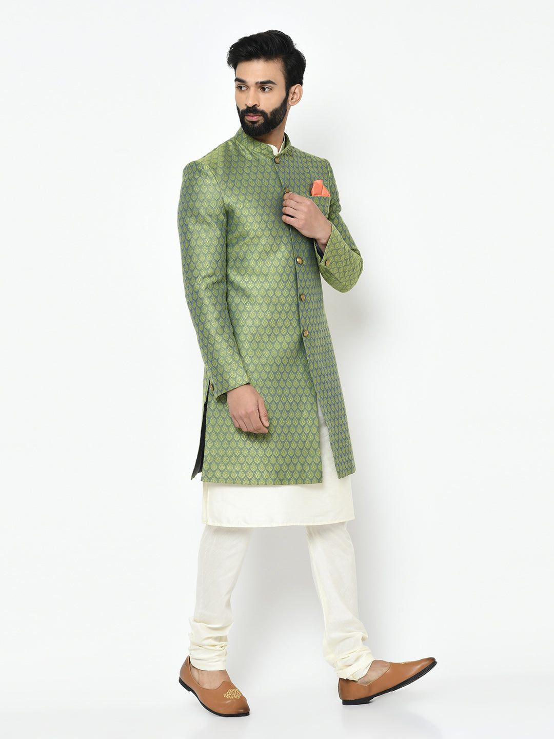 This Indowestern set is an elegant mandarin collar style that is perfect for occasional wear. With a full sleeve design, Green colour and Silk Blend fabric, Which is Jacquard Pattern it will make you look stylish. Featuring a Kurta, Indowestern & Bottomwear, it is perfect for formal occasions.