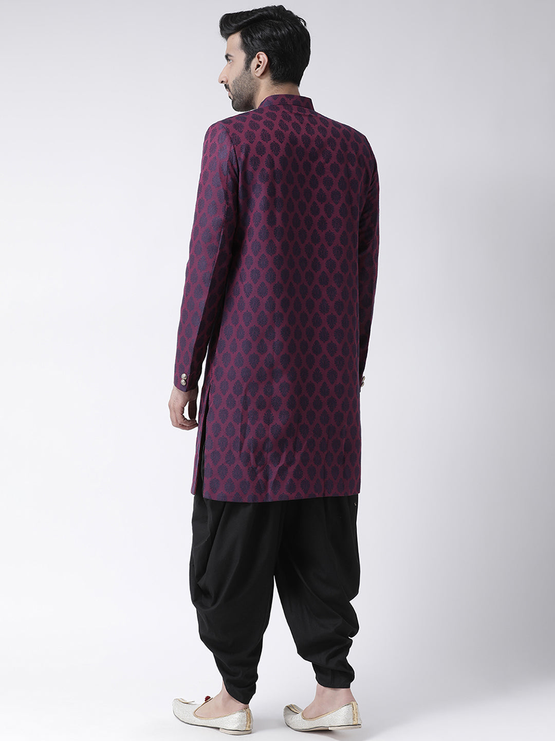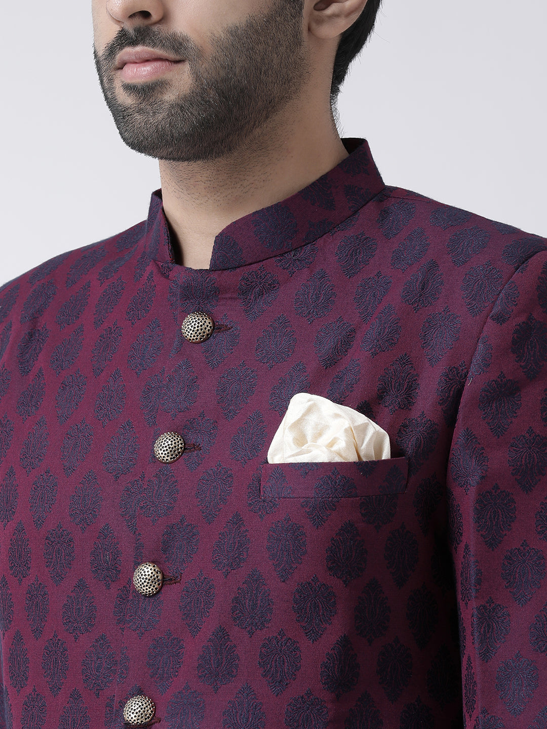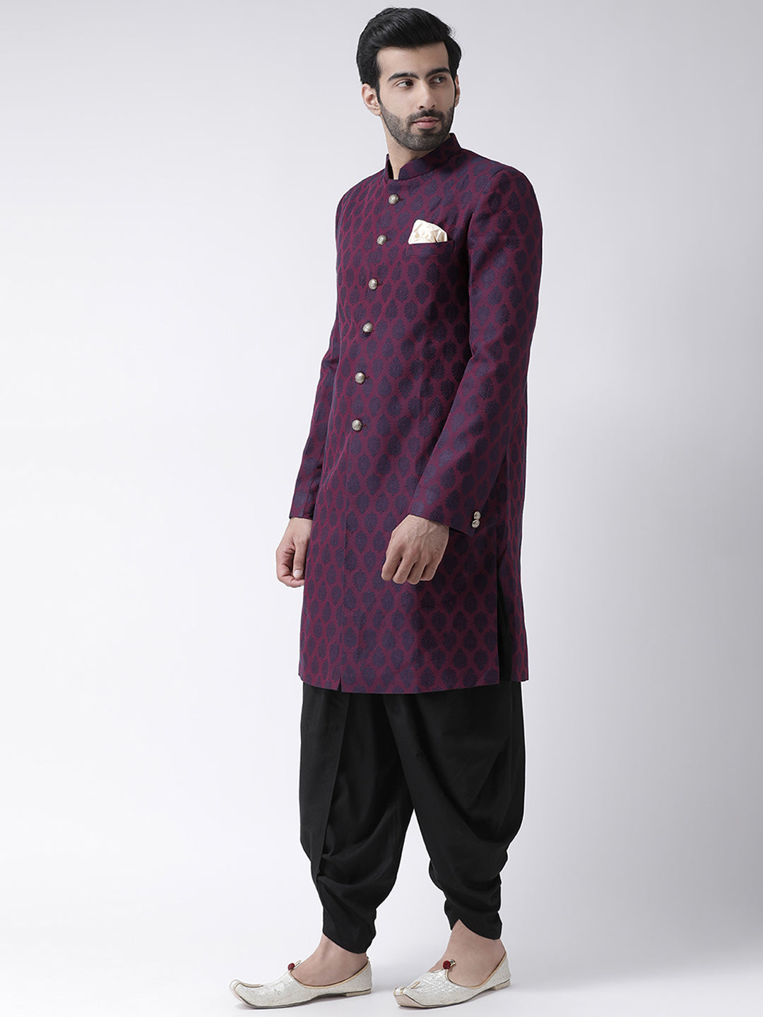 This purple textured indowestern set in a silk blend offers a regal look for weddings and festive occasions. Its regular fit ensures comfort with a luxurious touch.