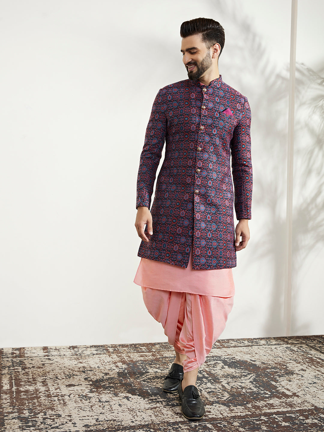 Stand out in this multi-coloured silk blend jacquard kurta, indowestern, and dhoti set. The textured fabric and regular fit offer an exquisite touch for any celebration.