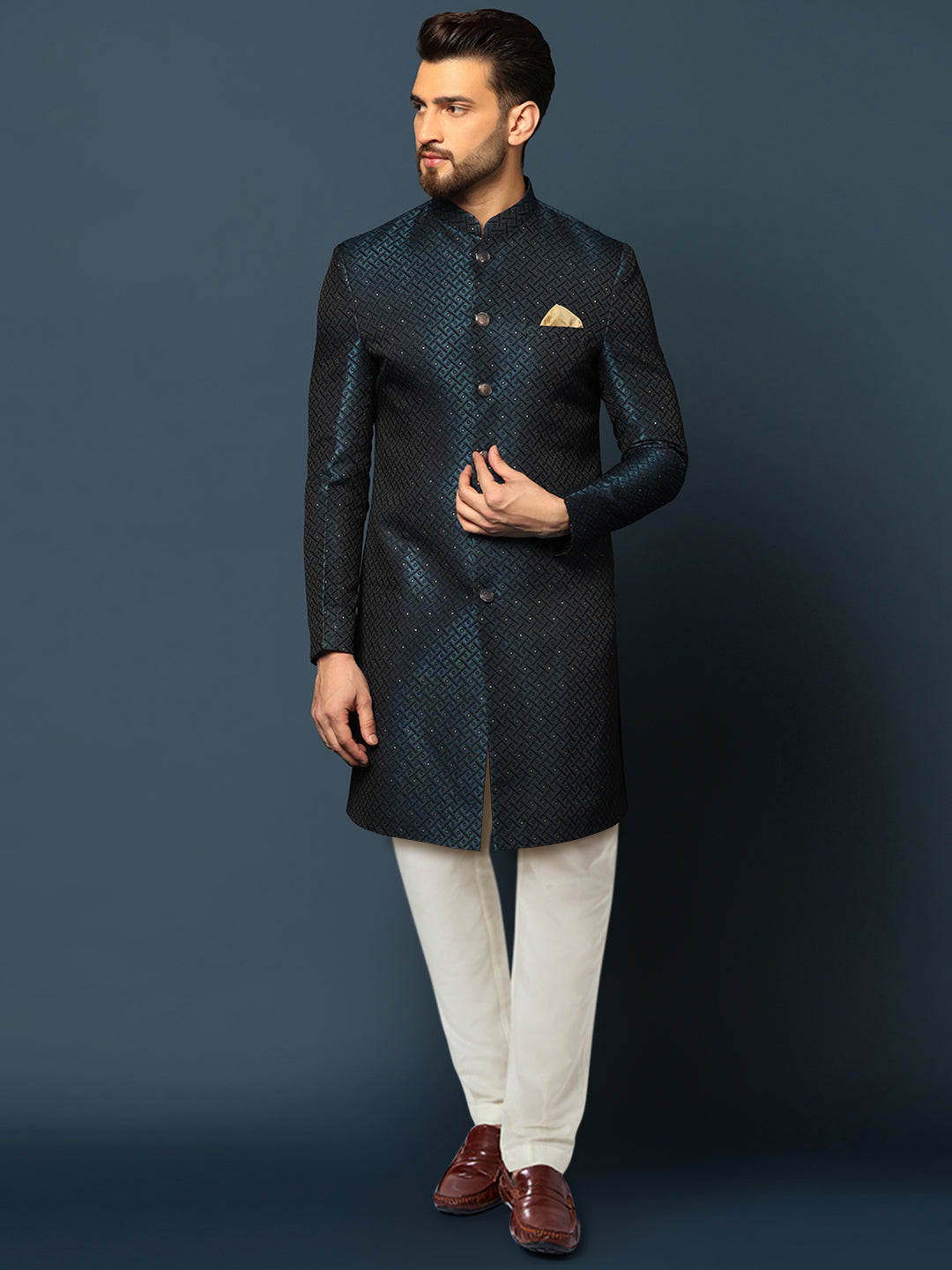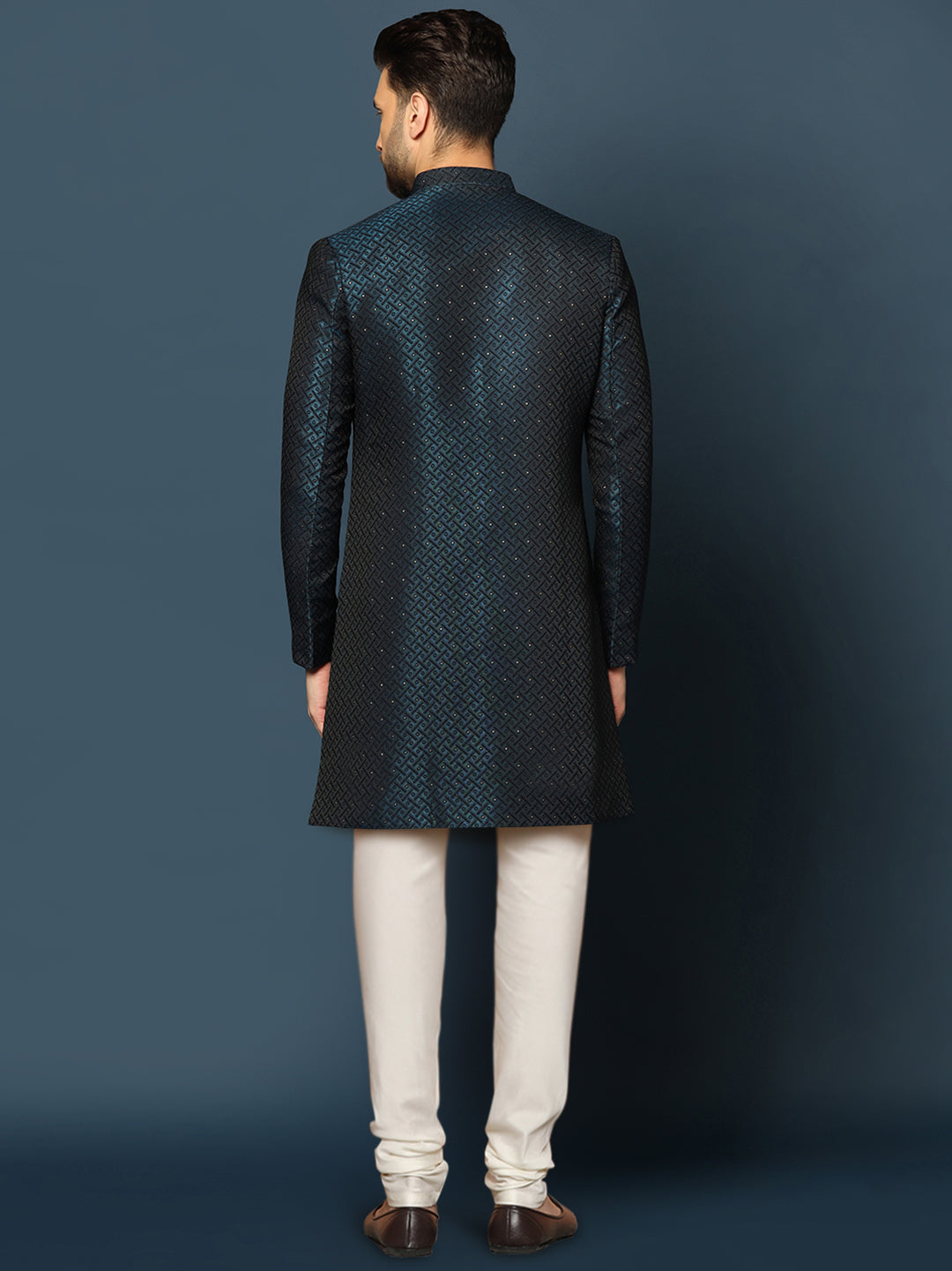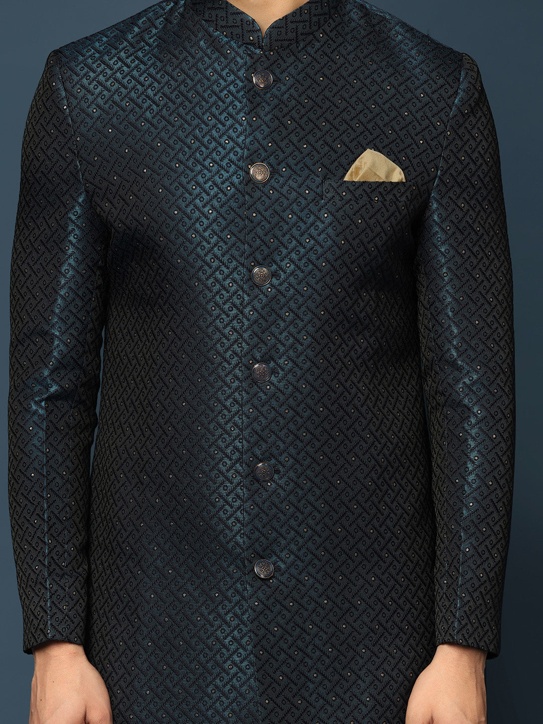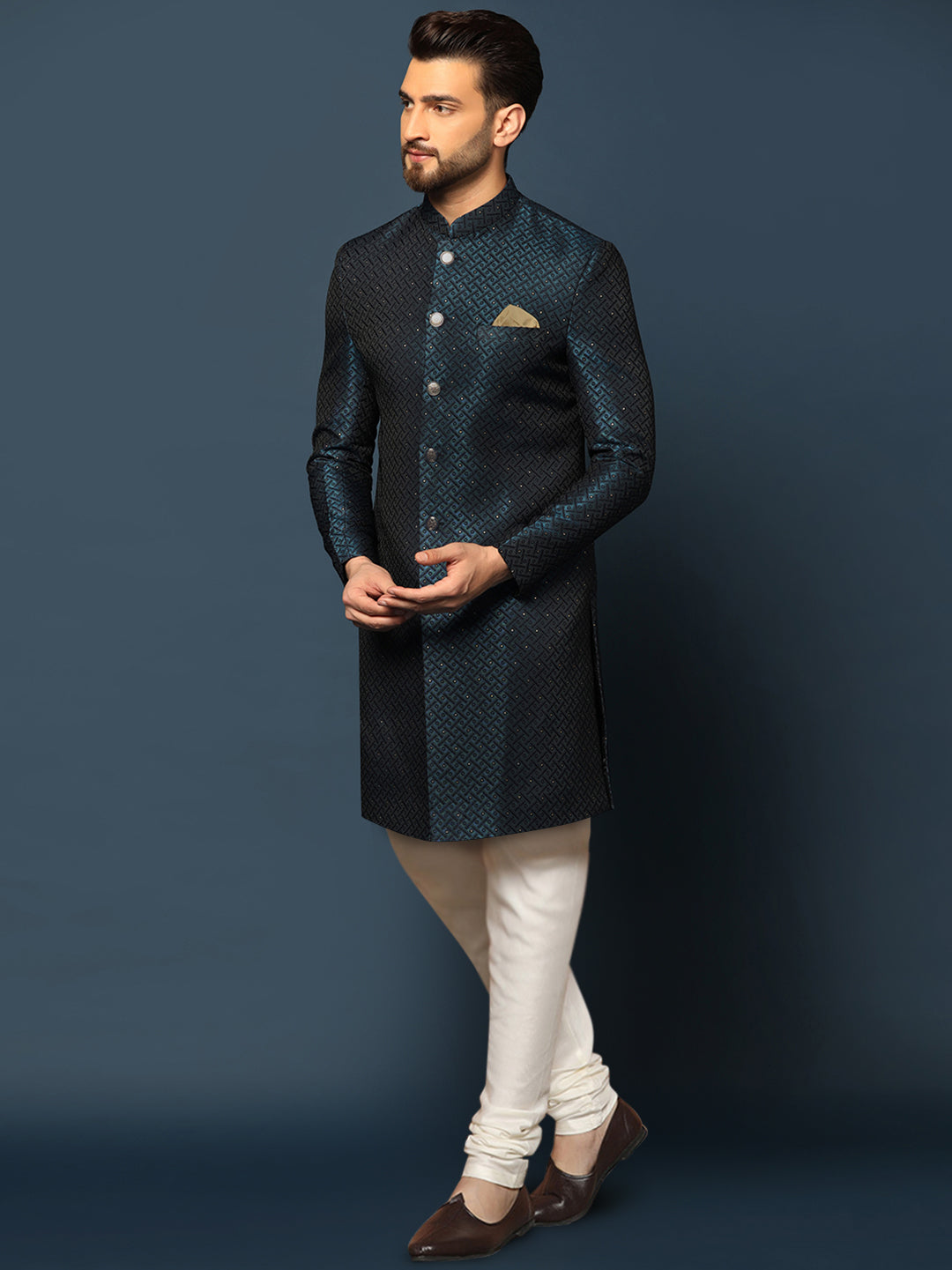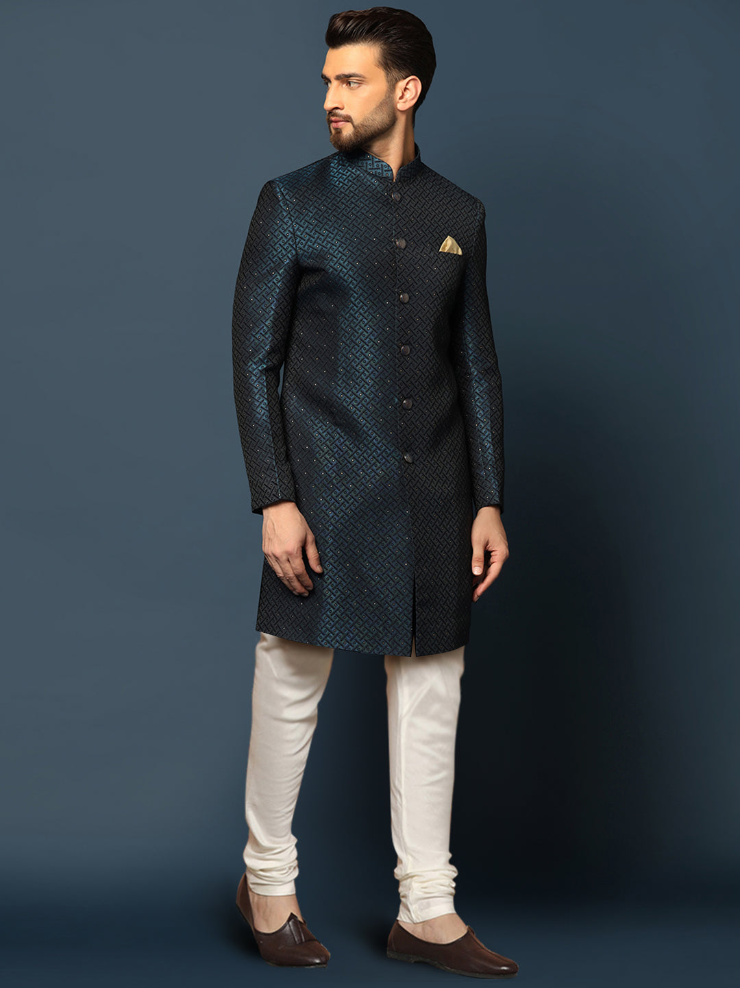 Enhance your traditional style with this navy blue silk blend jacquard Indowestern and churidar set. The embellished fabric and regular fit make it ideal for cultural events.
