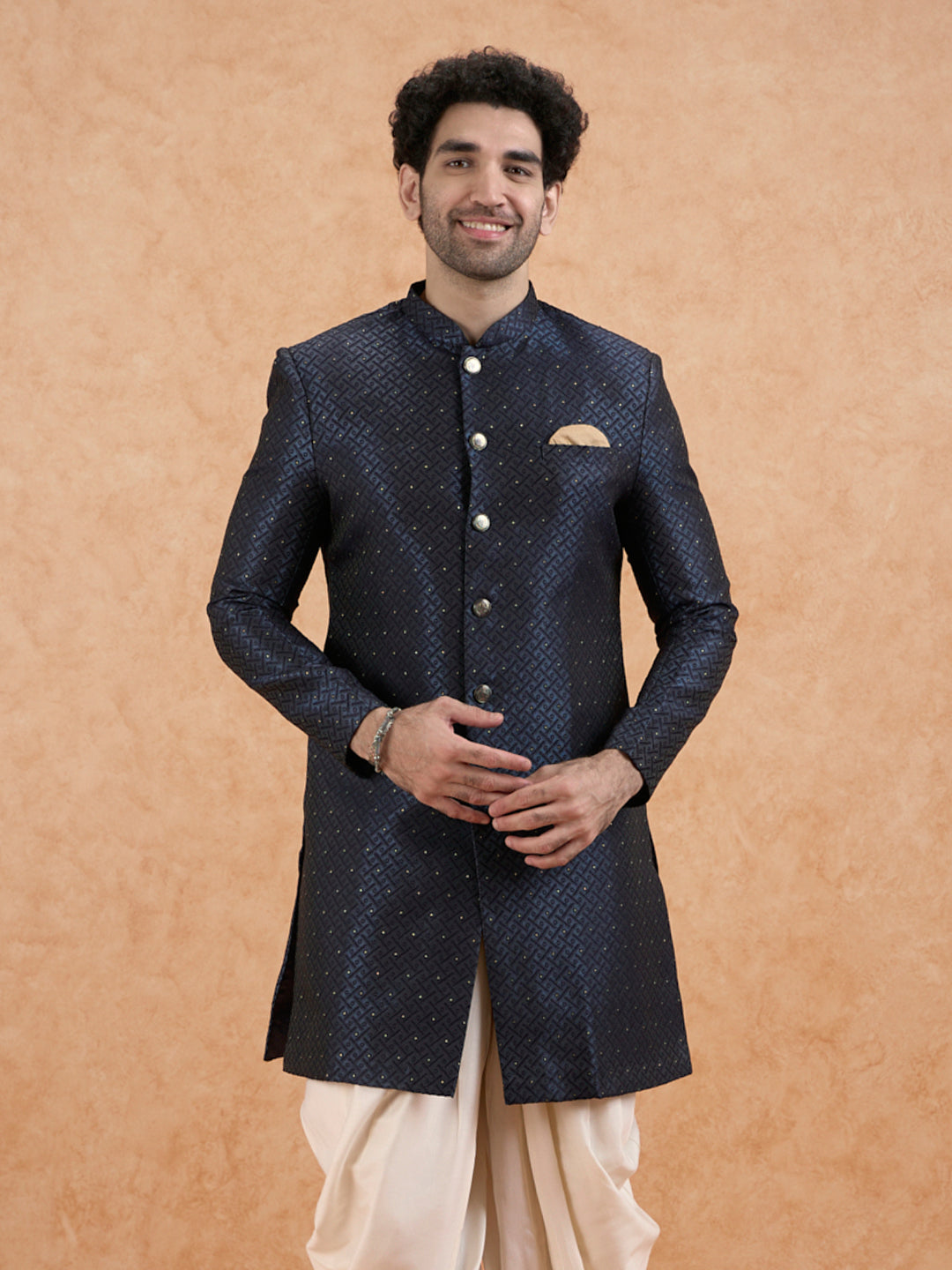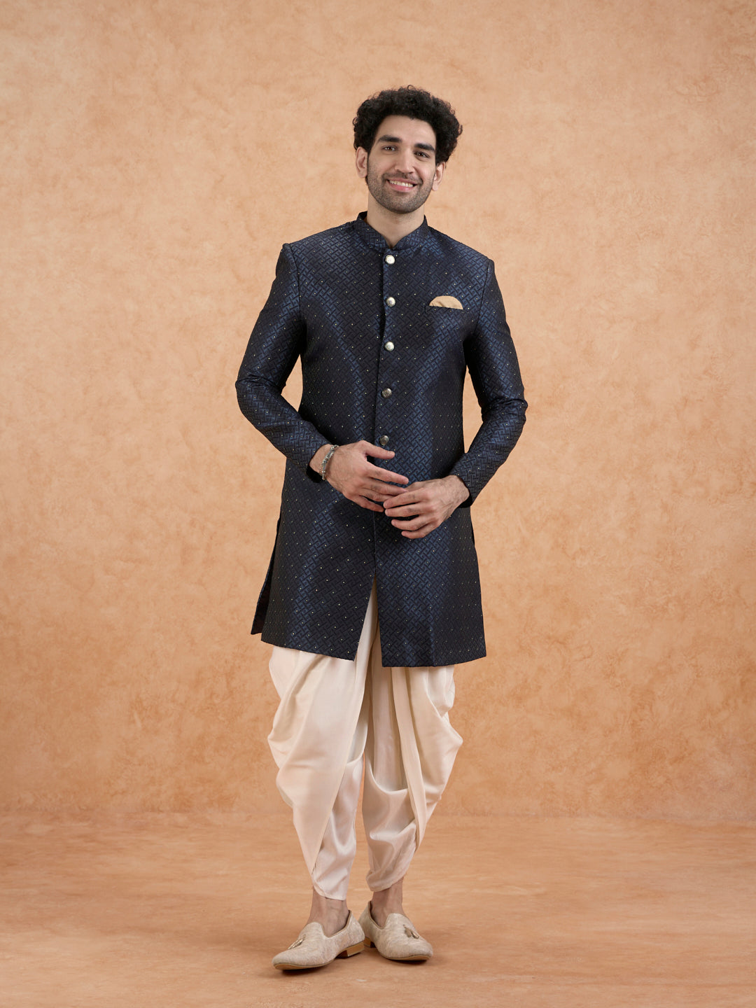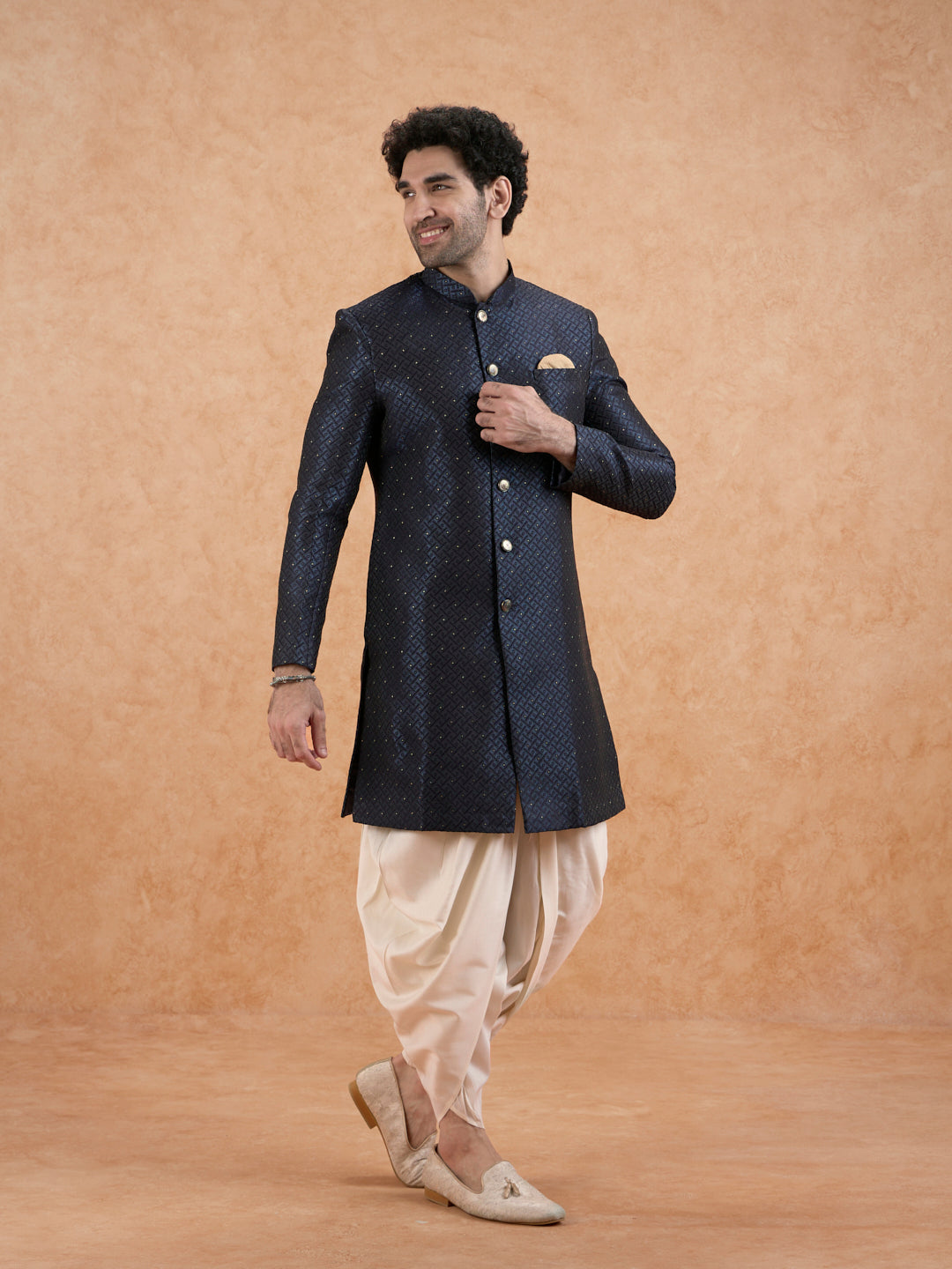 Blue Silk Blend Textured Indowestern Sherwani with Dhoti