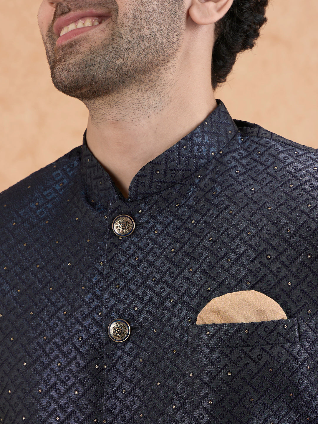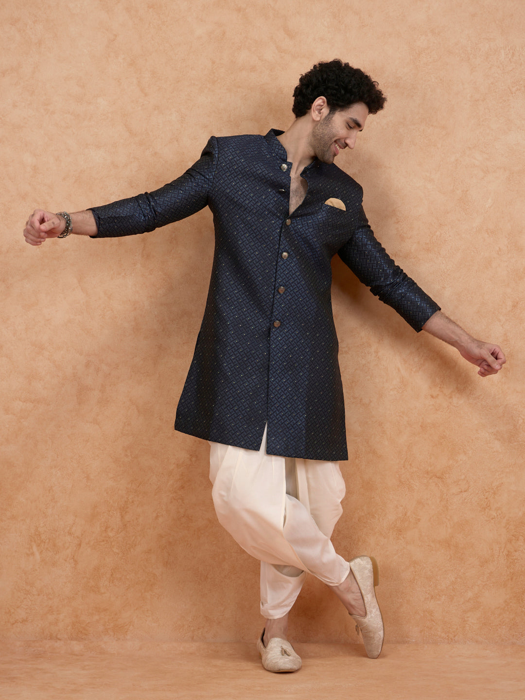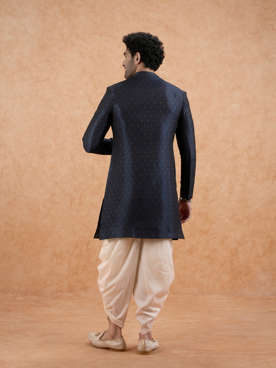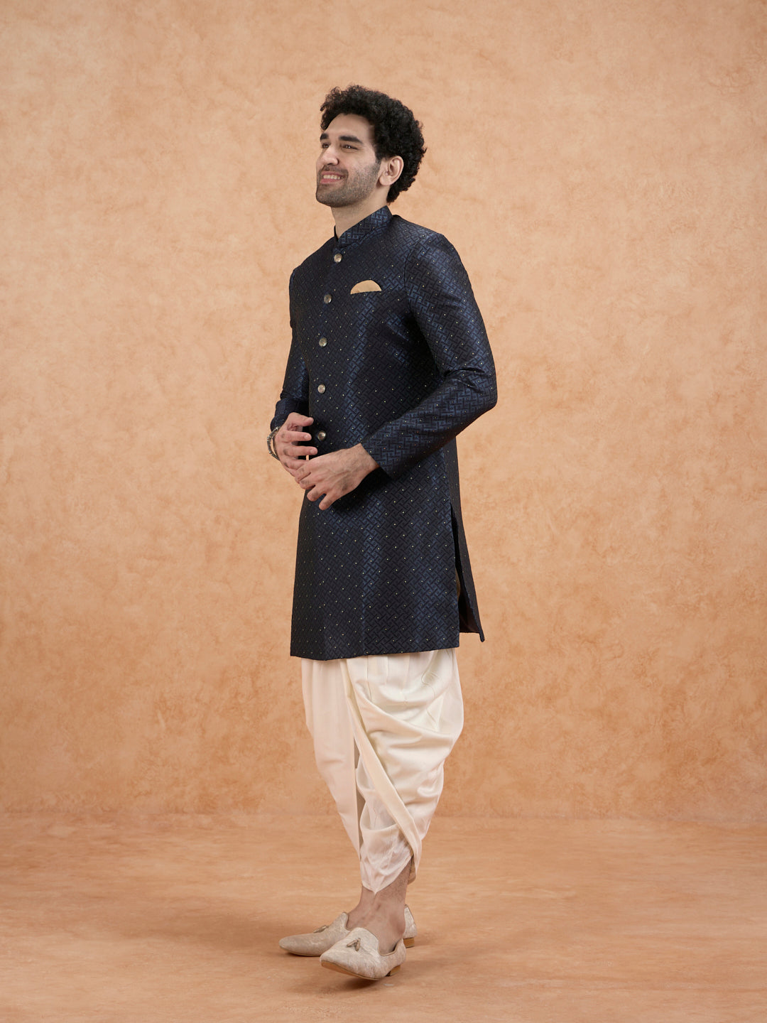 Blue Silk Blend Textured Indowestern Sherwani with Dhoti