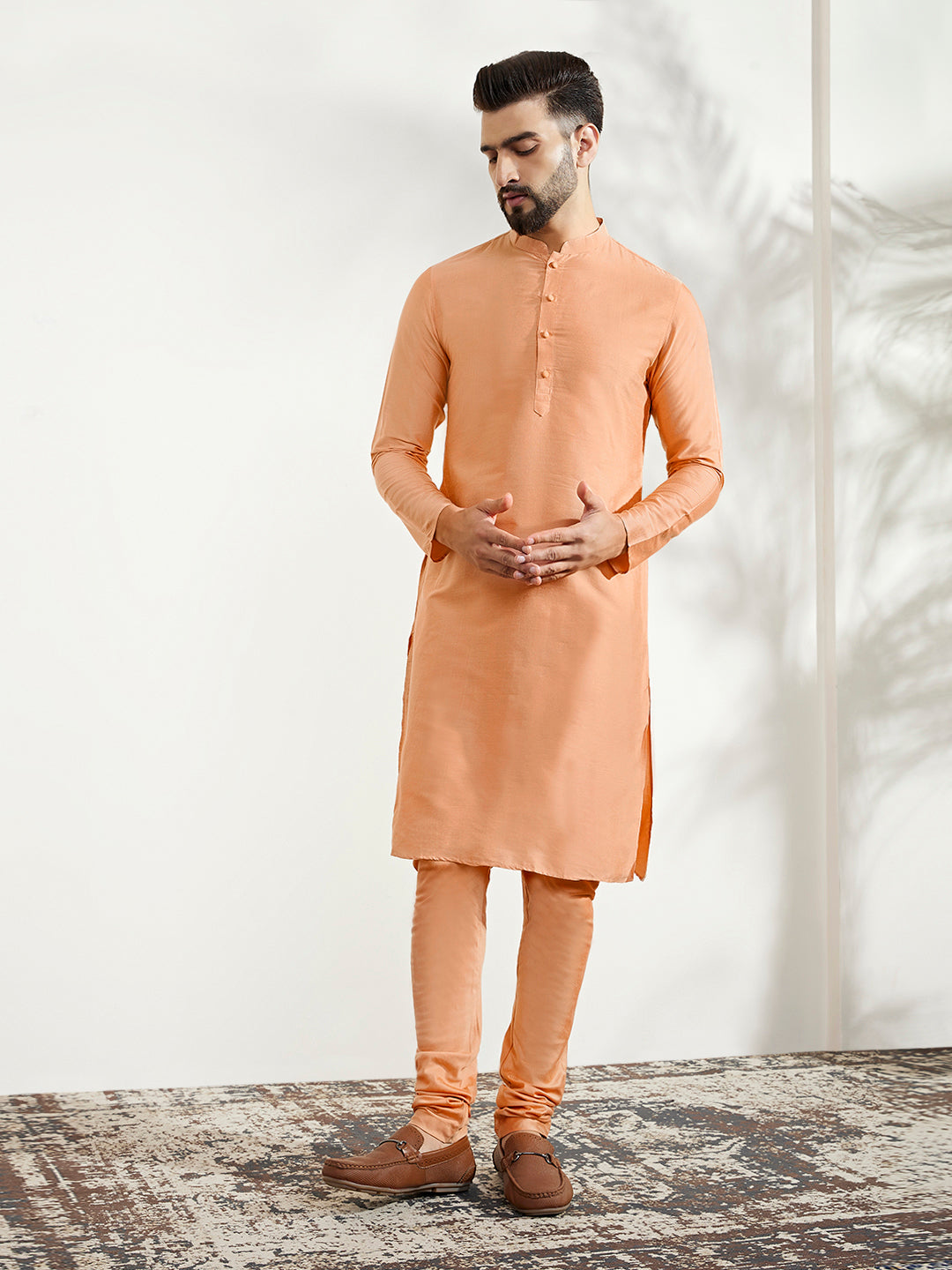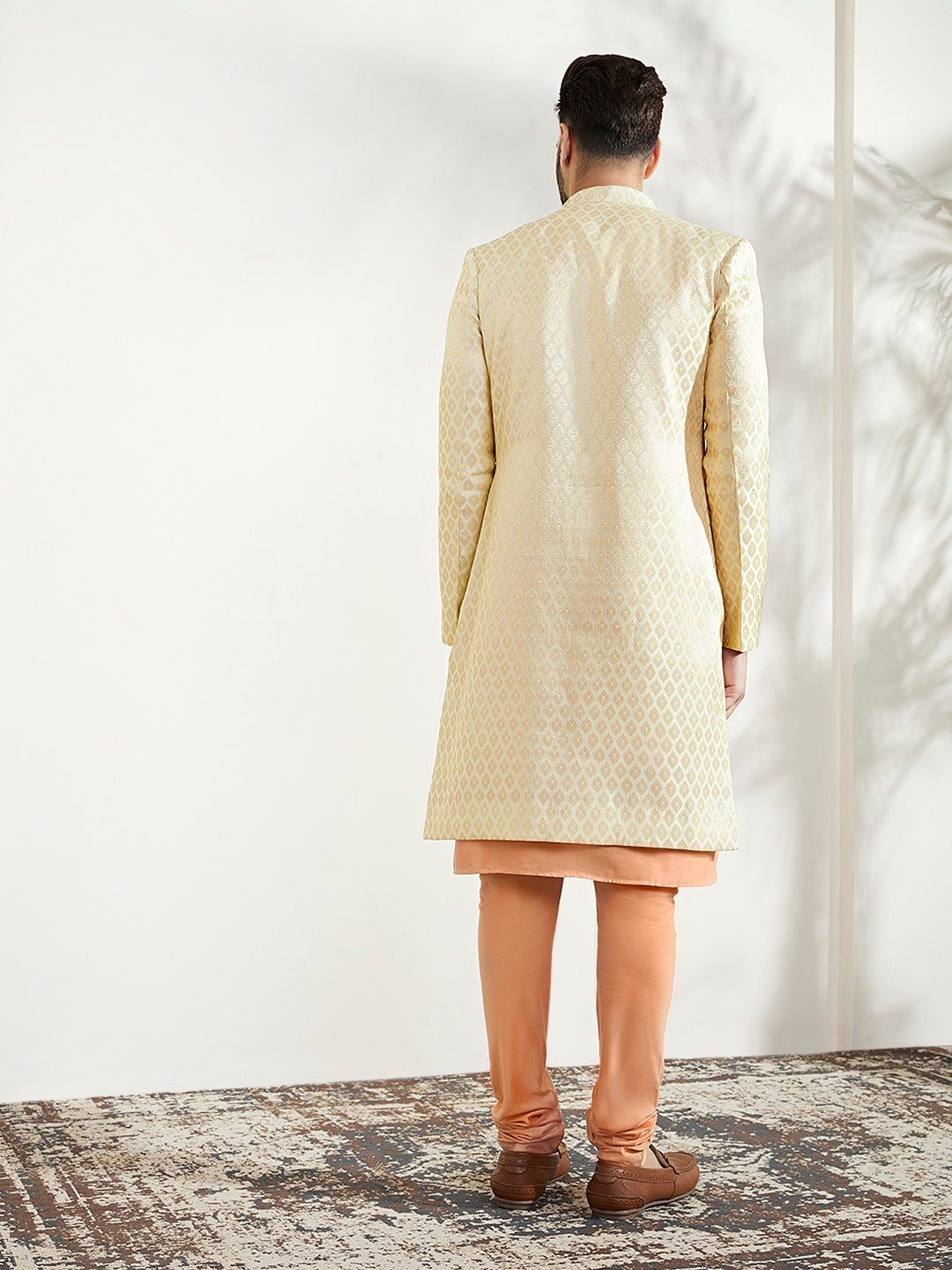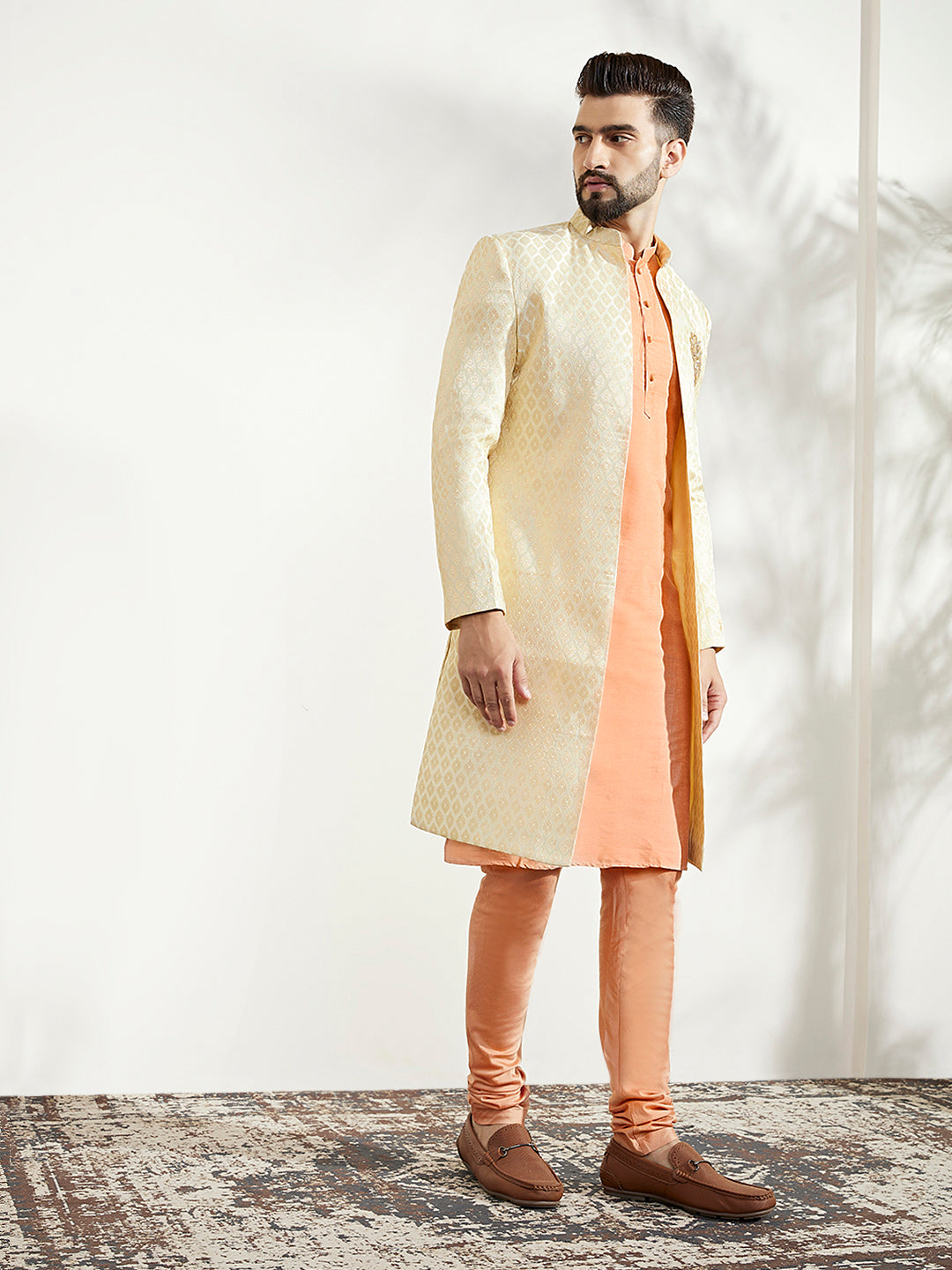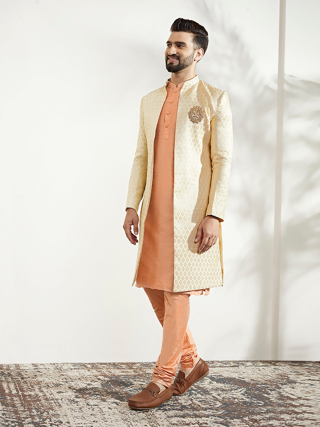 This Indowestern set is an elegant mandarin collar style that is perfect for occasional wear. With a full sleeve design, Off White colour and Silk Blend fabric, it will make you look stylish. Featuring a Kurta, Indowestern & Bottomwear, it is perfect for formal occasions.