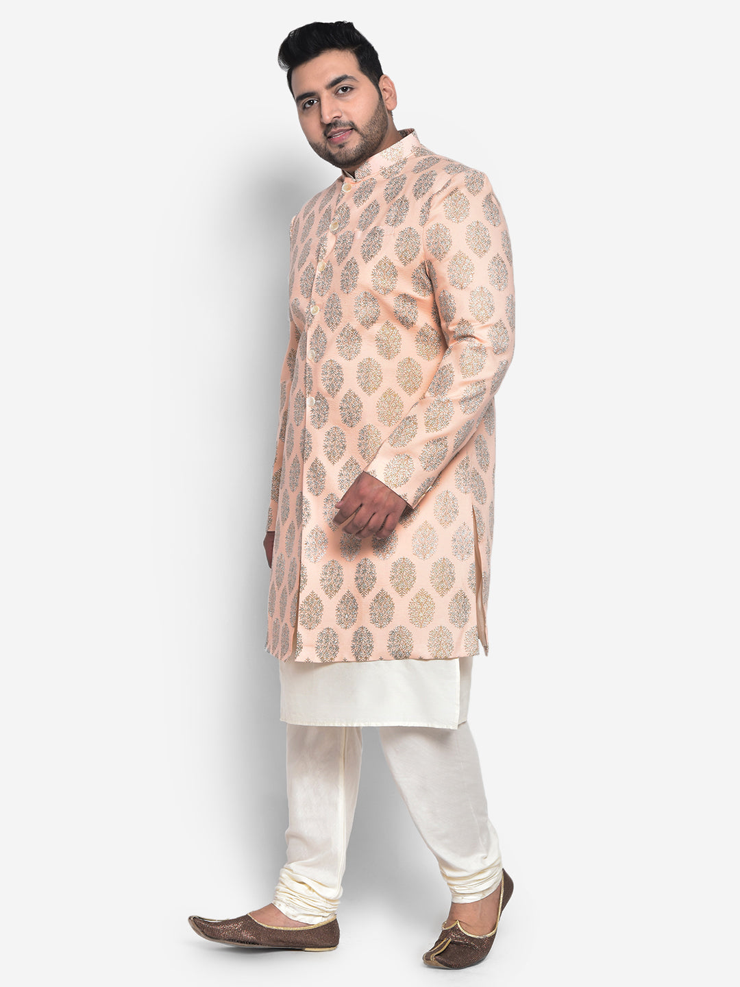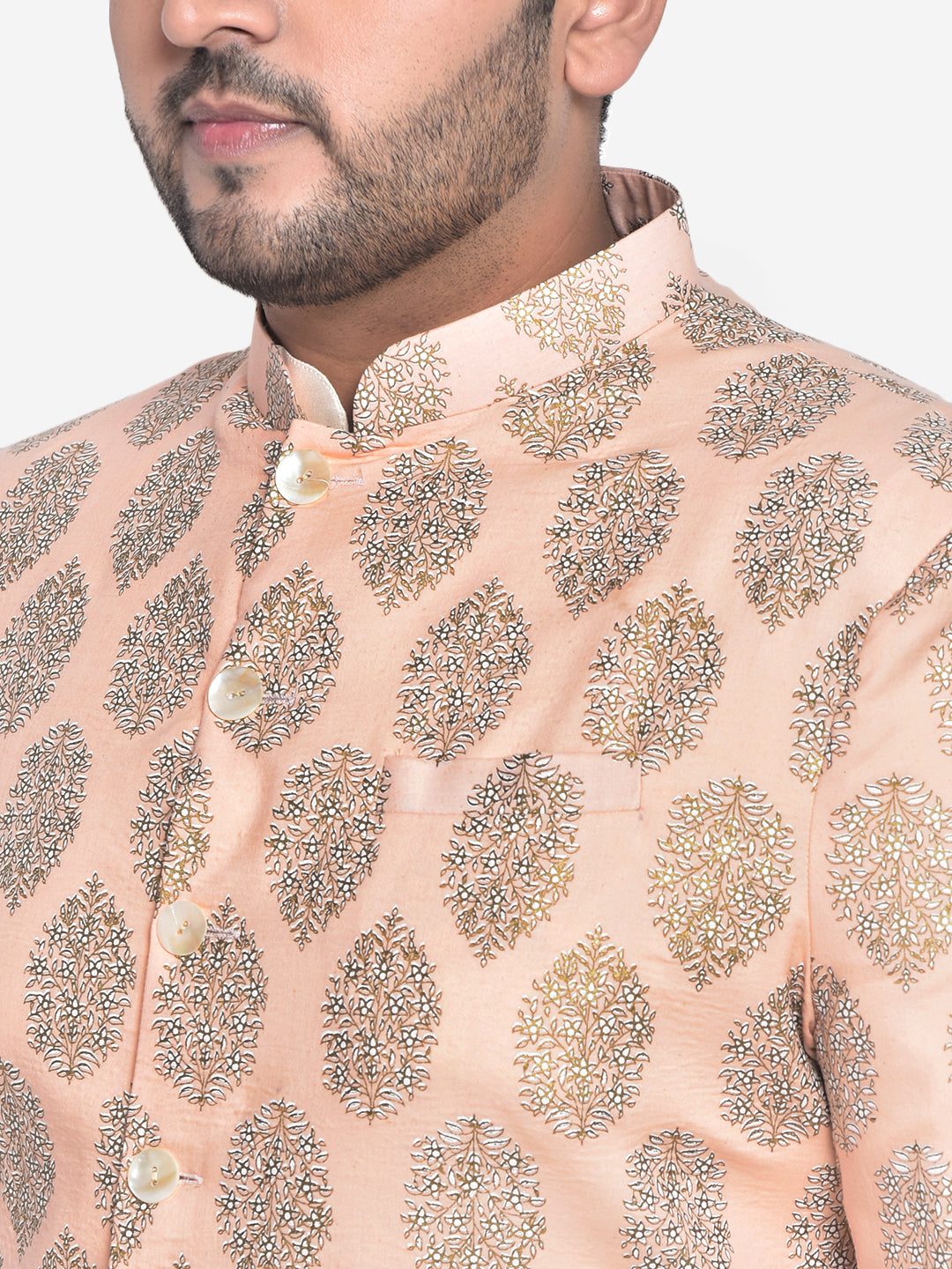 This Indowestern set is an elegant mandarin collar style that is perfect for occasional wear. With a full sleeve design, Peach colour and Pure Cotton fabric, Which is Printed Pattern it will make you look stylish. Featuring a Kurta, Indowestern & Bottomwear, it is perfect for formal occasions.
