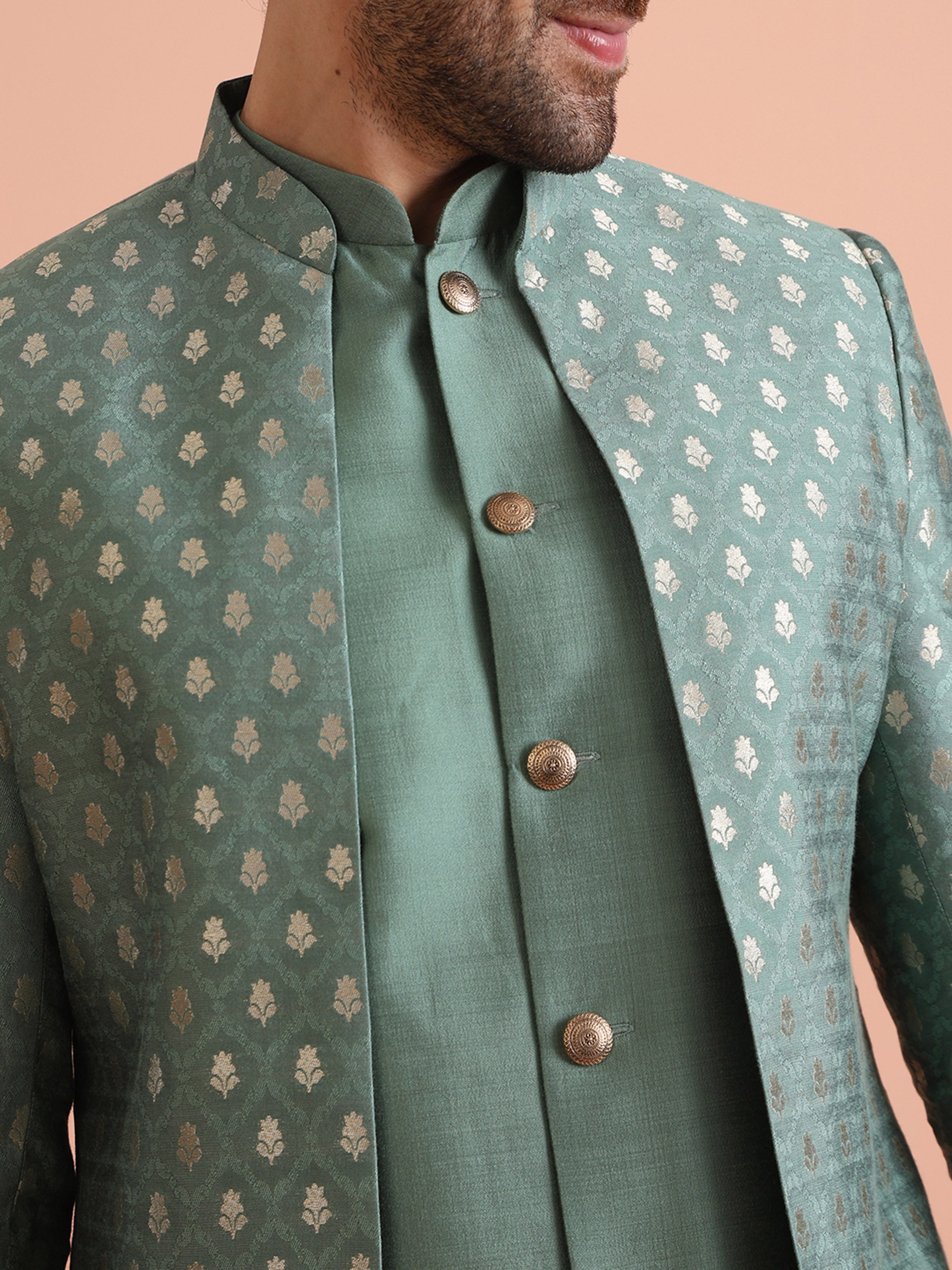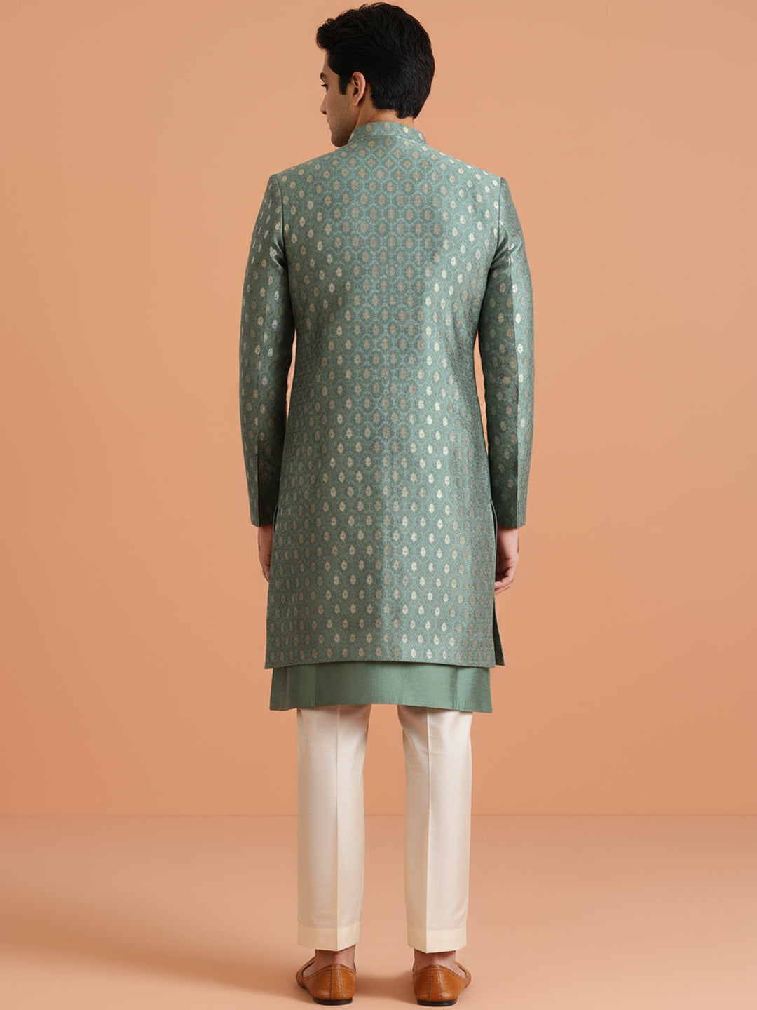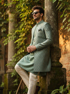 Mint green brocade front-open sherwani with ivory wide-leg trouser — perfect for weddings, engagements, and festive celebrations.