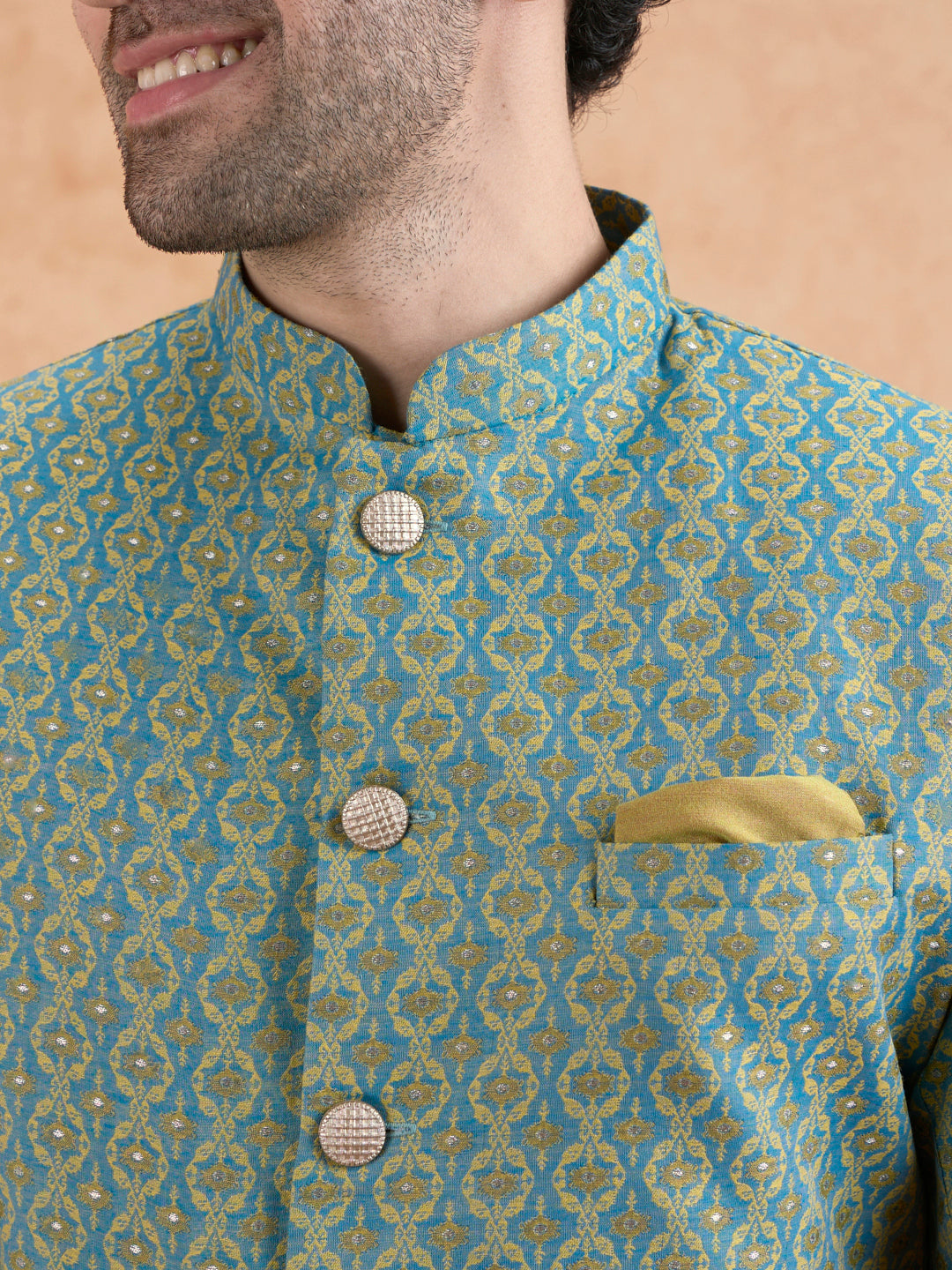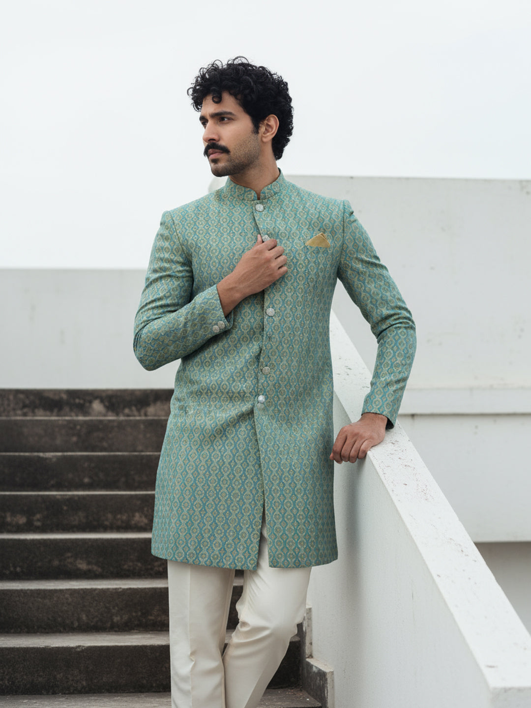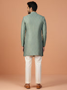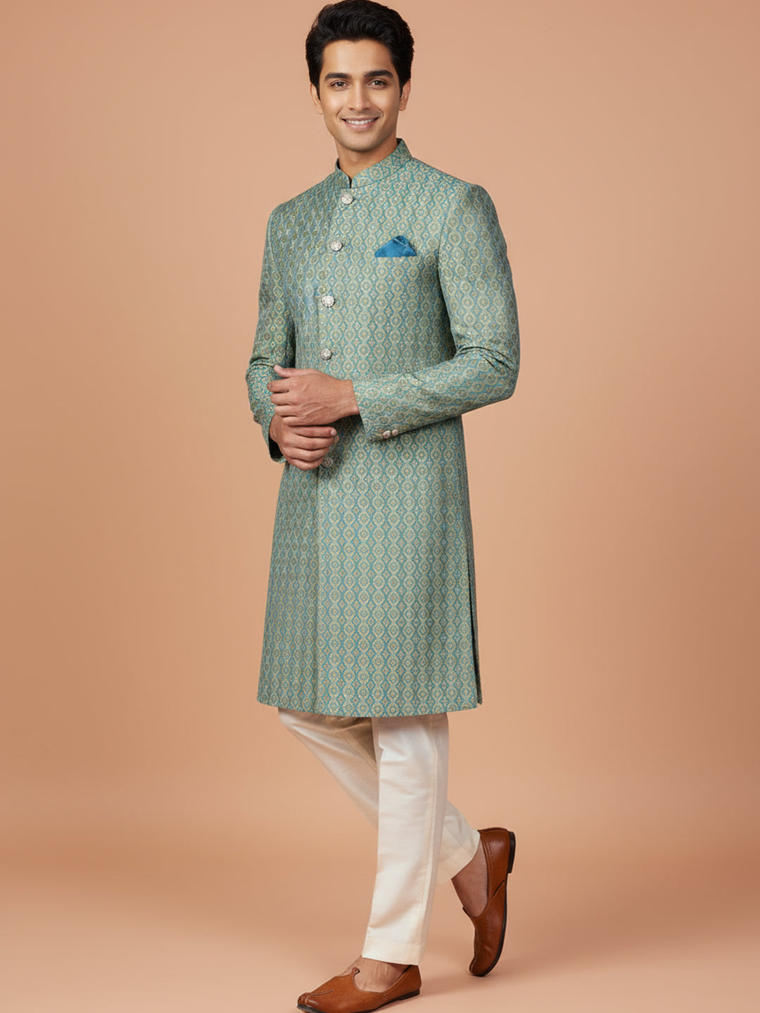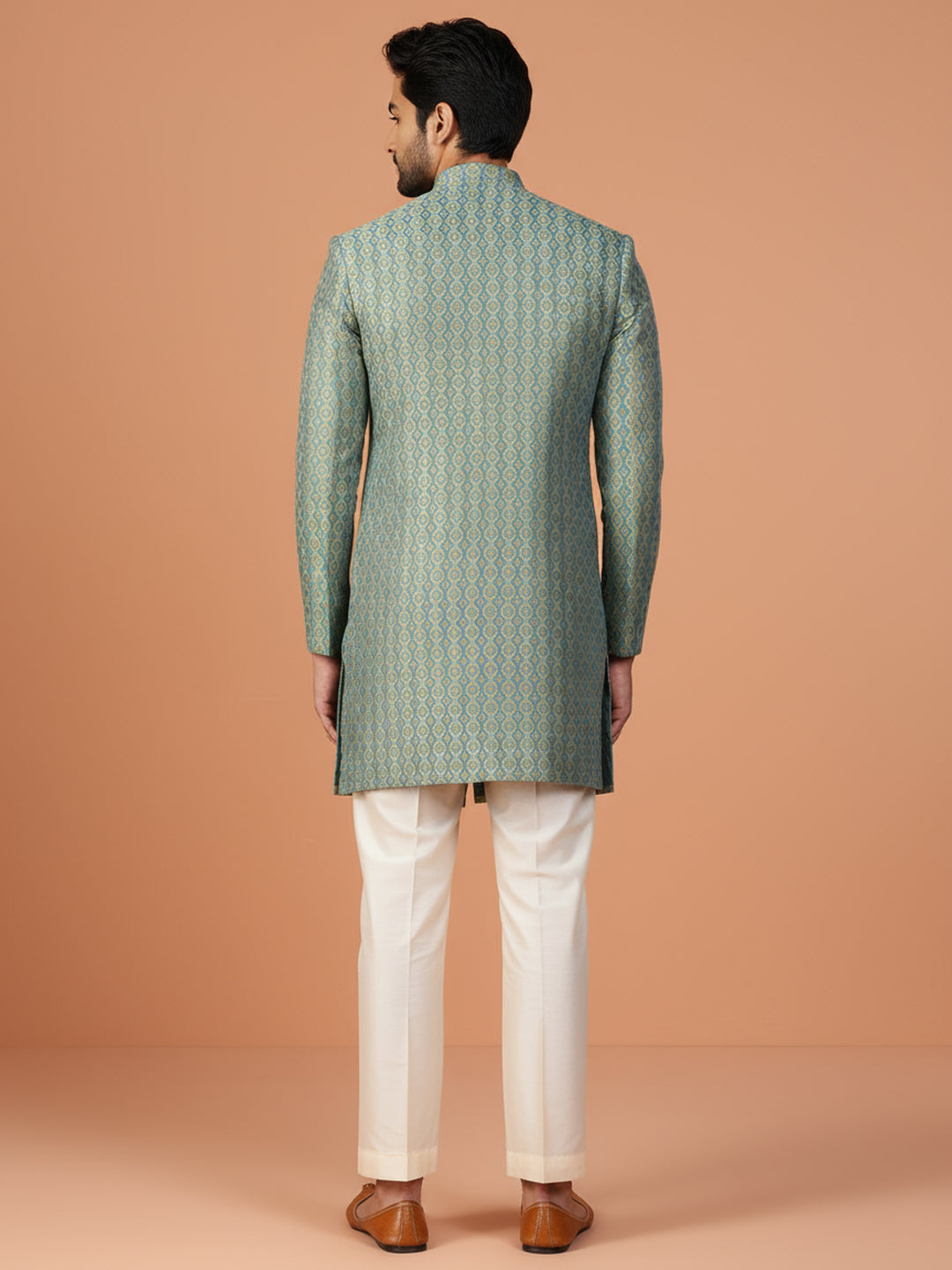 Mint green jacquard sherwani with ivory wide-leg trouser — a refreshing and regal ensemble perfect for weddings and festive occasions.