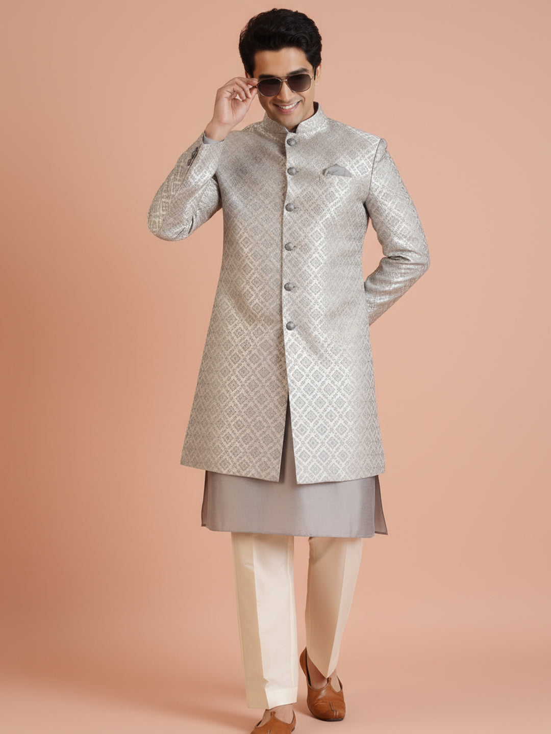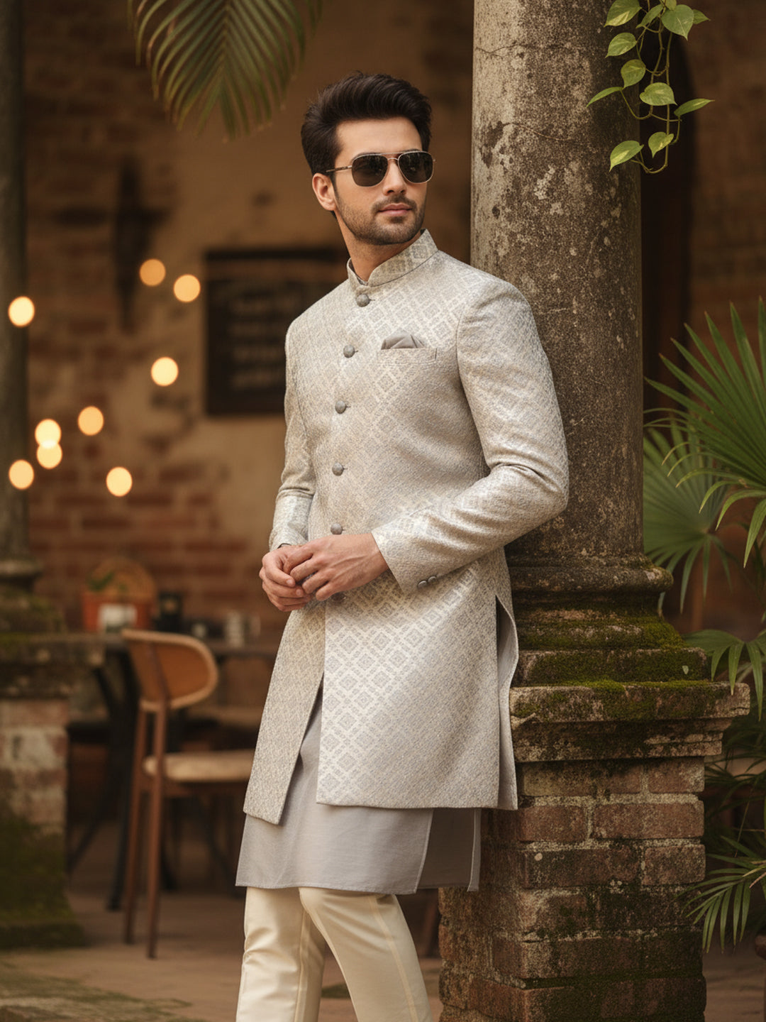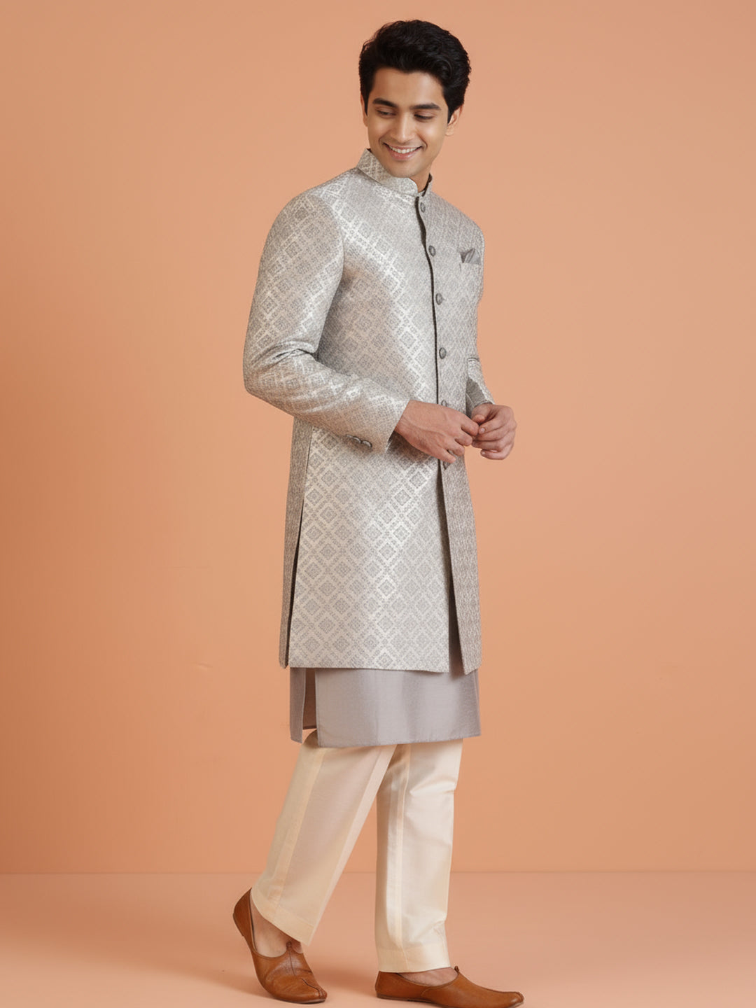 Silver brocade sherwani with grey kurta and ivory wide-leg trouser — elegant and royal ensemble for weddings and festive occasions.