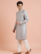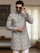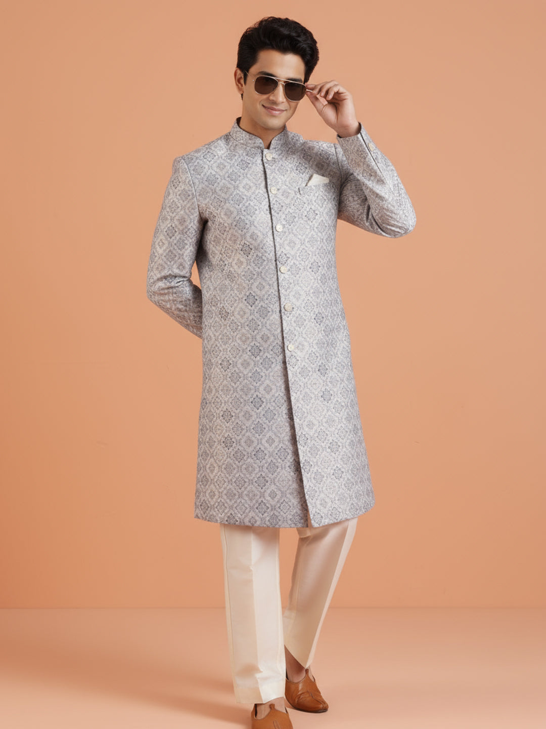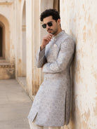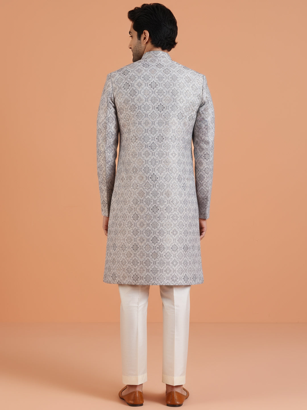 Silver jacquard sherwani with ivory wide-leg trouser — a refined and elegant outfit for weddings, receptions, and festive celebrations.