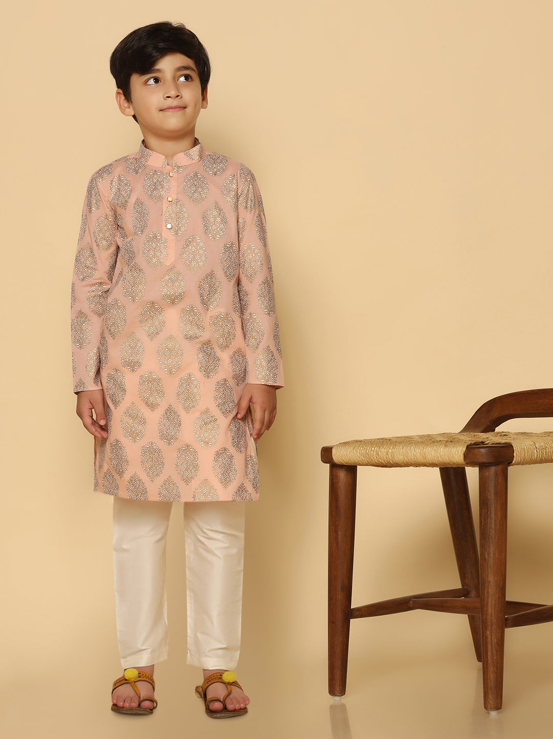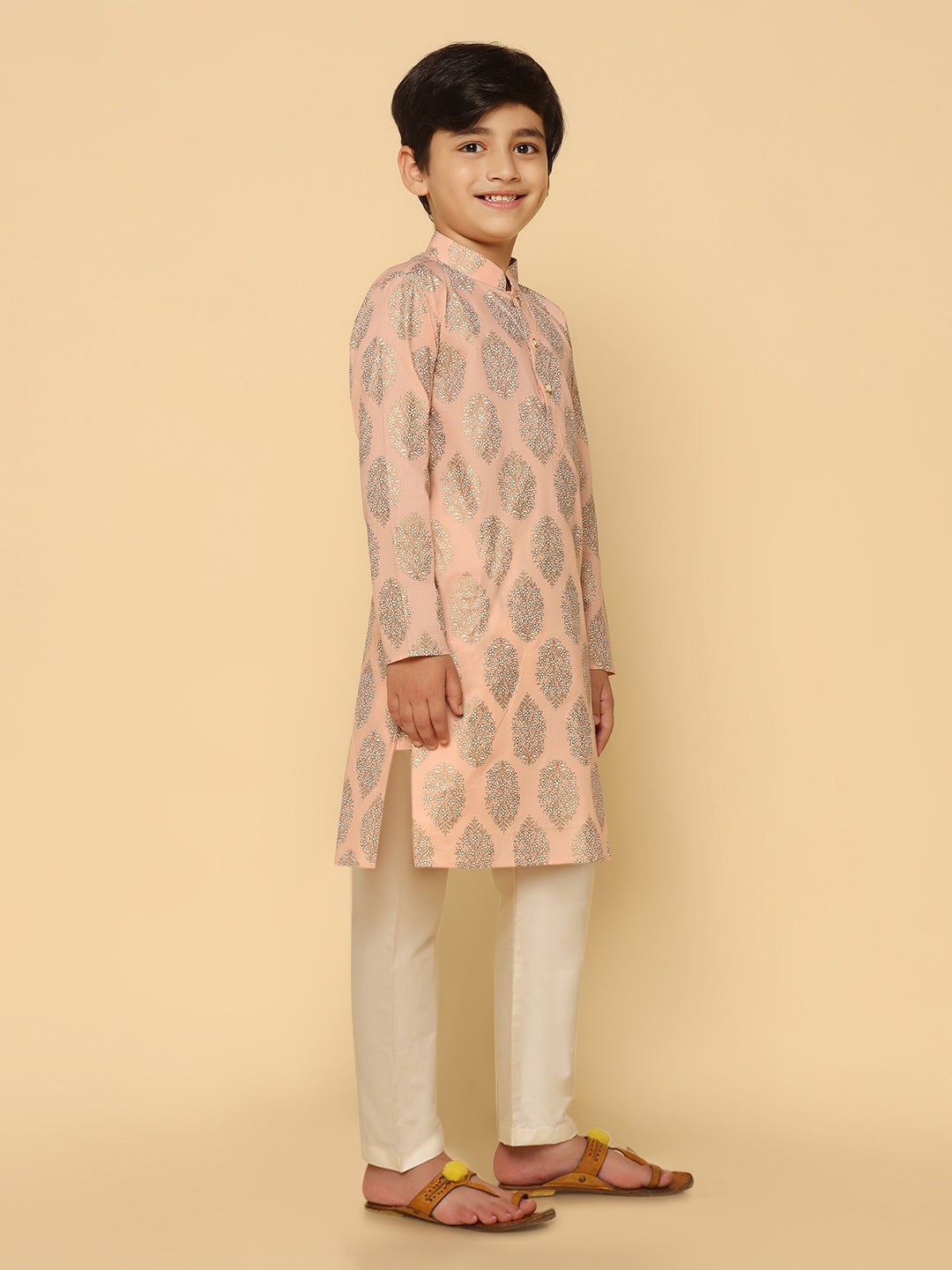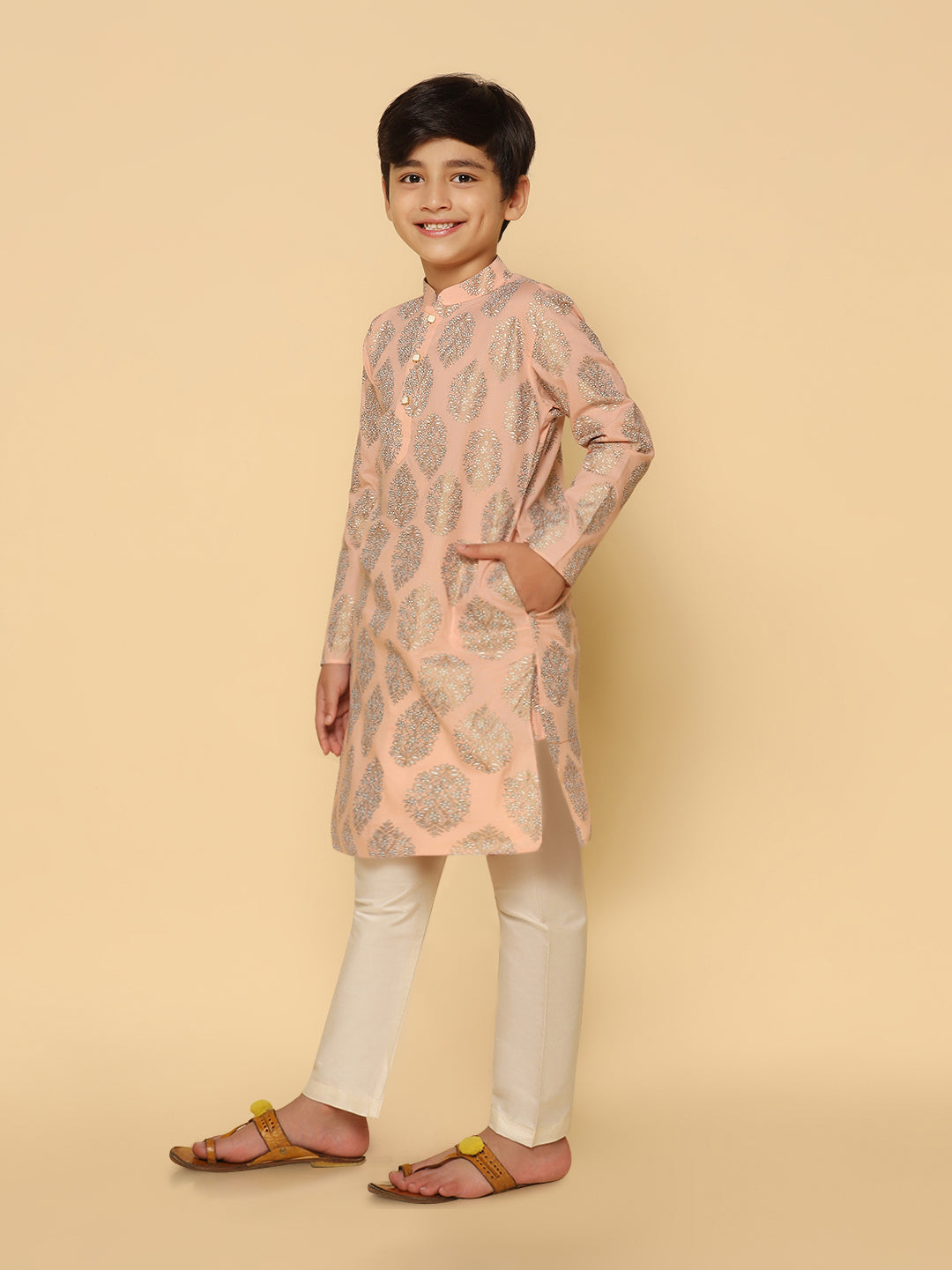 Brighten up your ethnic wardrobe with this pink printed cotton blend kurta. Designed in a regular fit for ease and comfort.