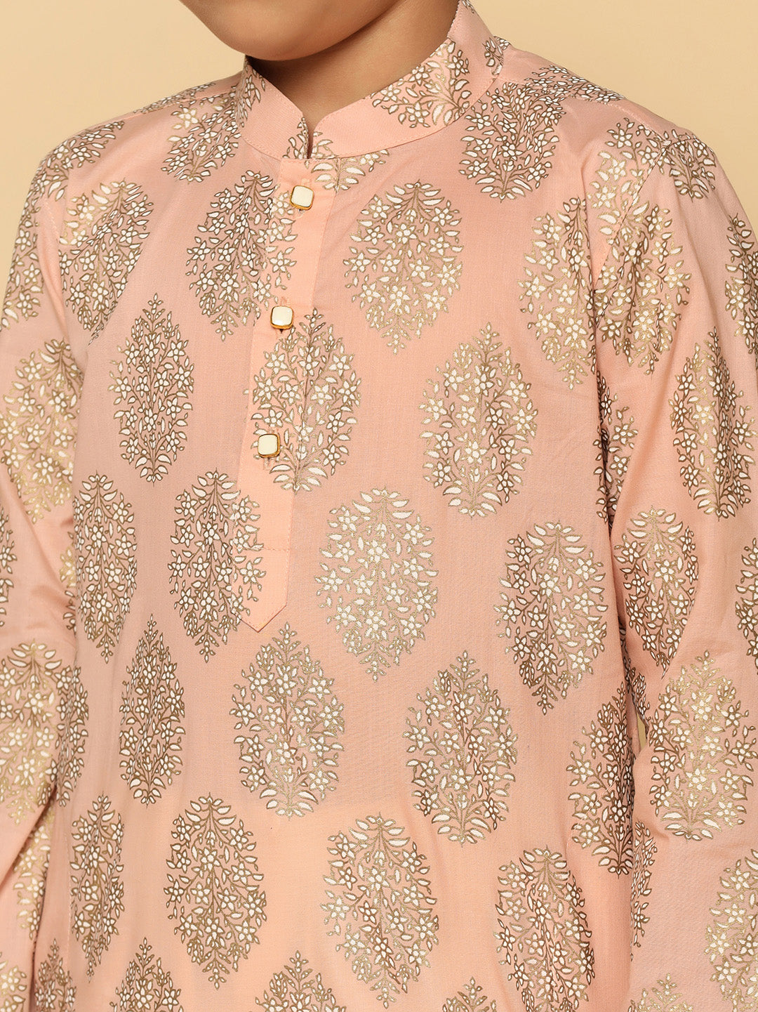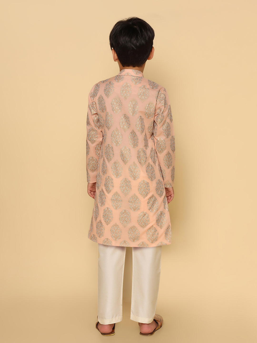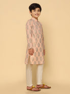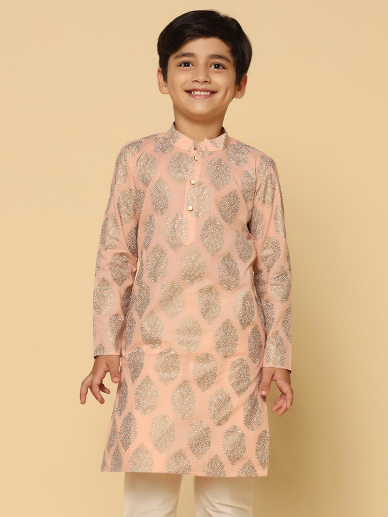 Brighten up your ethnic wardrobe with this pink printed cotton blend kurta. Designed in a regular fit for ease and comfort.
