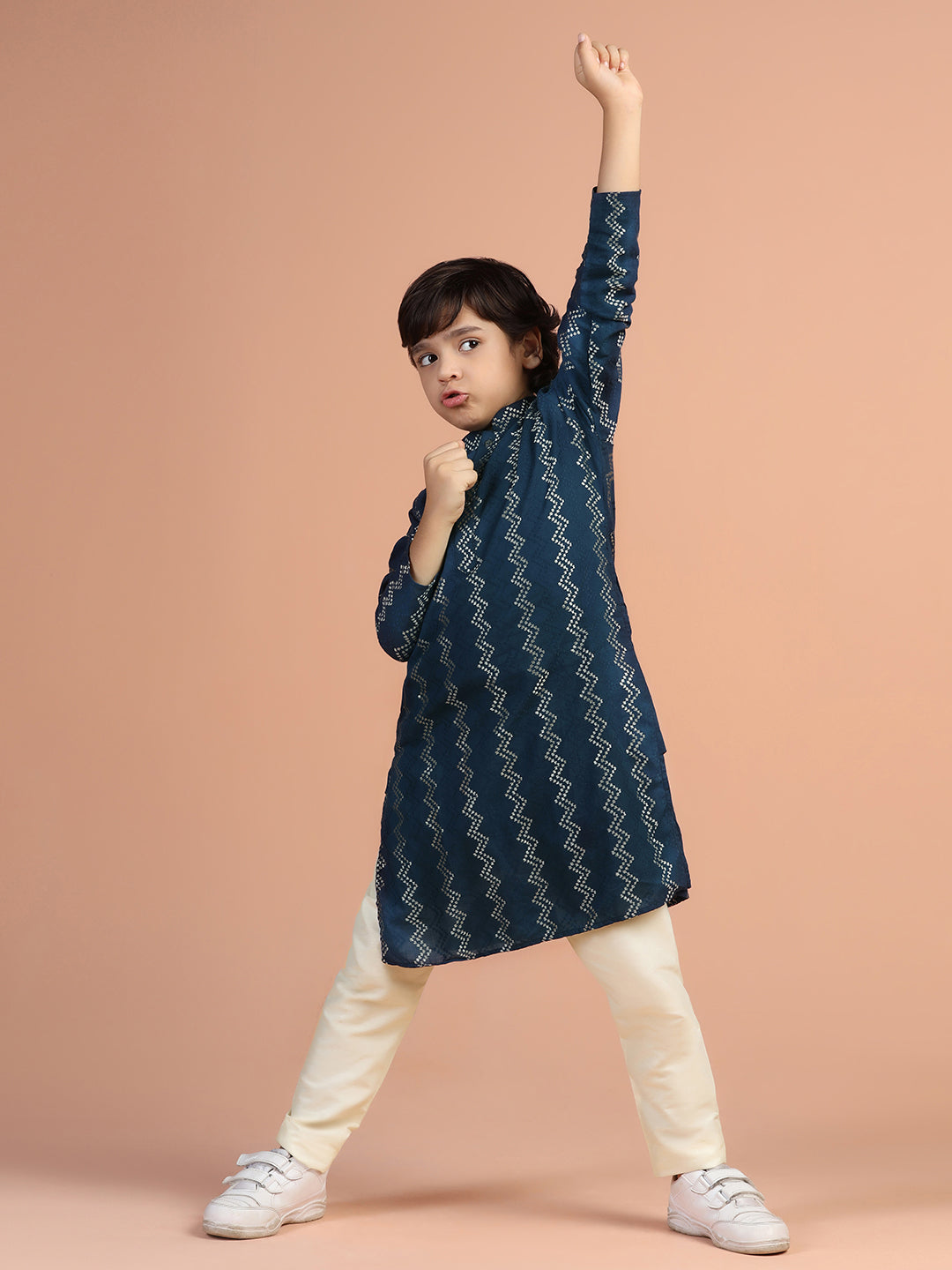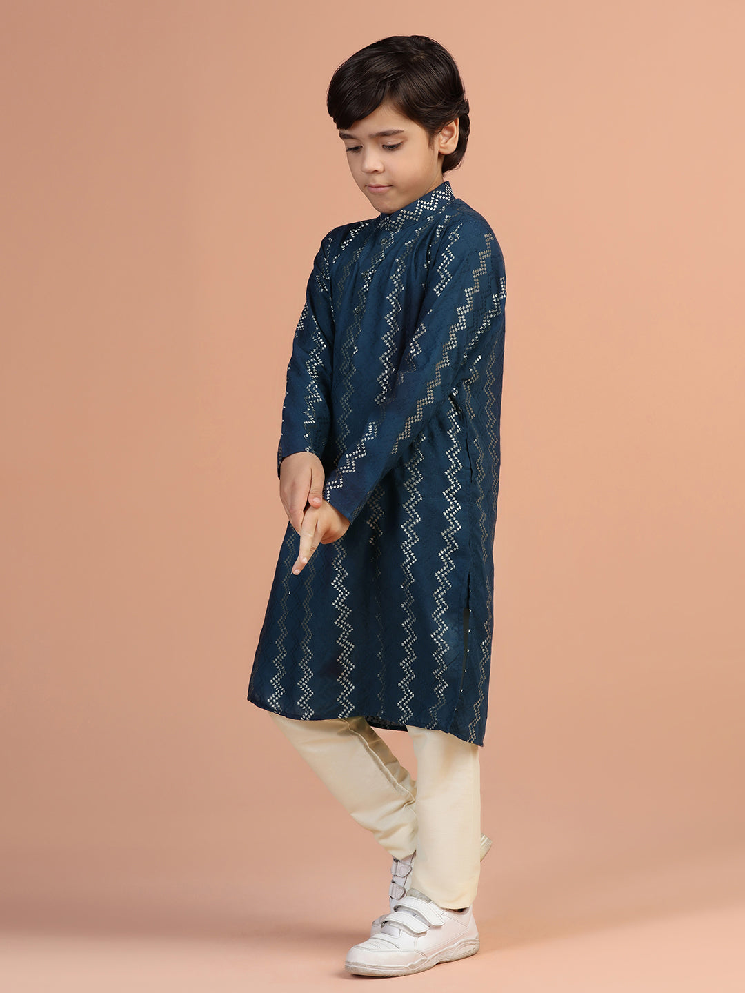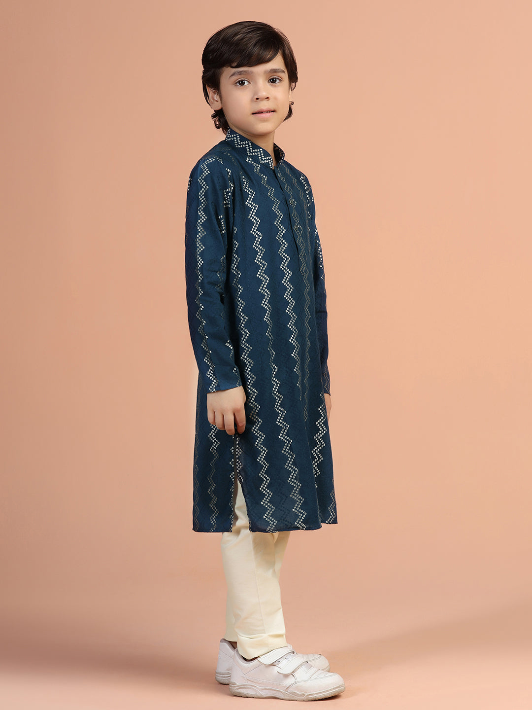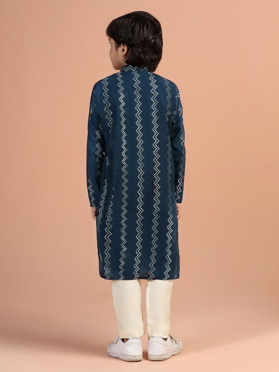 Elevate your wardrobe with this navy blue textured cotton blend kurta. The regular fit ensures comfort for any occasion.