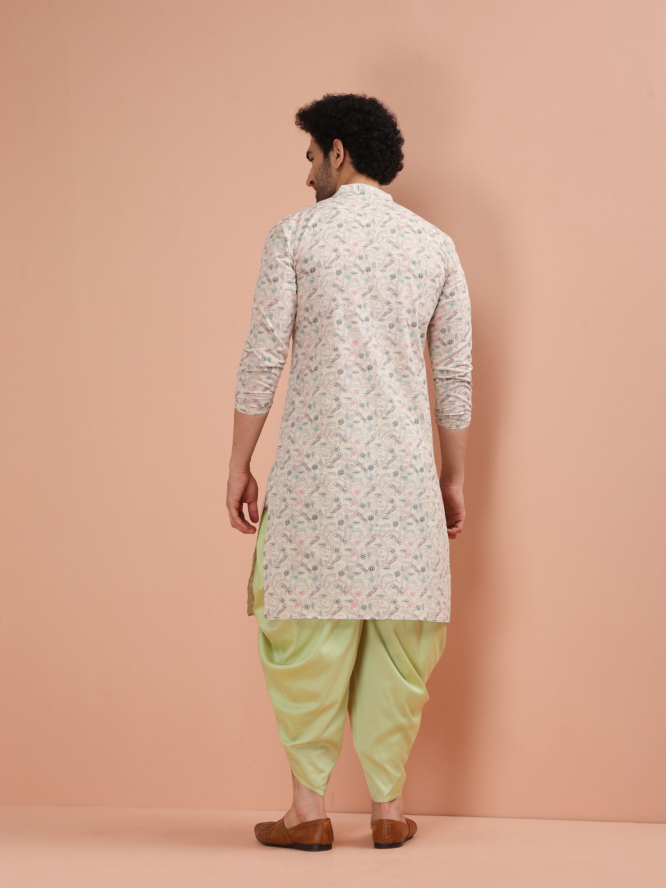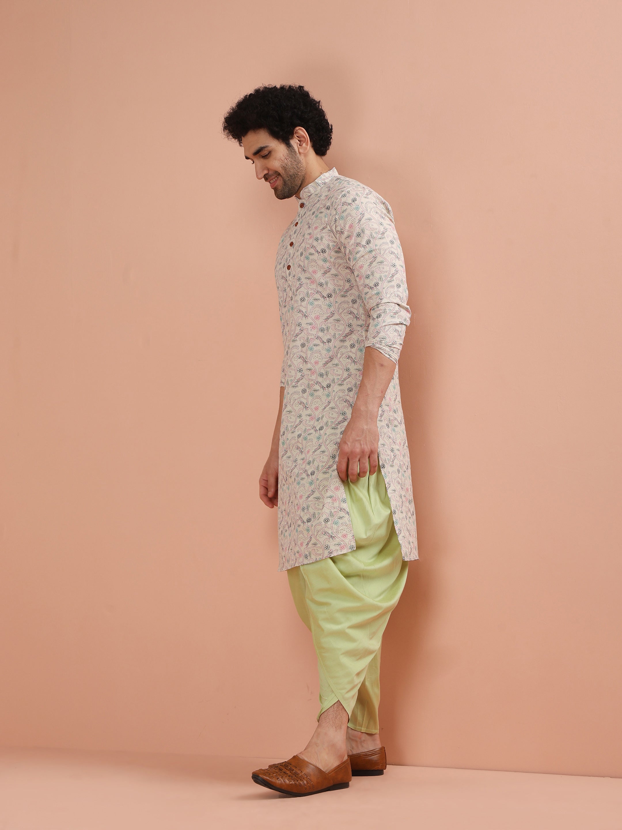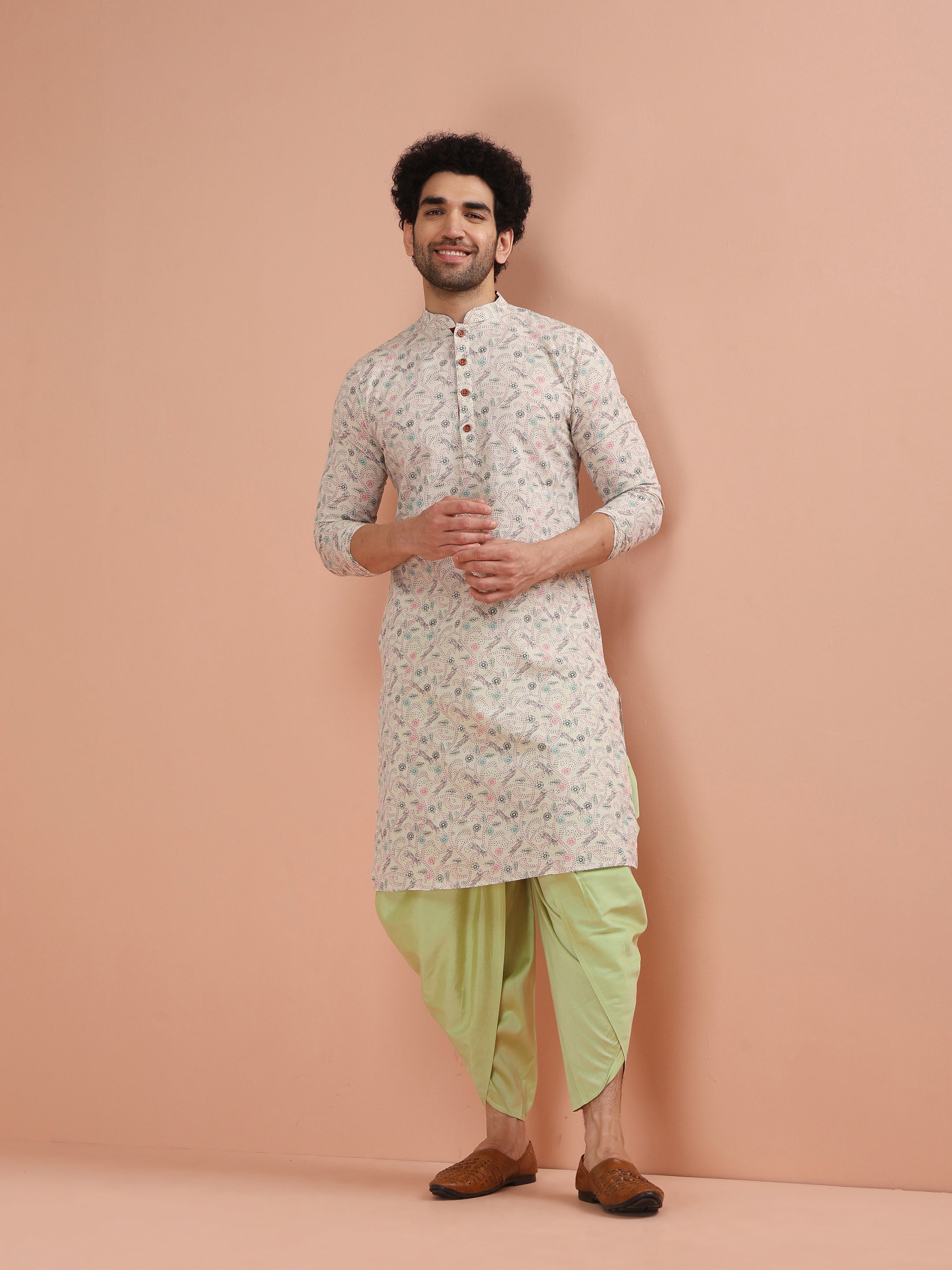 Beige Cotton Kurta Set with Multicolor Kantha-Inspired Prints and Green Dhoti Pants