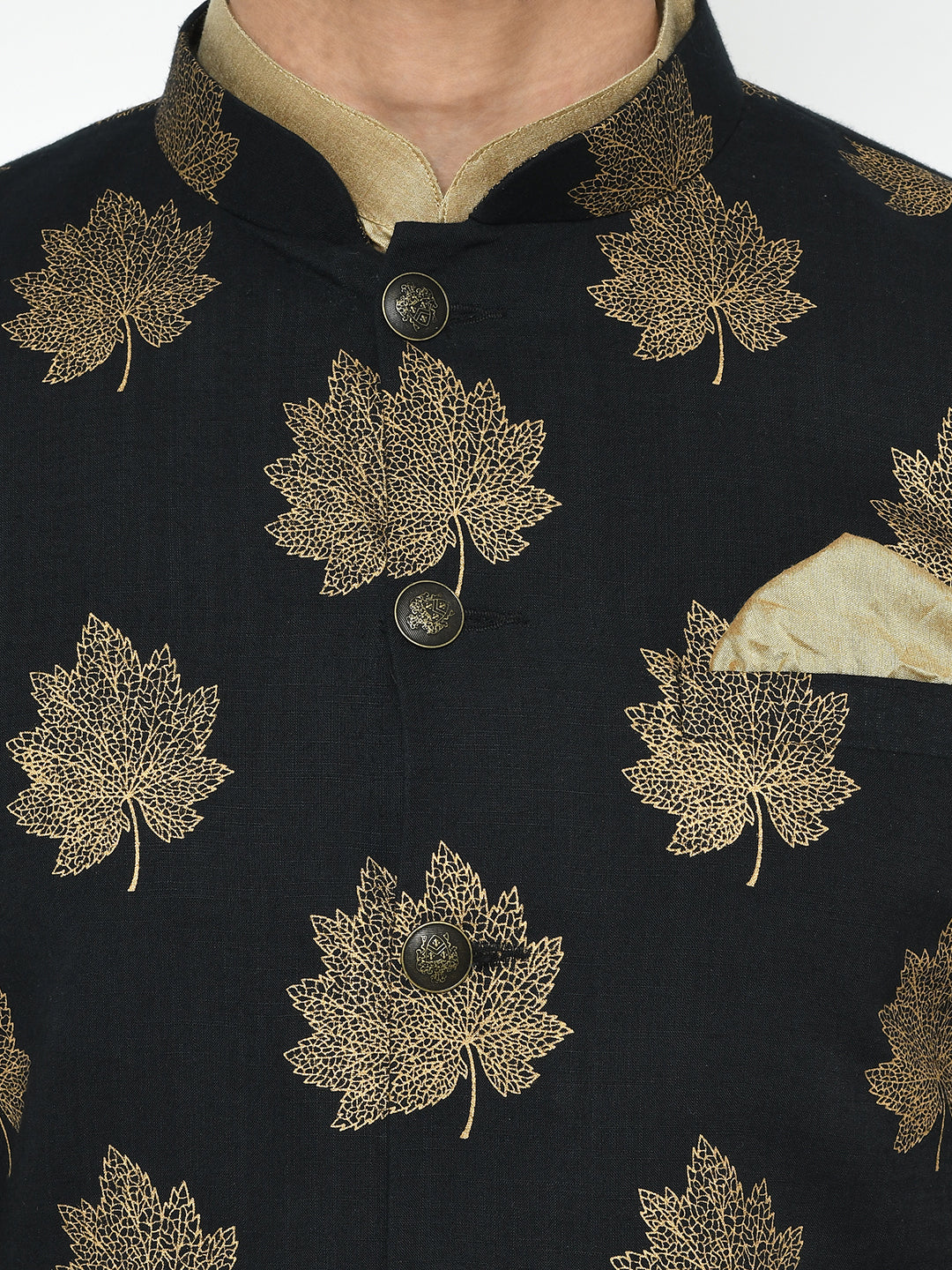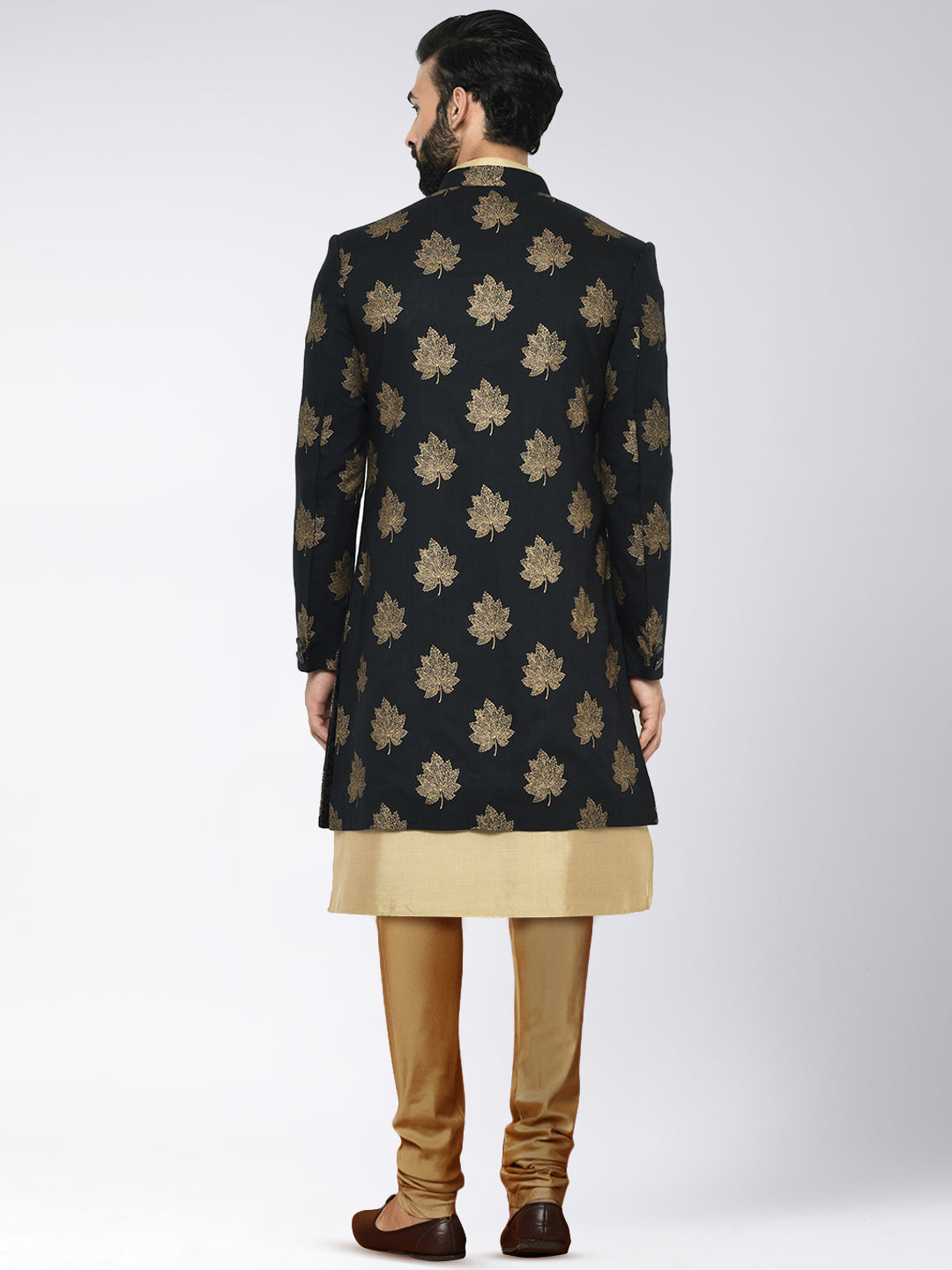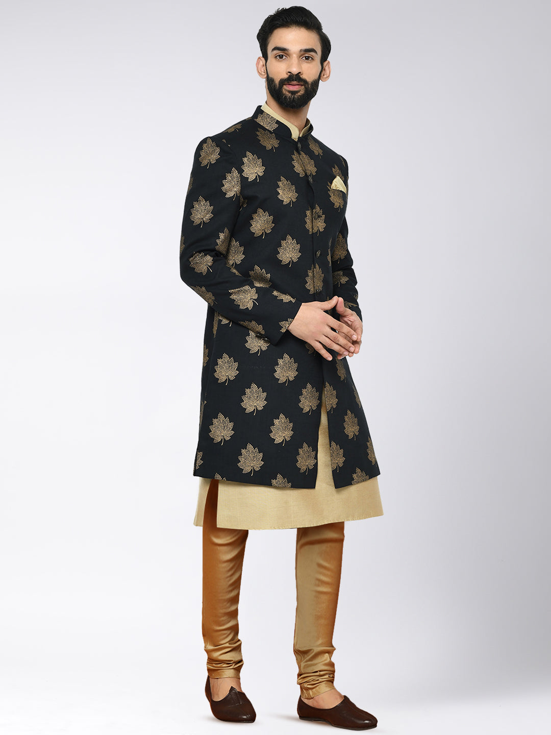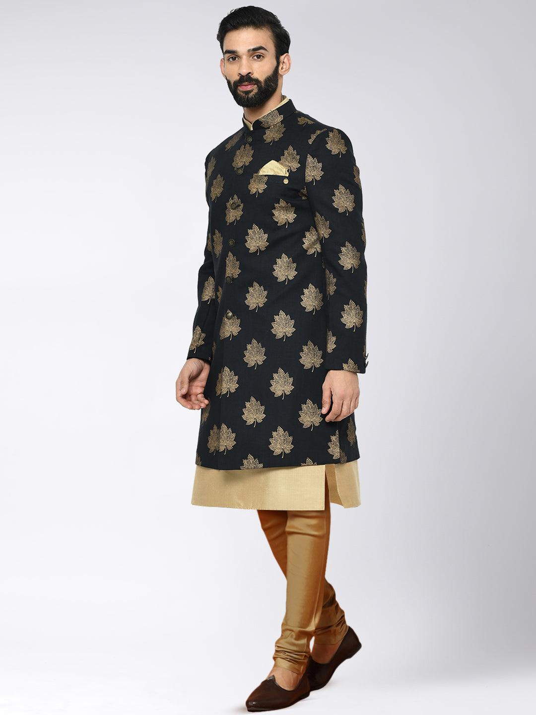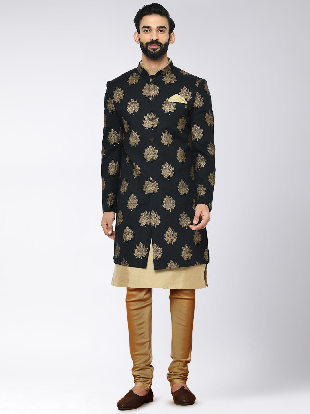 This Indowestern set is an elegant mandarin collar style that is perfect for occasional wear. With a full sleeve design, Black colour and Blended Fabric fabric, it will make you look stylish. Featuring a Indowestern, kurta and bottomwear, it is perfect for formal occasions.