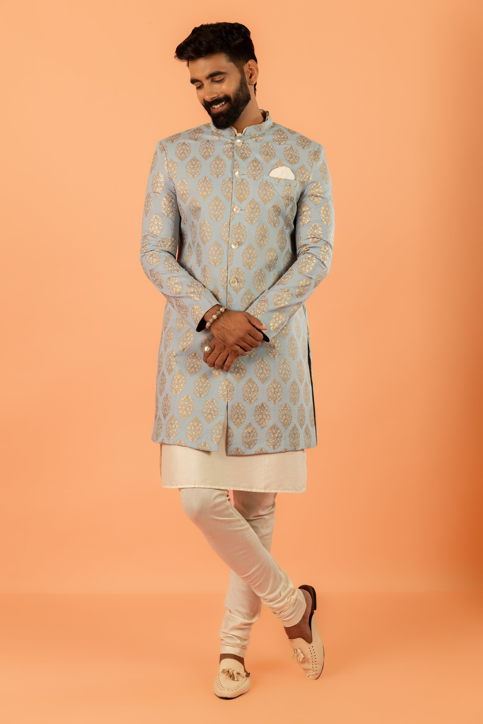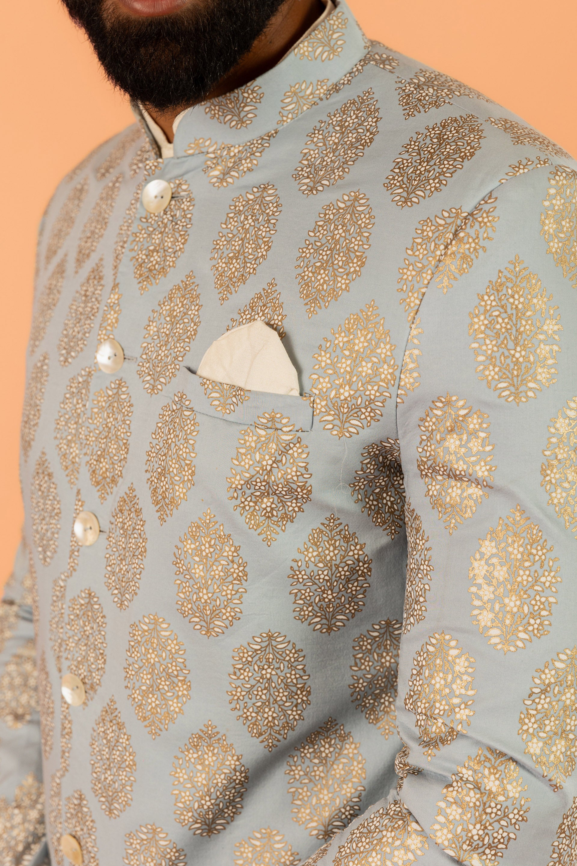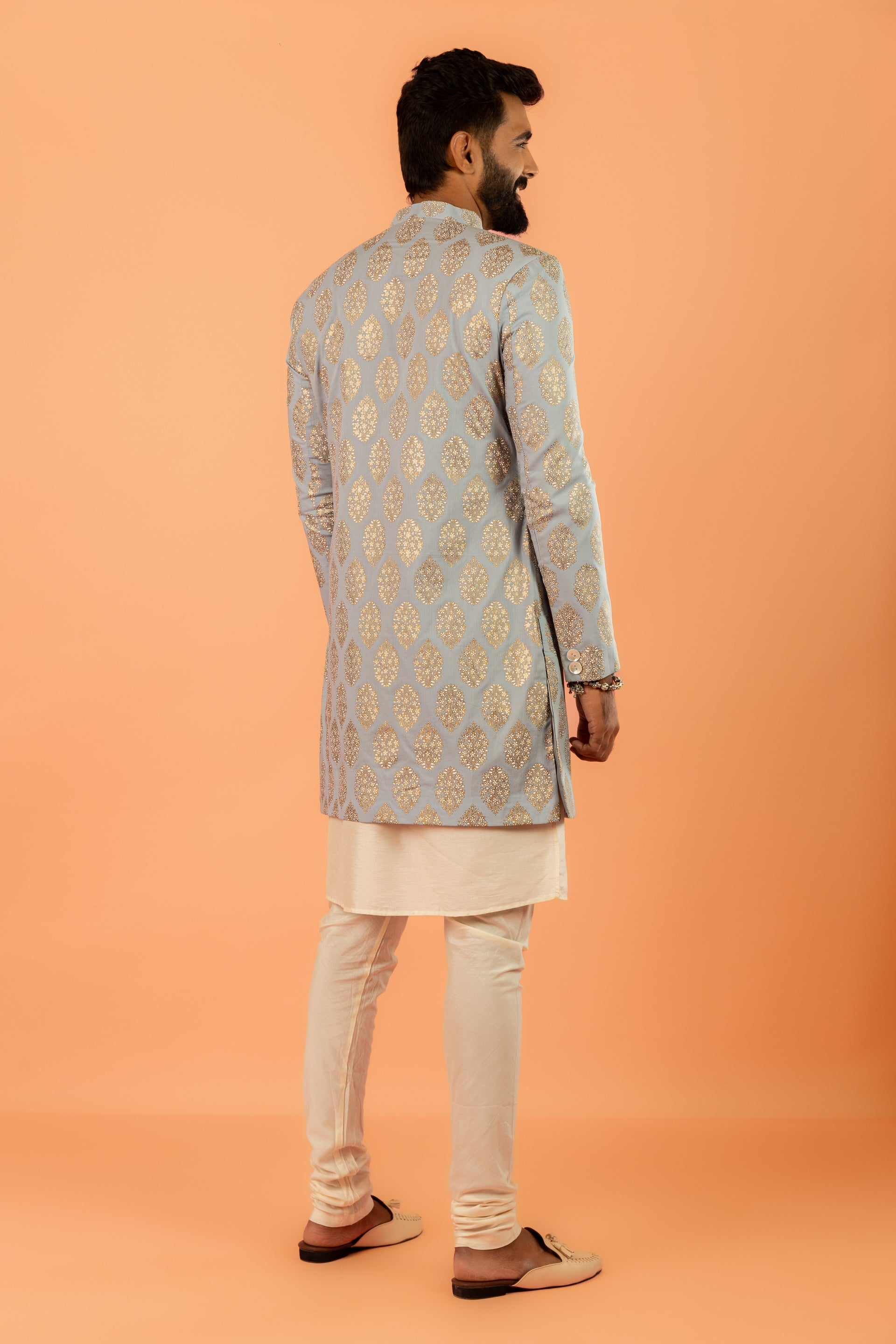 Men Blue Foil Print Kurta Indowestern Trouser Set with Ethnic Motifs