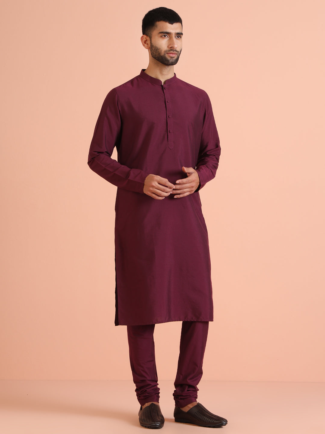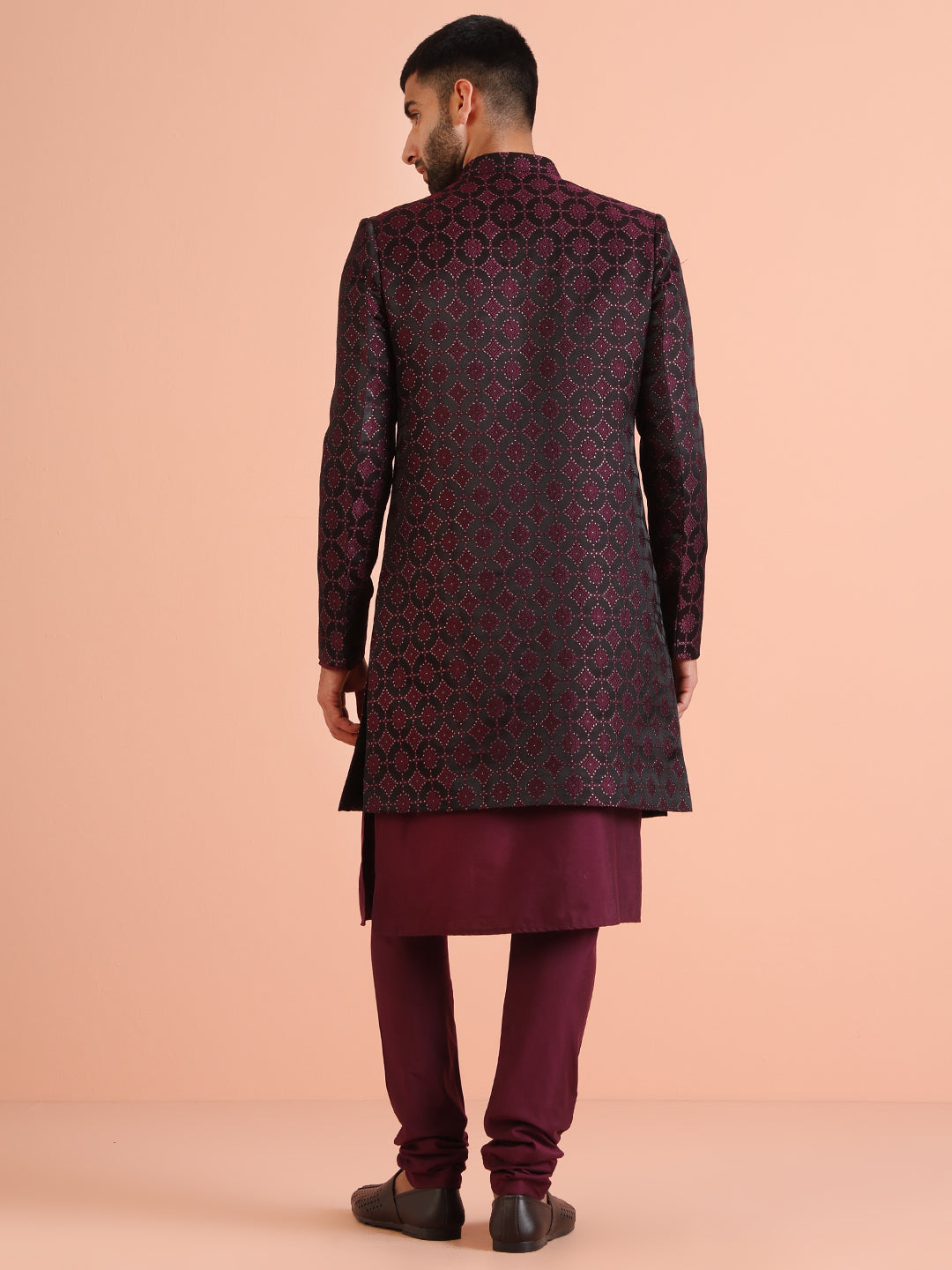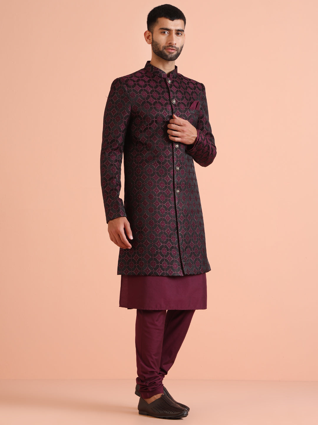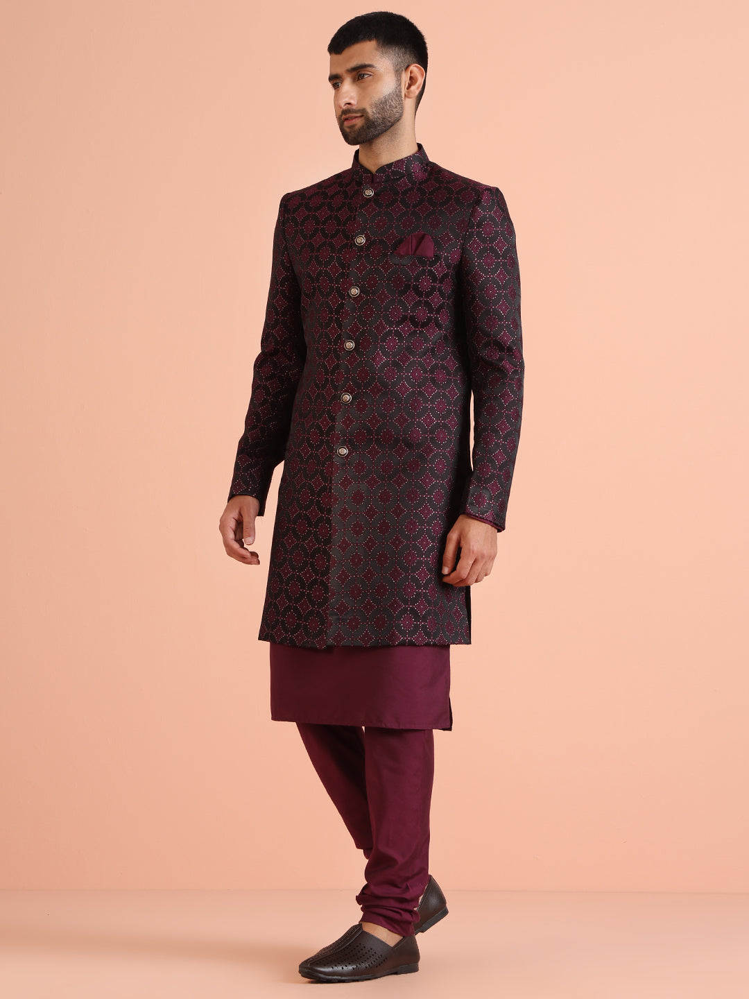 Make a statement with this Burgundy Jacquard Kurta Indowestern Churidar Set, designed for men who appreciate both style and comfort. Crafted from luxurious jacquard fabric, the woven design adds a modern touch to this classic ethnic ensemble. The regular fit ensures comfort, making it perfect for casual occasions, family gatherings, or even festive celebrations. Ideal for those seeking versatile ethnic wear, this set combines tradition with a contemporary twist. Dry clean only care ensures it stays fresh and well-maintained, making it a go-to choice for your next casual or semi-formal event.