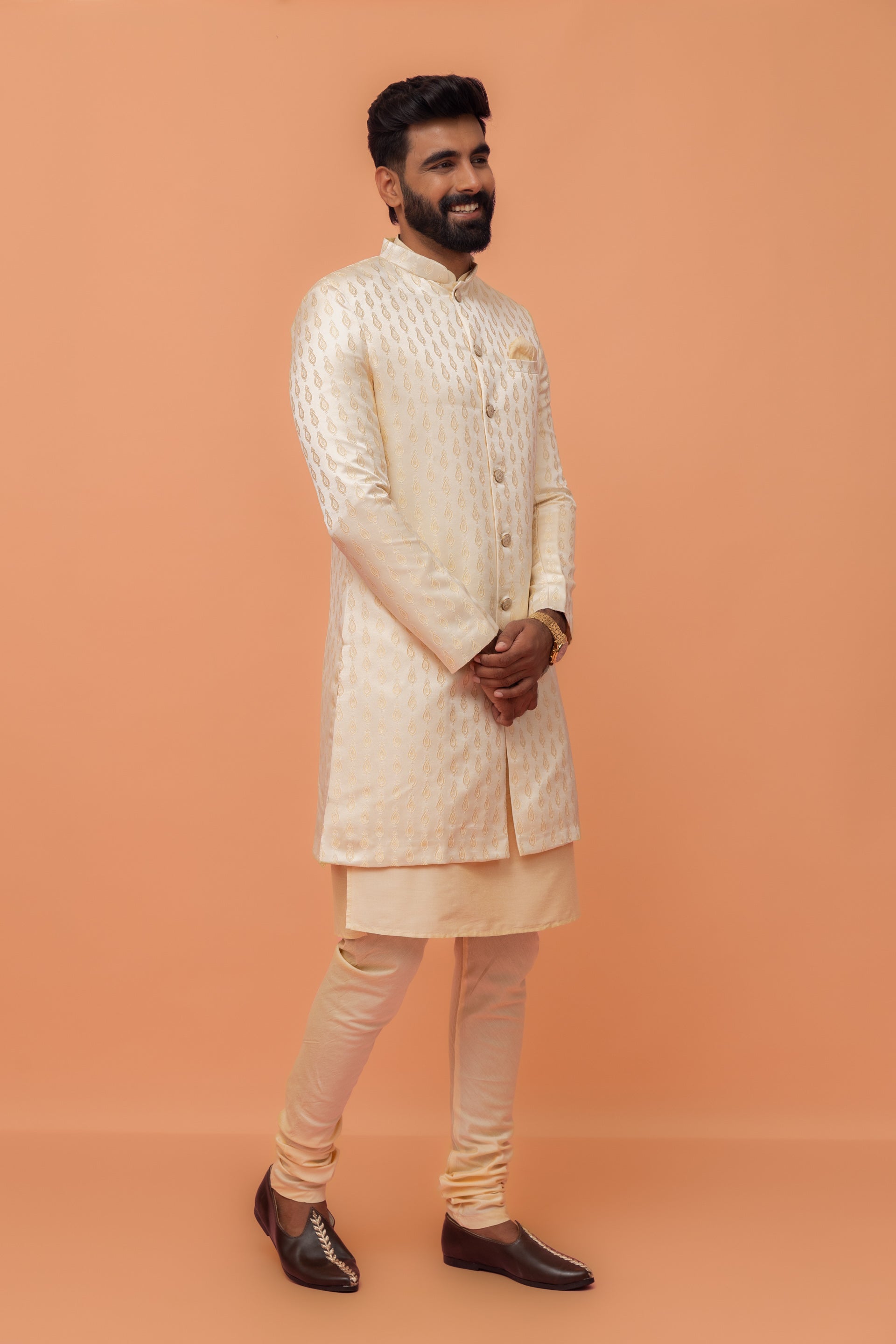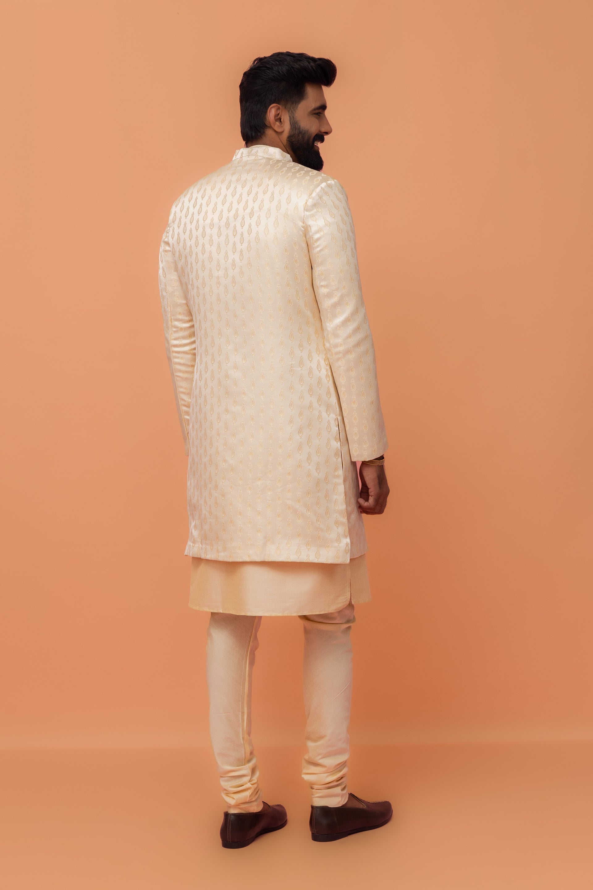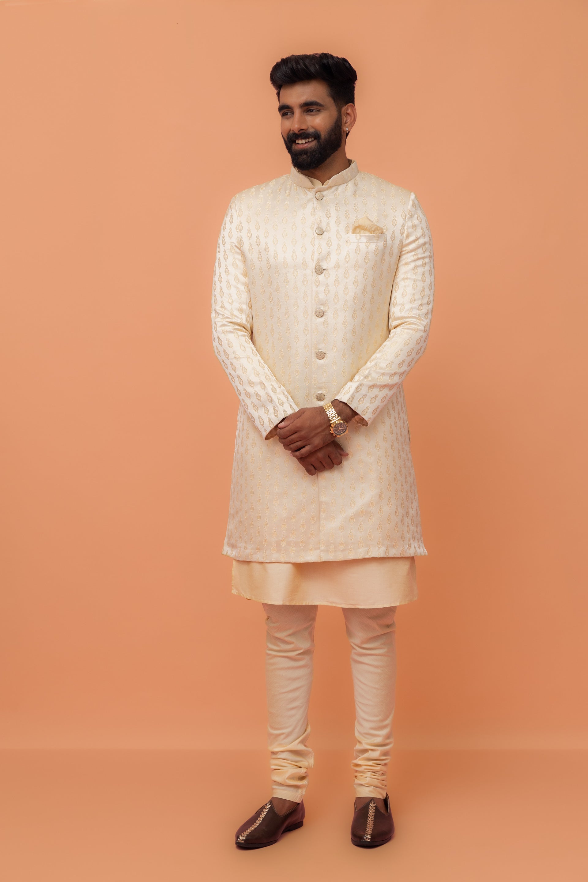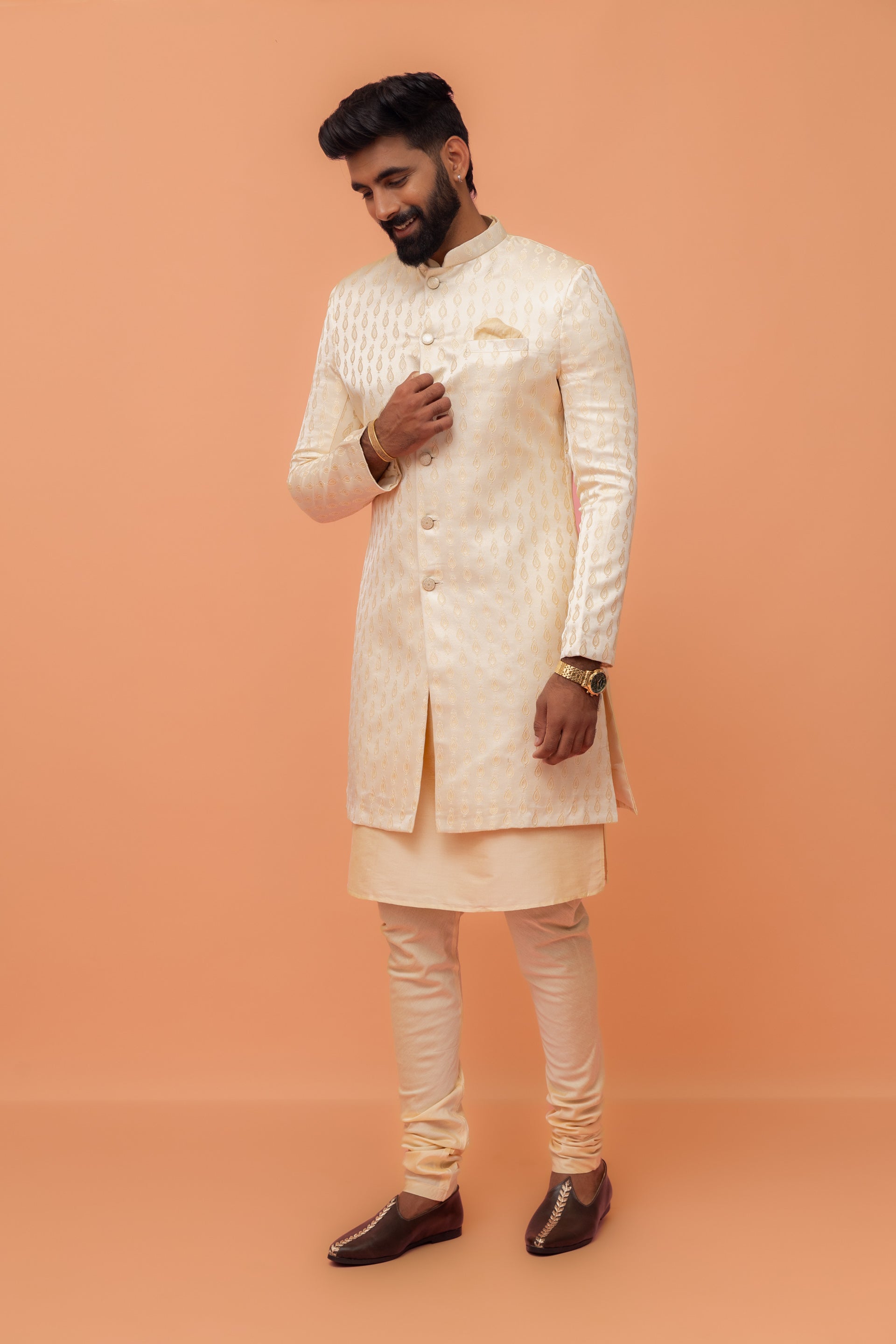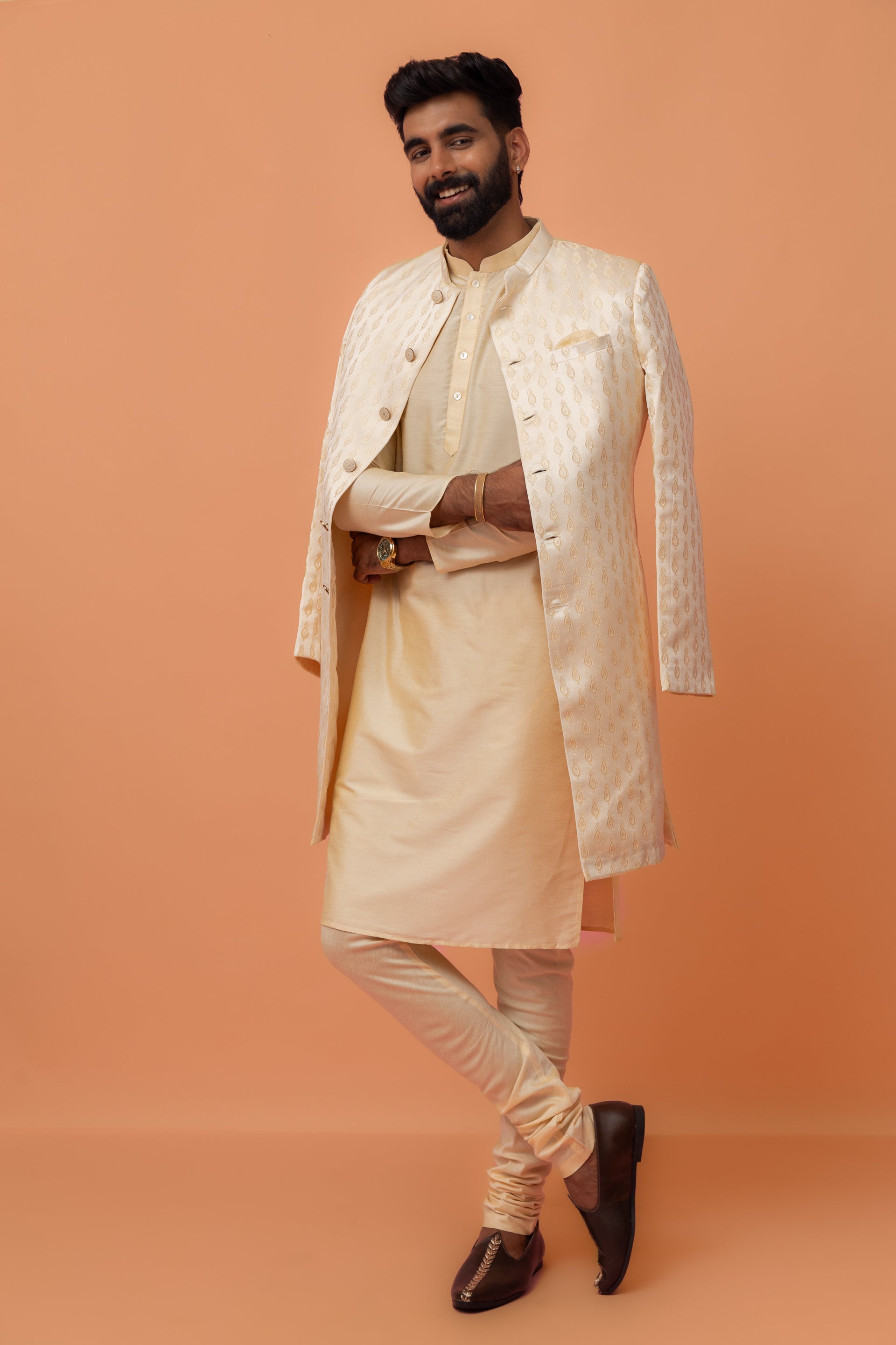Experience classic elegance with this Kisah Men Cream Silk Blend Ethnic Motifs Pattern, Kurta Indowestern Trouser Set. The breathable fabric ensures comfort throughout the day. Ideal for festive events or casual wear.