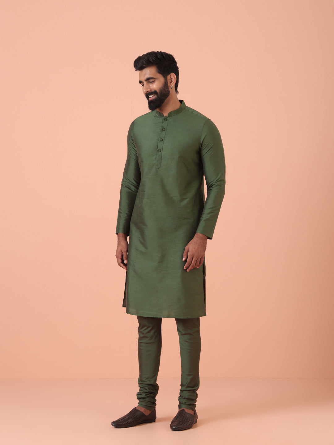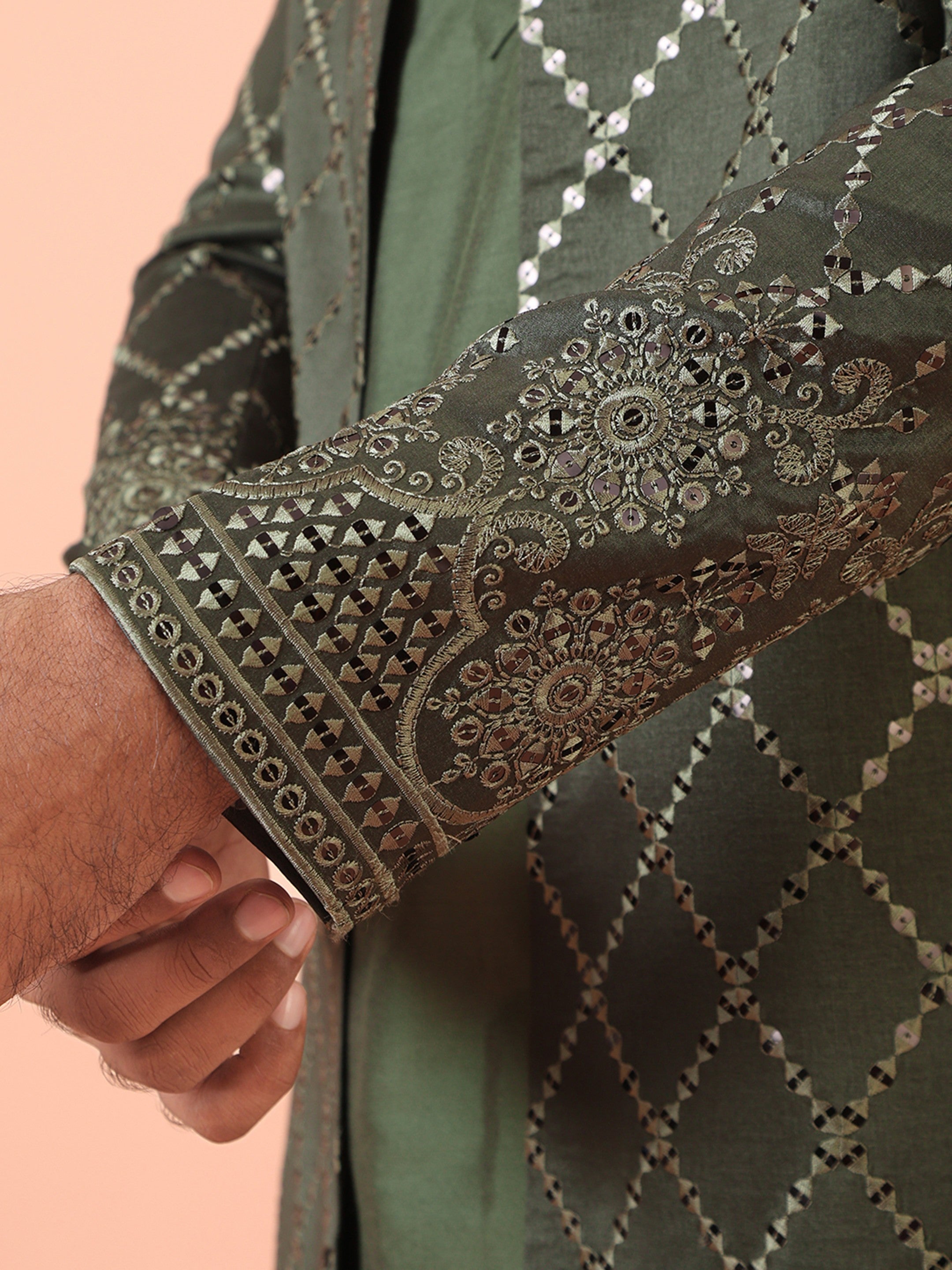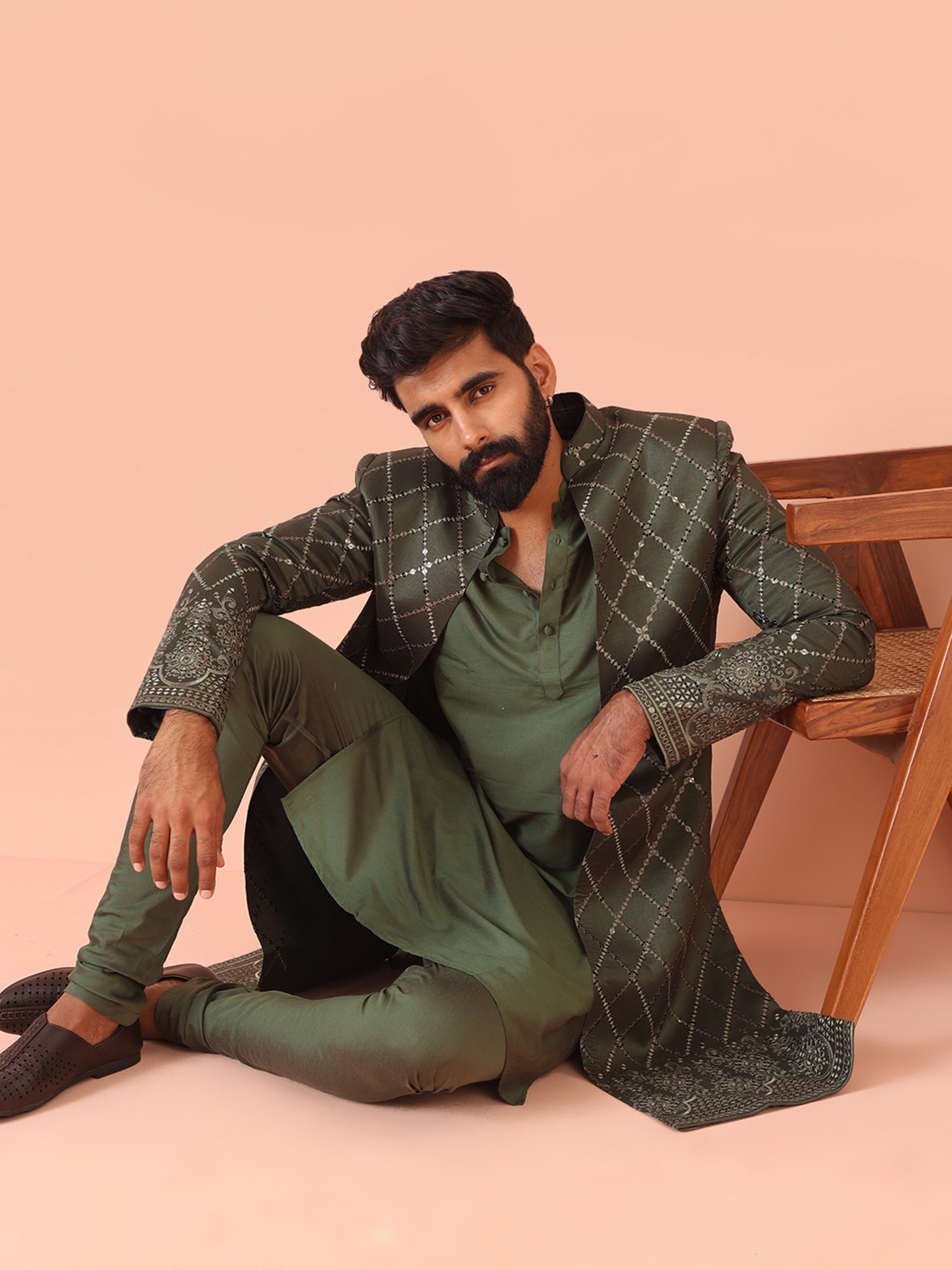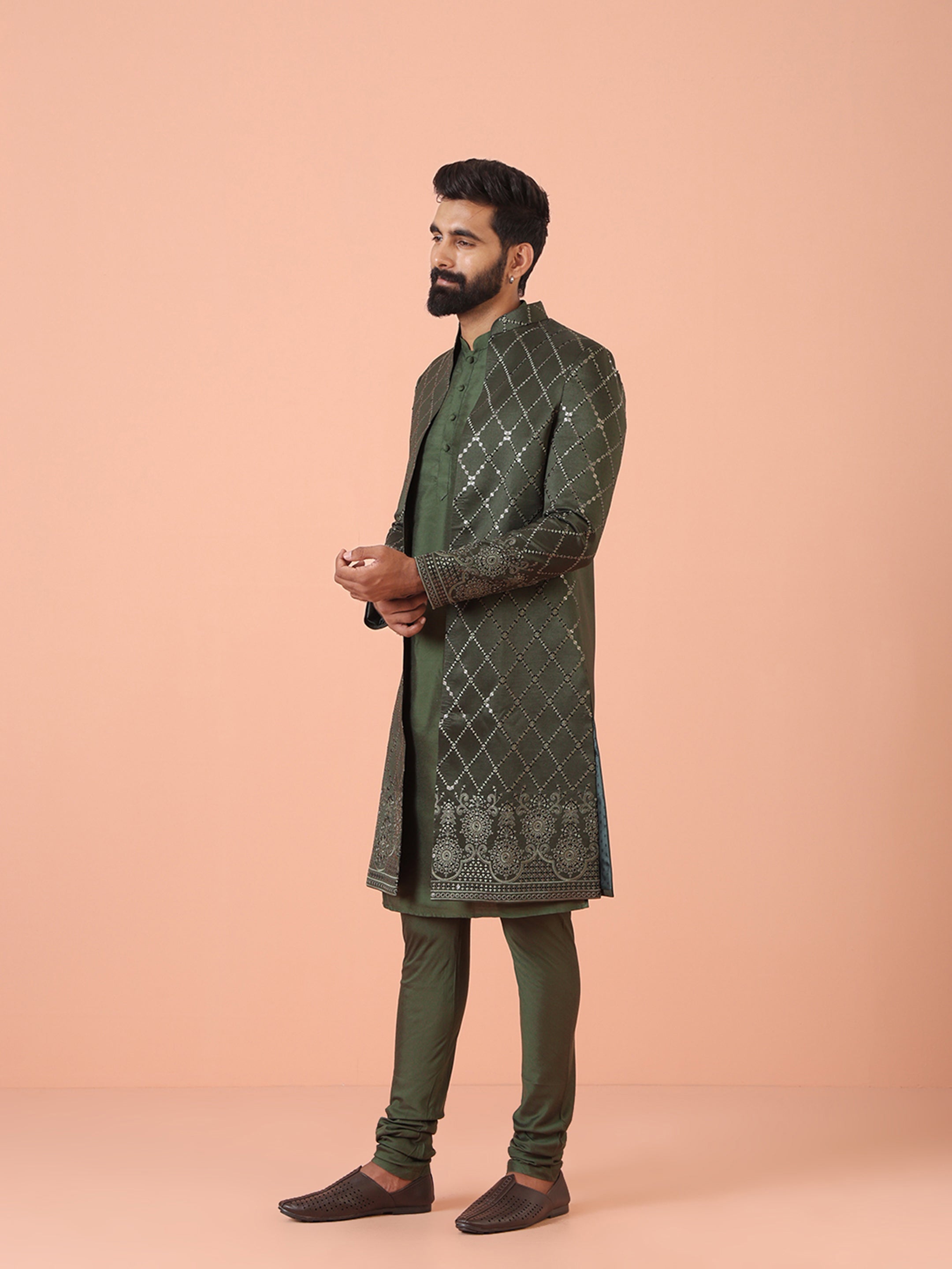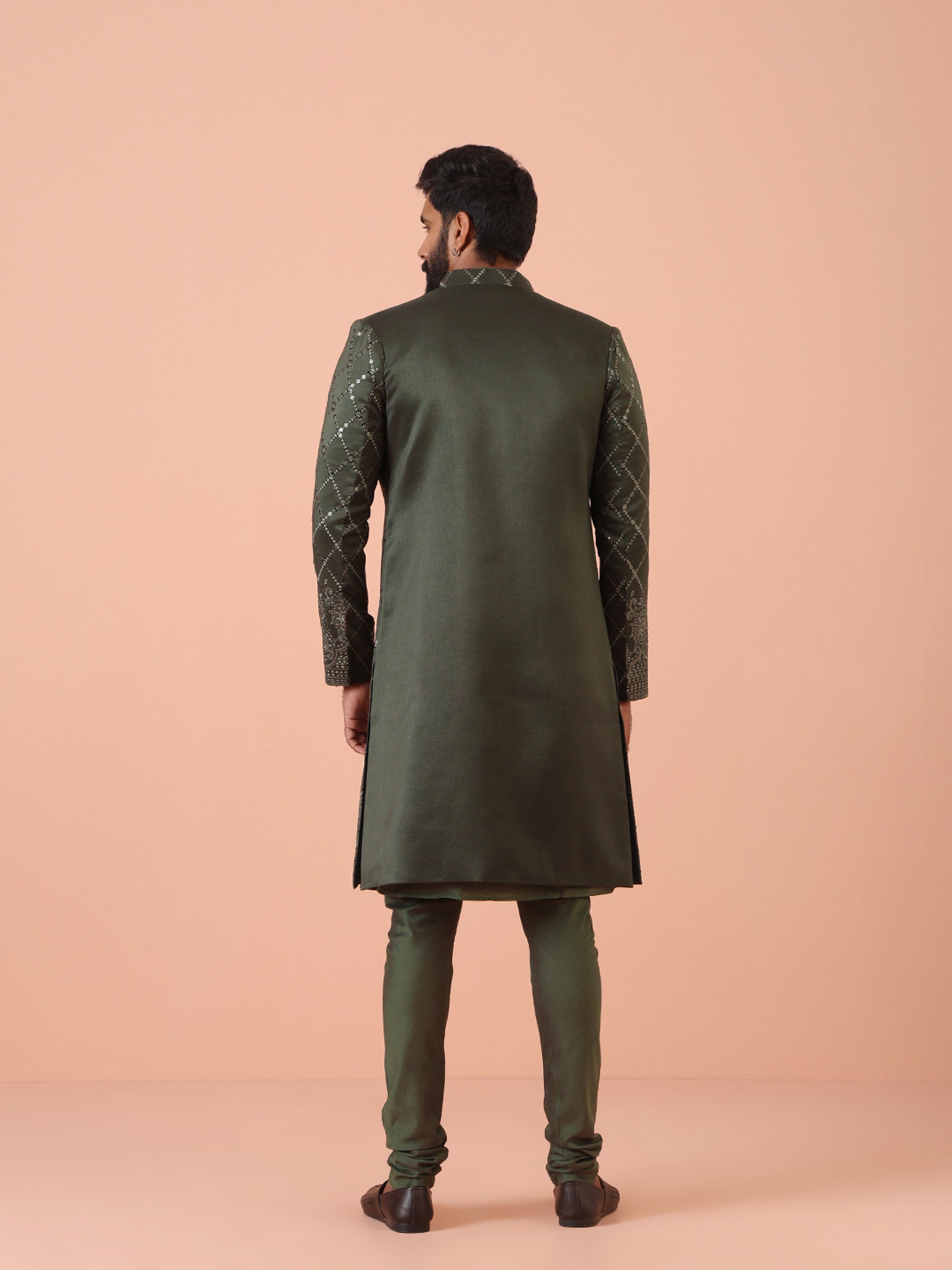 Men Olive Embellished Kurta Indowestern Churidar Set