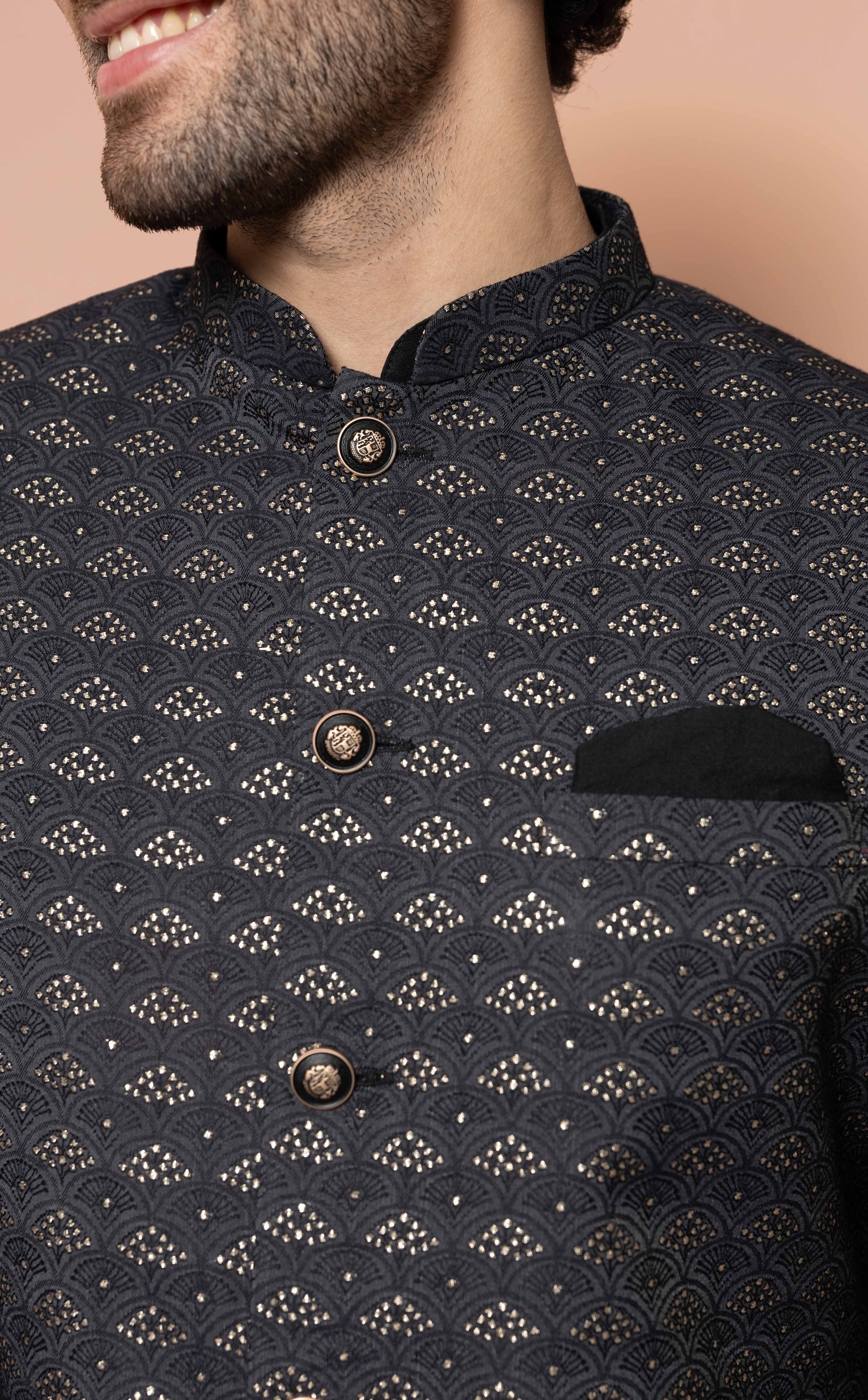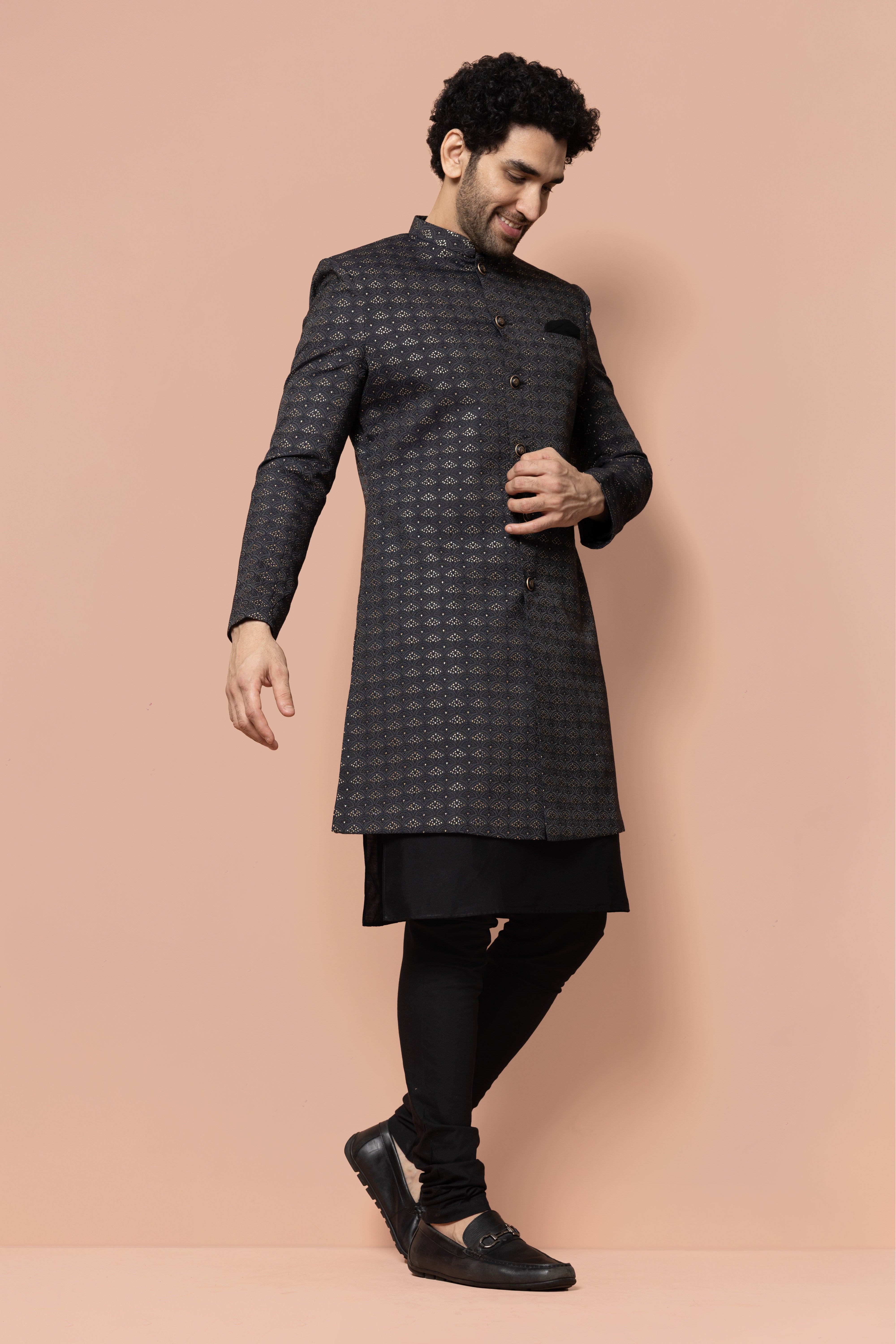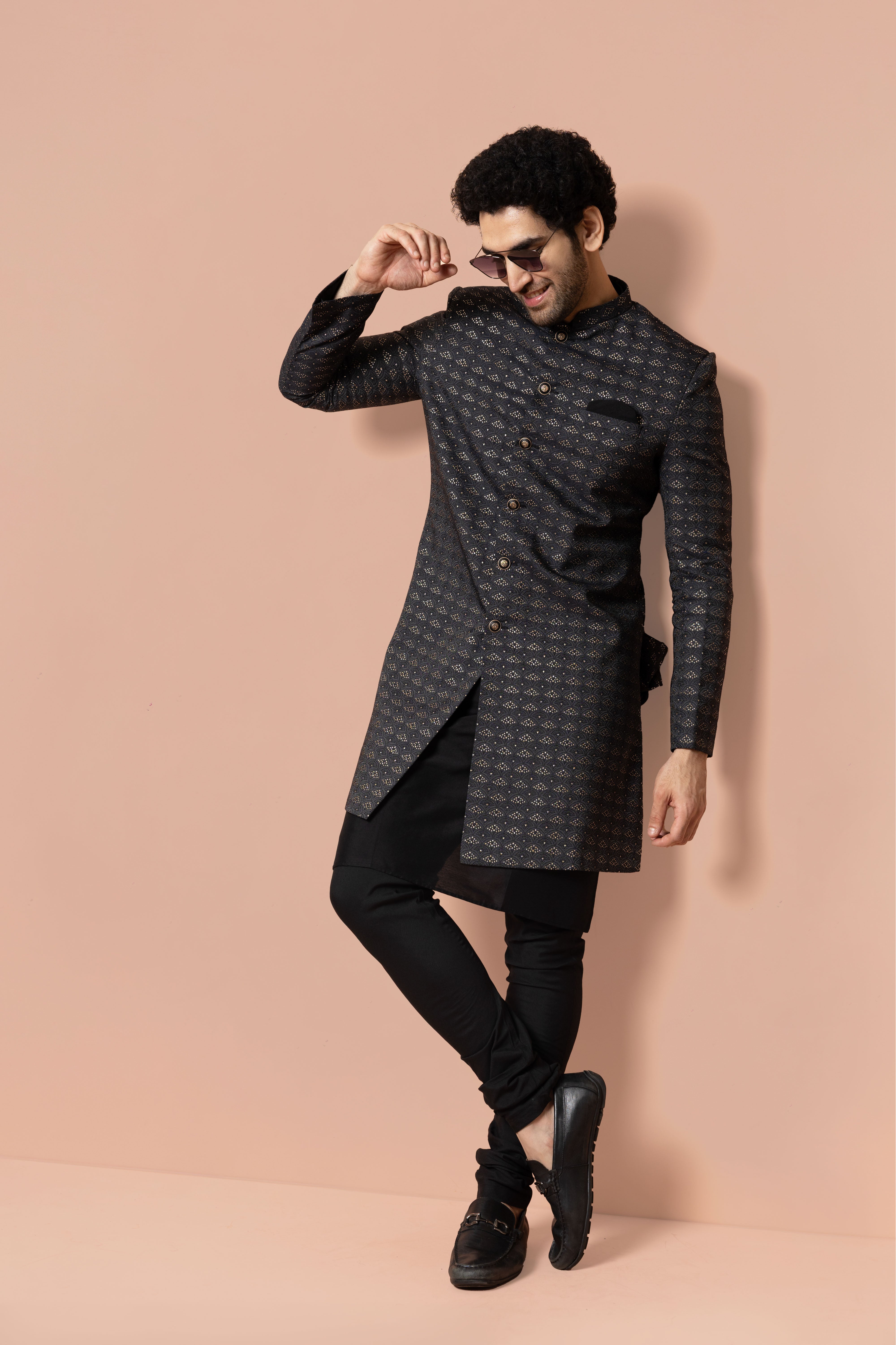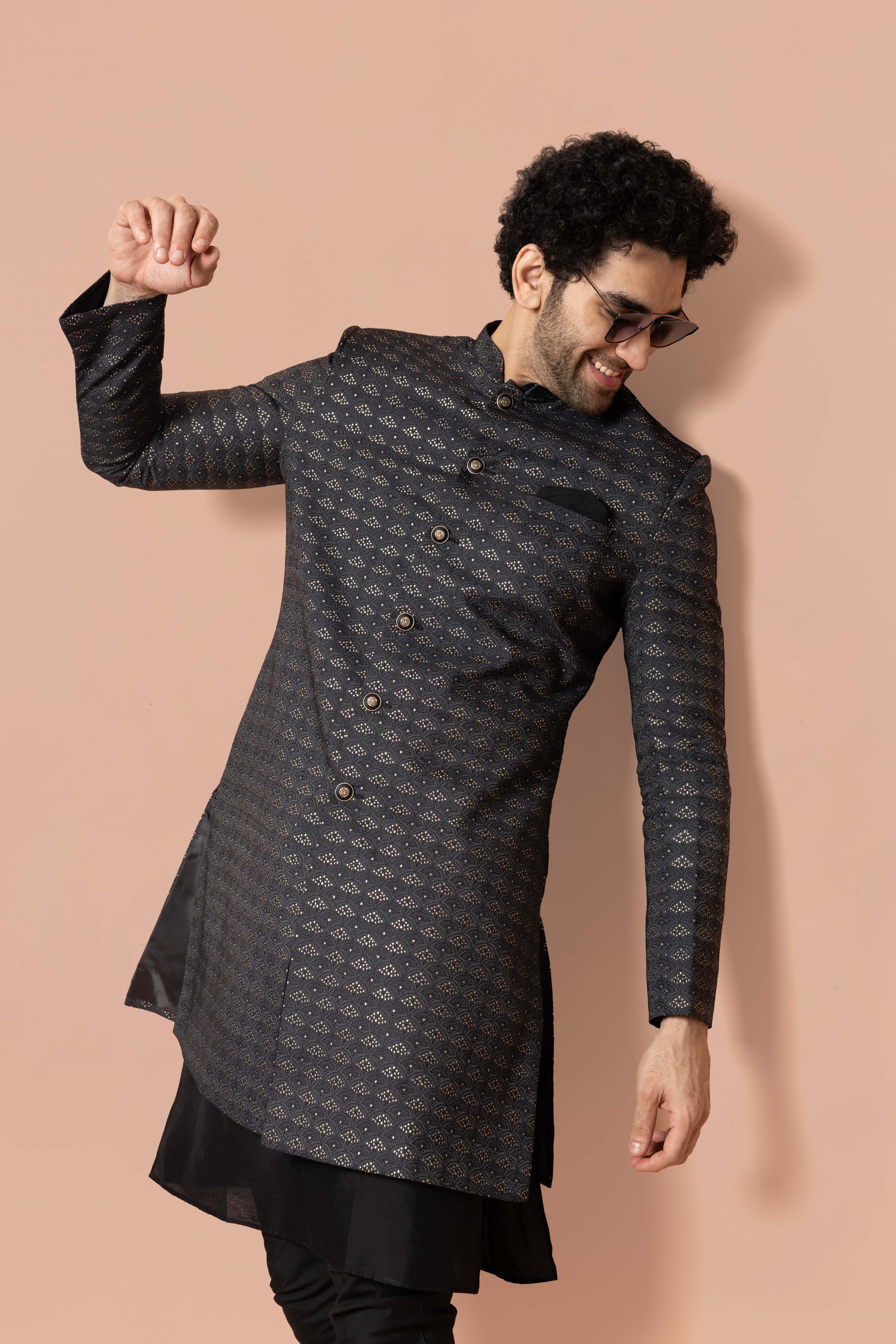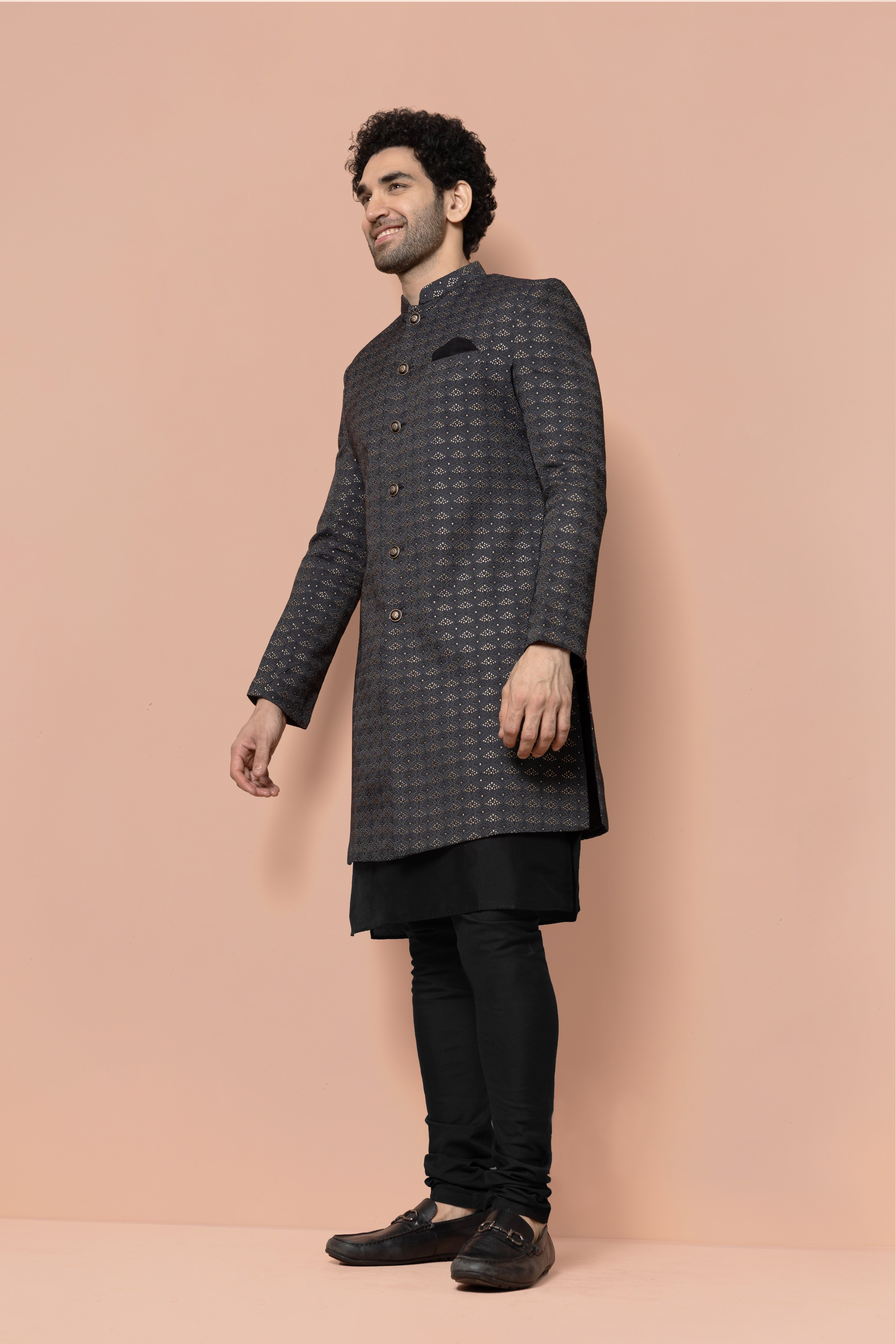 This ash grey and black silk blend jacquard kurta, indowestern, and churidar set comes with a textured finish and regular fit. A timeless option for any ethnic occasion.