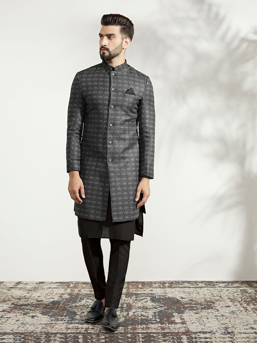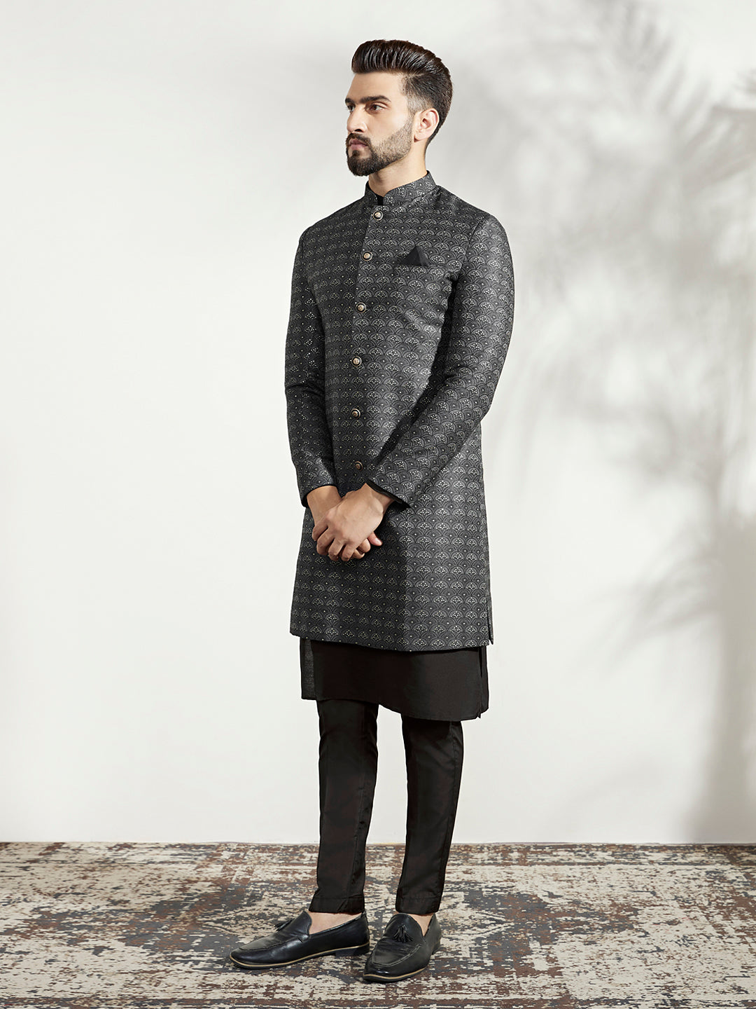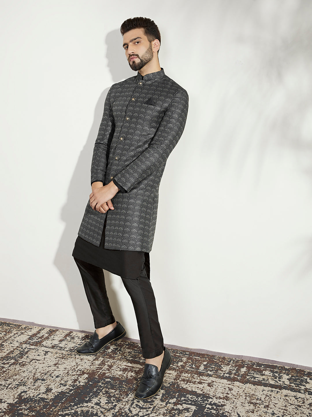 Make a statement with this ash grey and black silk blend jacquard indowestern and trouser set. The textured fabric offers a modern twist to traditional wear.