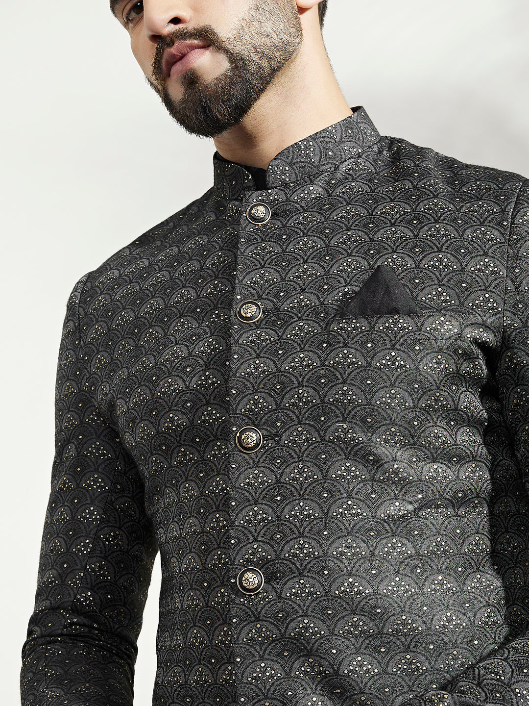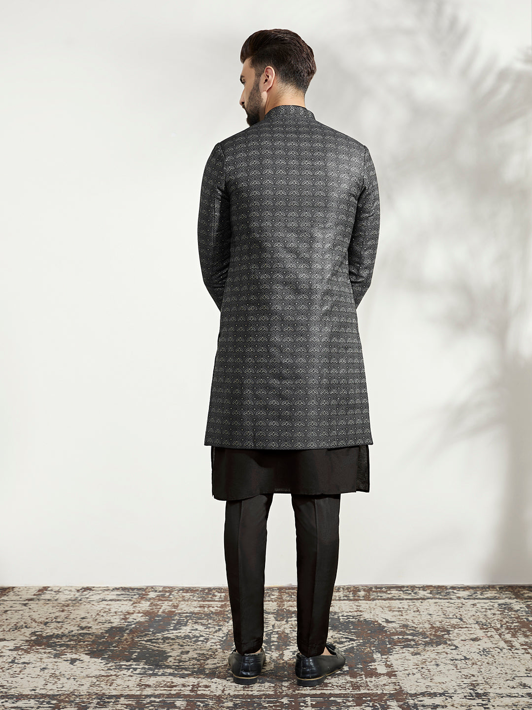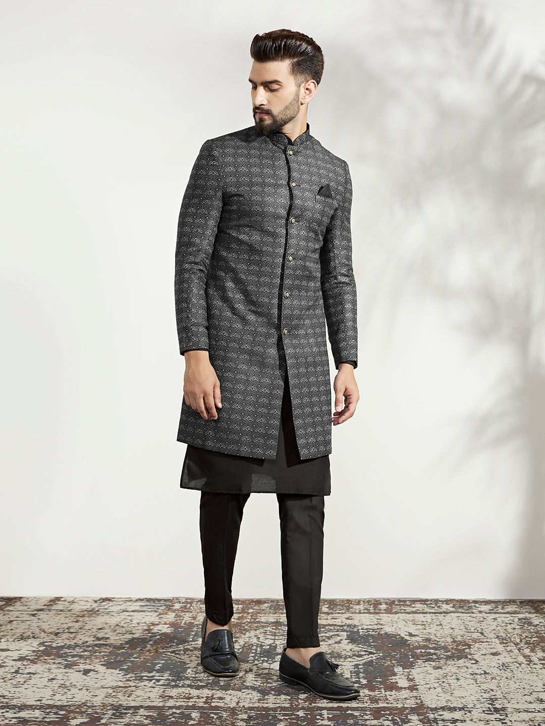 Make a statement with this ash grey and black silk blend jacquard indowestern and trouser set. The textured fabric offers a modern twist to traditional wear.