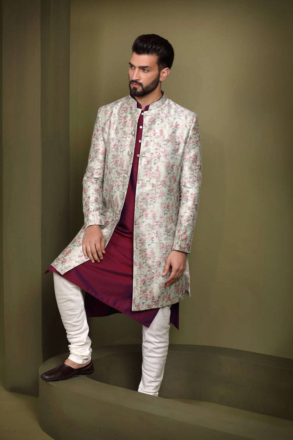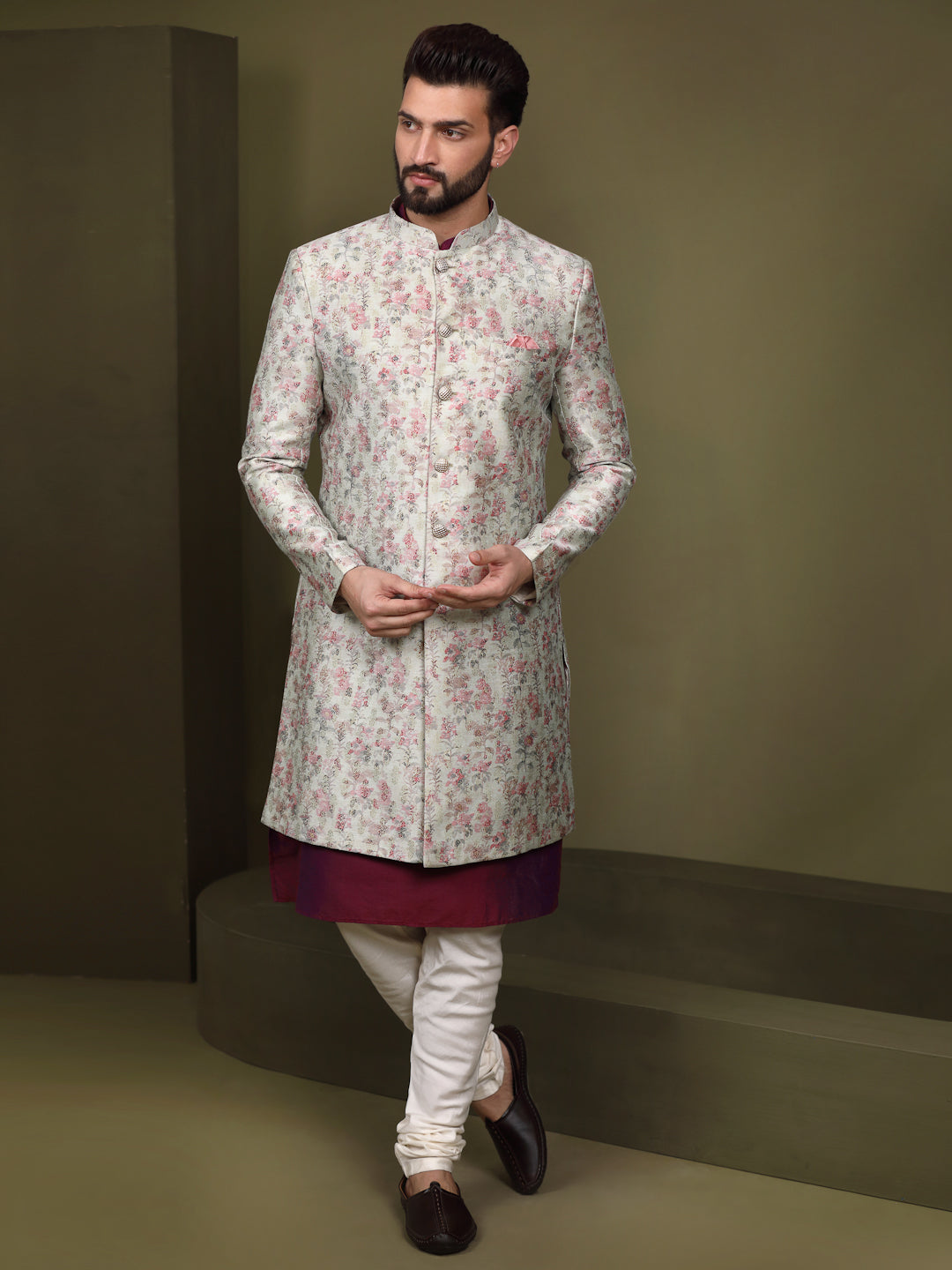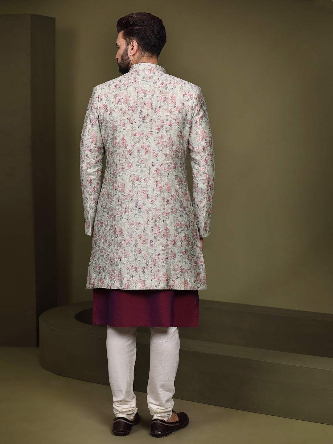 Ivory Silk Blend Indo-Western Sherwani Jacket with Floral Jacquard Design – Wedding & Reception Outfit