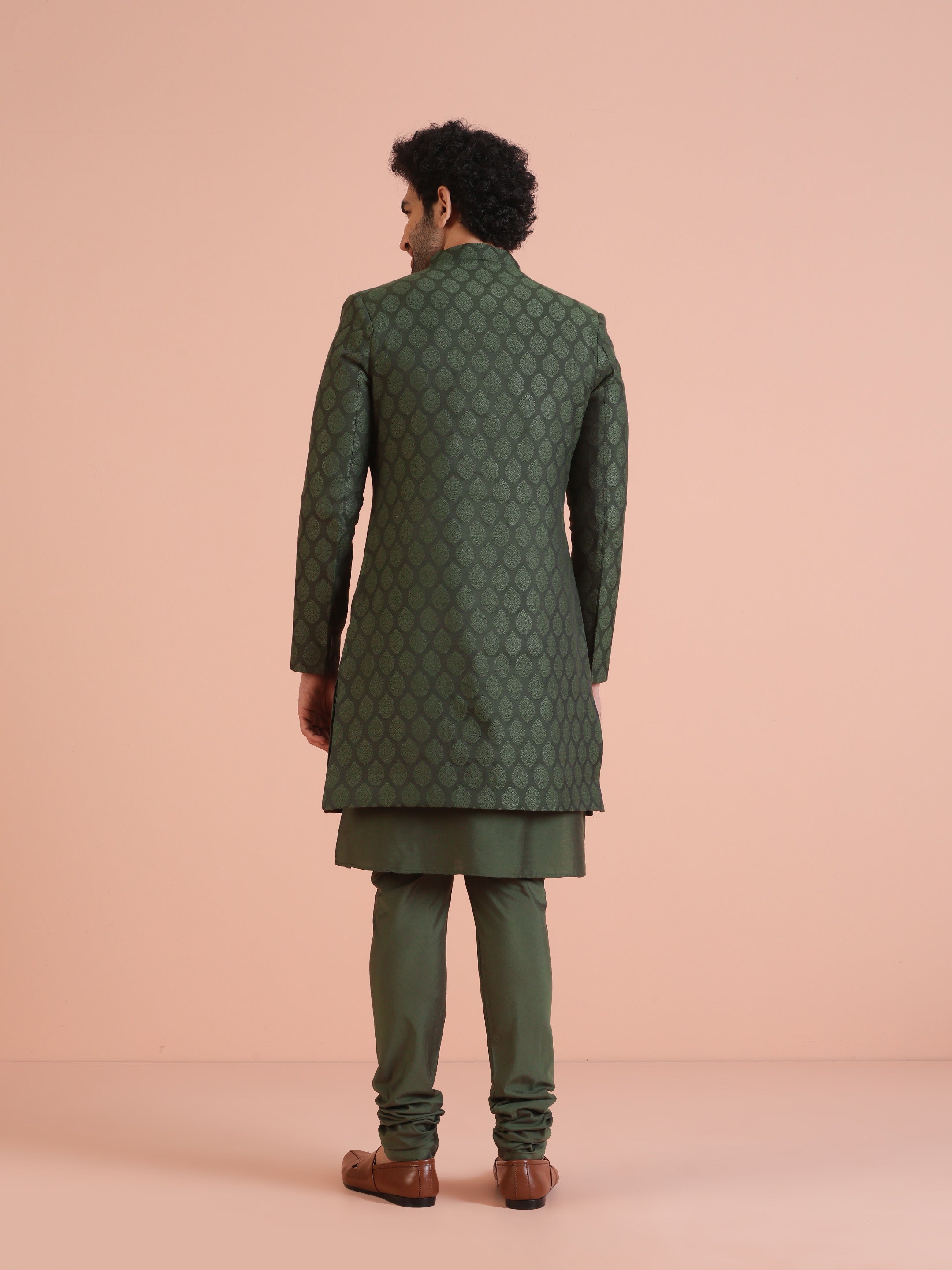 Step up your style game with this elegant Indowestern set, crafted in a refined olive color. Featuring a mandarin collar and full sleeves, this set offers a perfect blend of tradition and modernity. The silk blend fabric ensures a luxurious feel, while providing comfort throughout the day. This set, which includes a kurta, Indowestern jacket, and bottomwear, is tailored for formal occasions, weddings, and festive events. Make a bold yet sophisticated statement with this versatile ensemble, designed to make you stand out in every crowd.