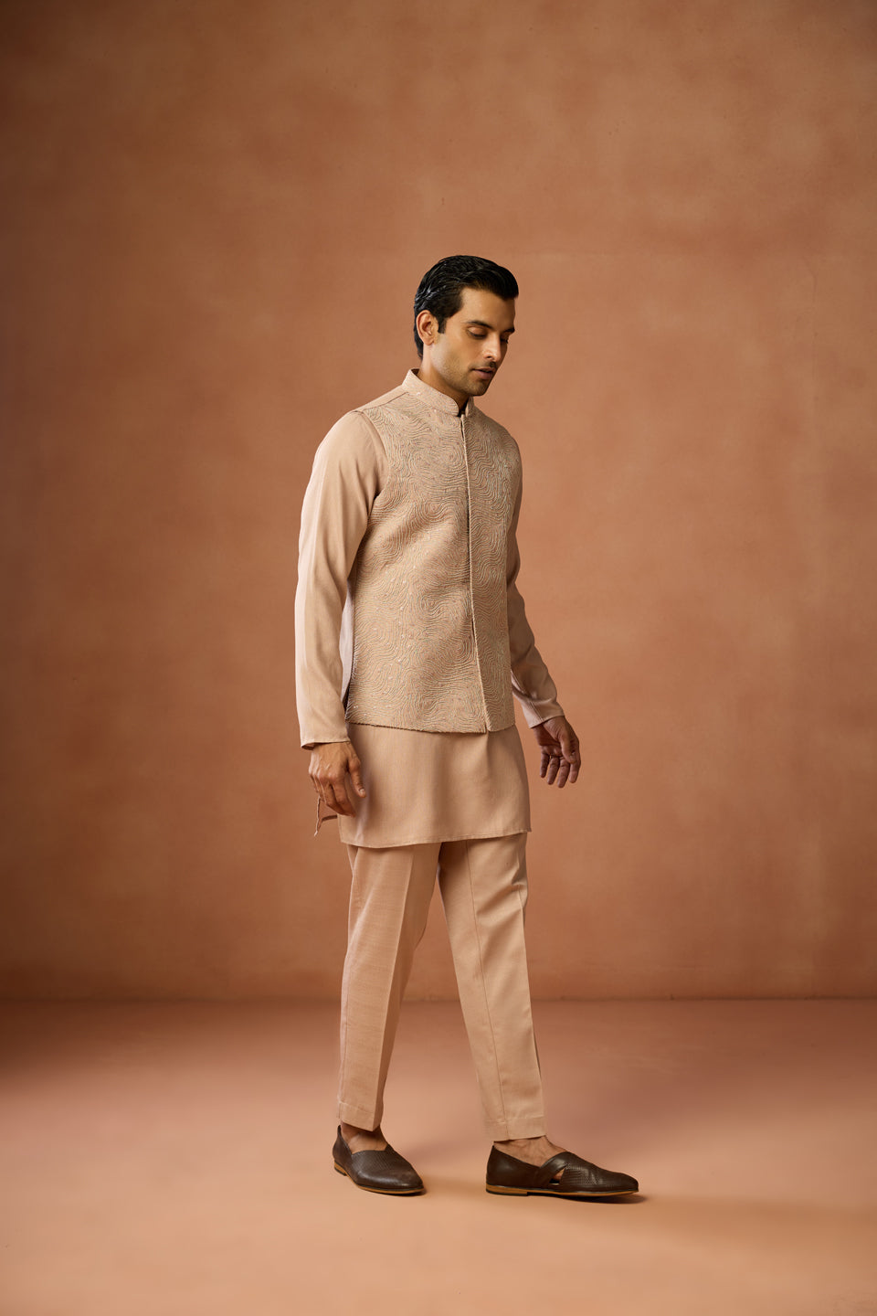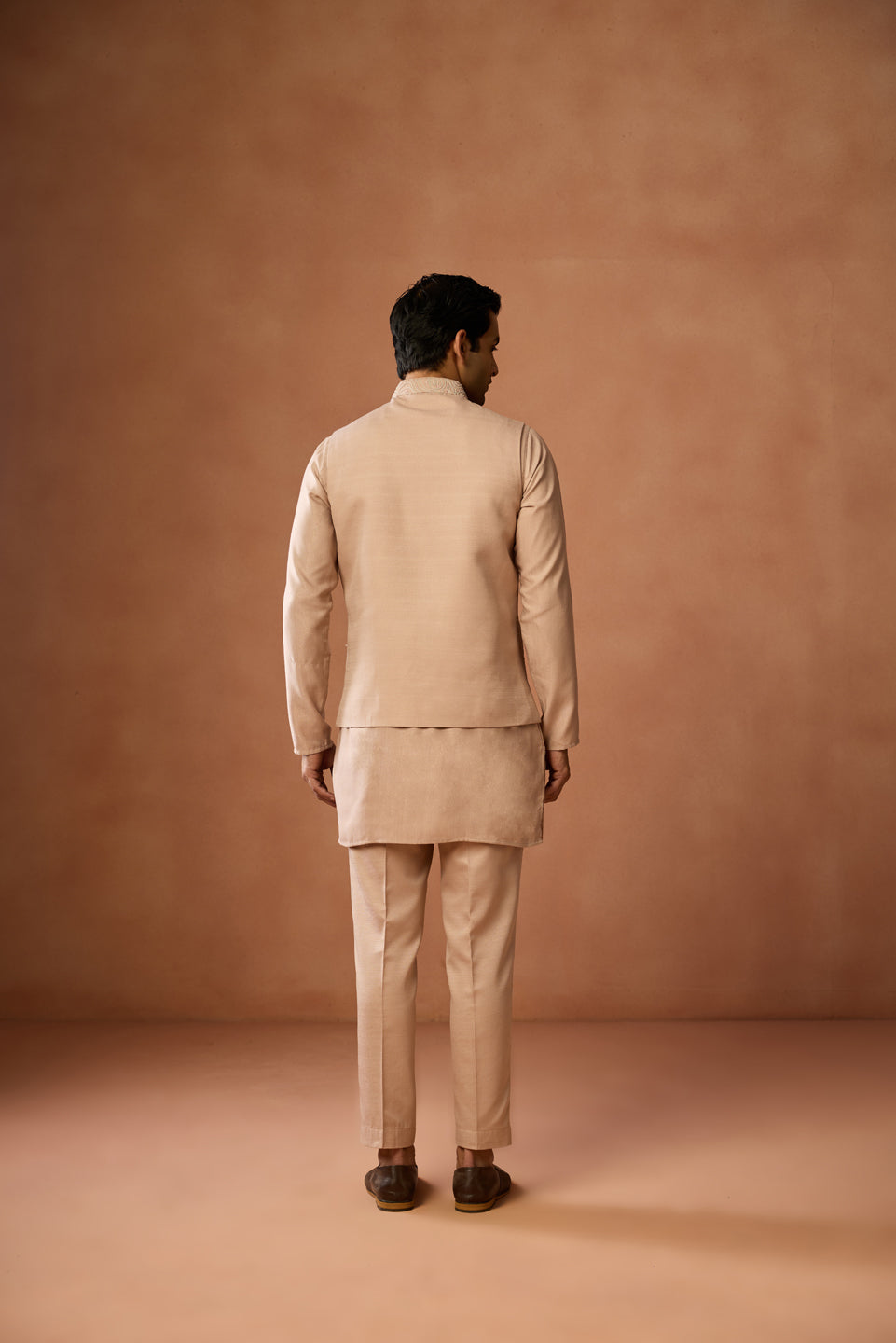 Beige silk blend Nehru jacket with embroidered texture and subtle sequins. Perfect festive Bundi jacket for weddings, sangeet, and cultural events.