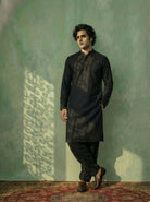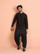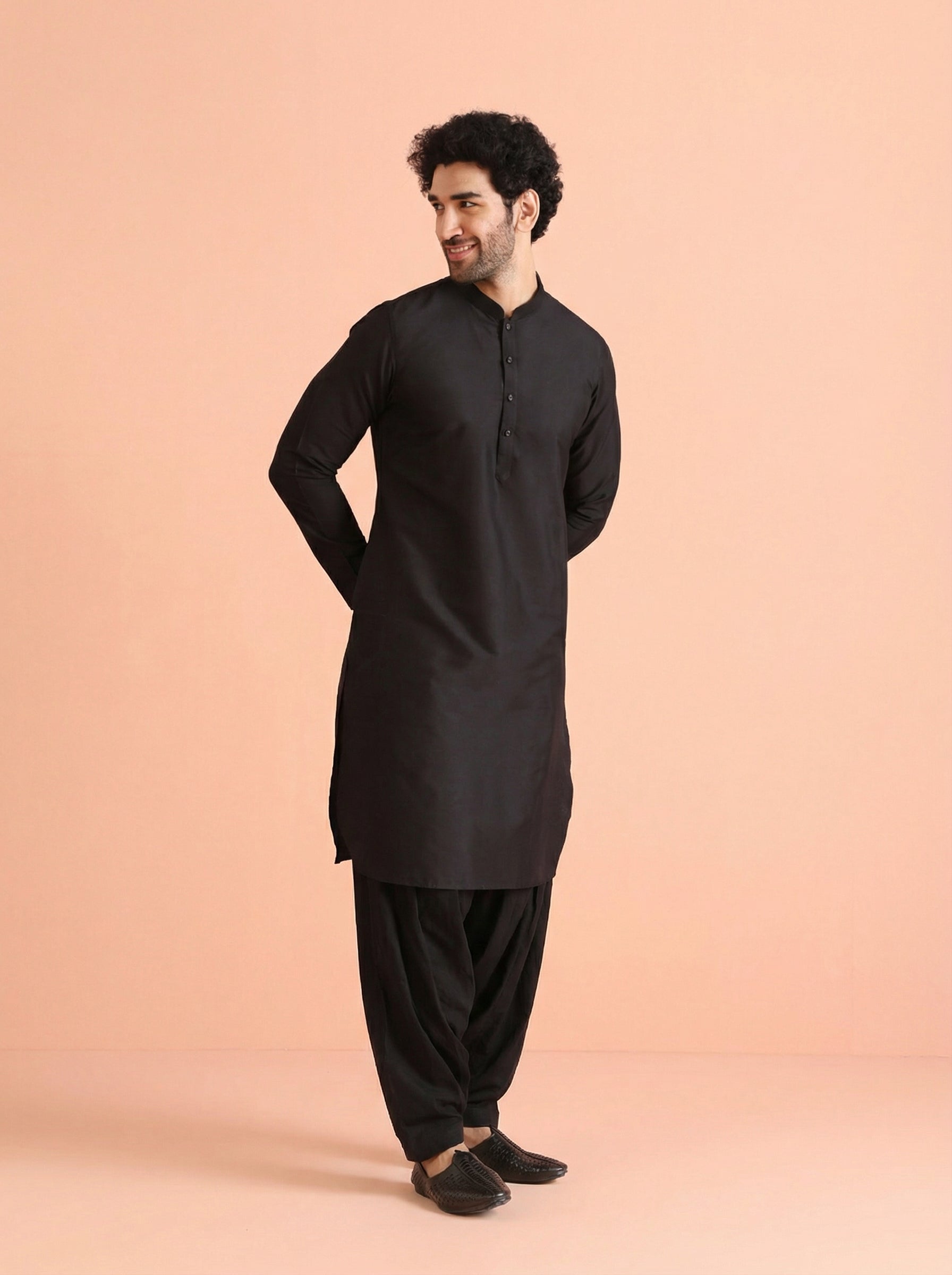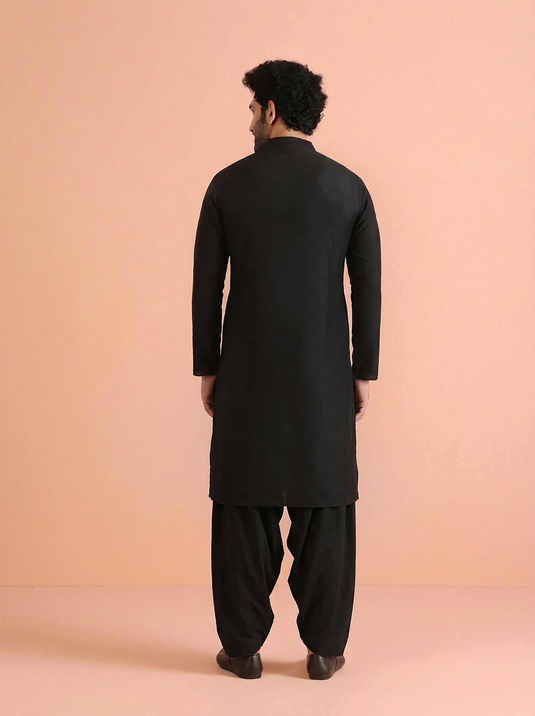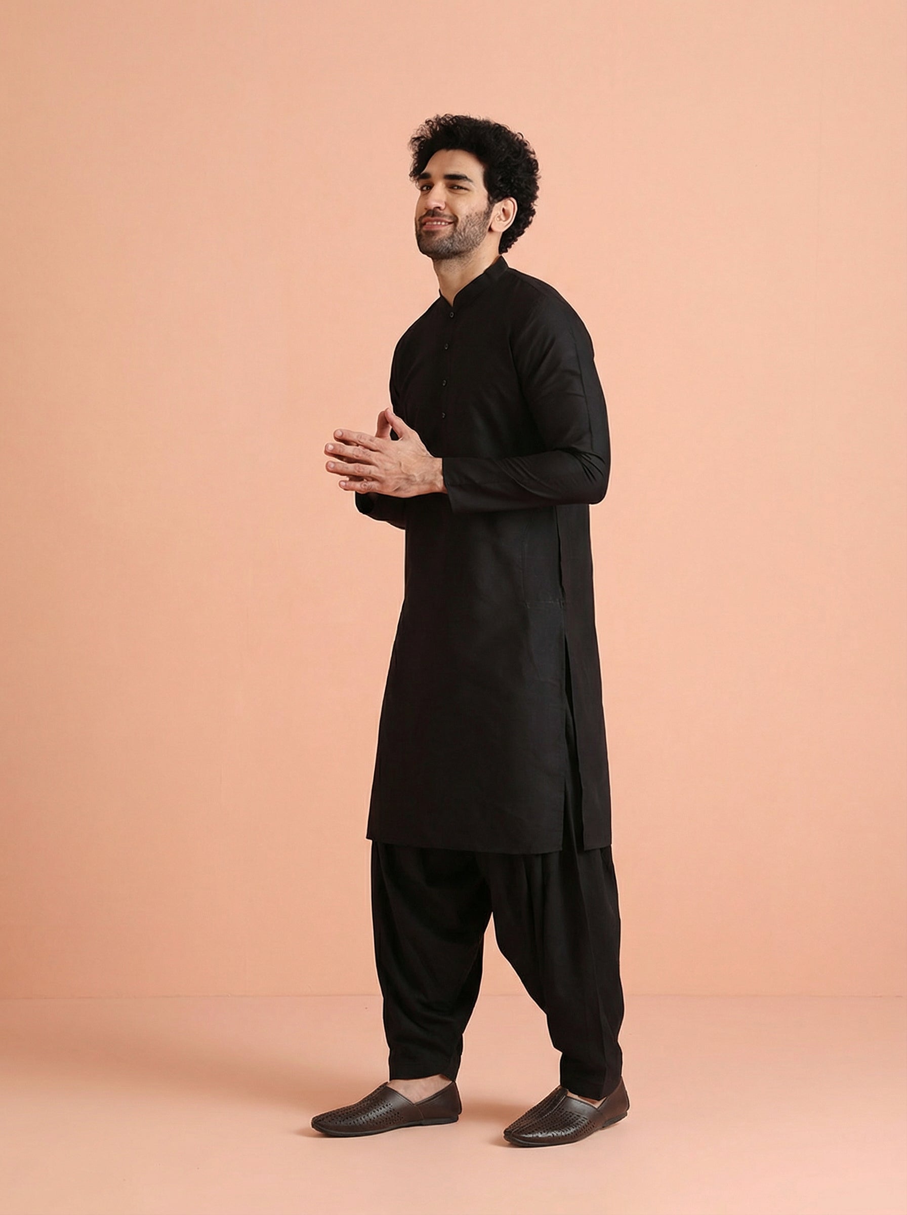 Black Cotton Blend Kurta Patiyala Set with a solid pattern. Perfect for festive and traditional occasions. Comfortable and stylish ethnic wear. Ideal for Eid festival.