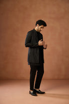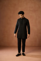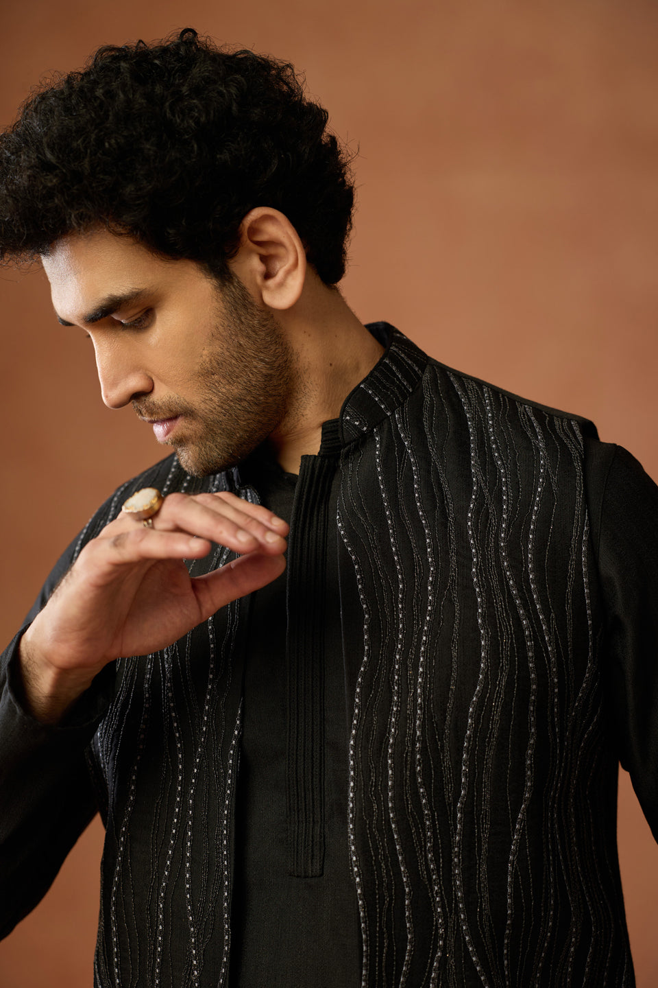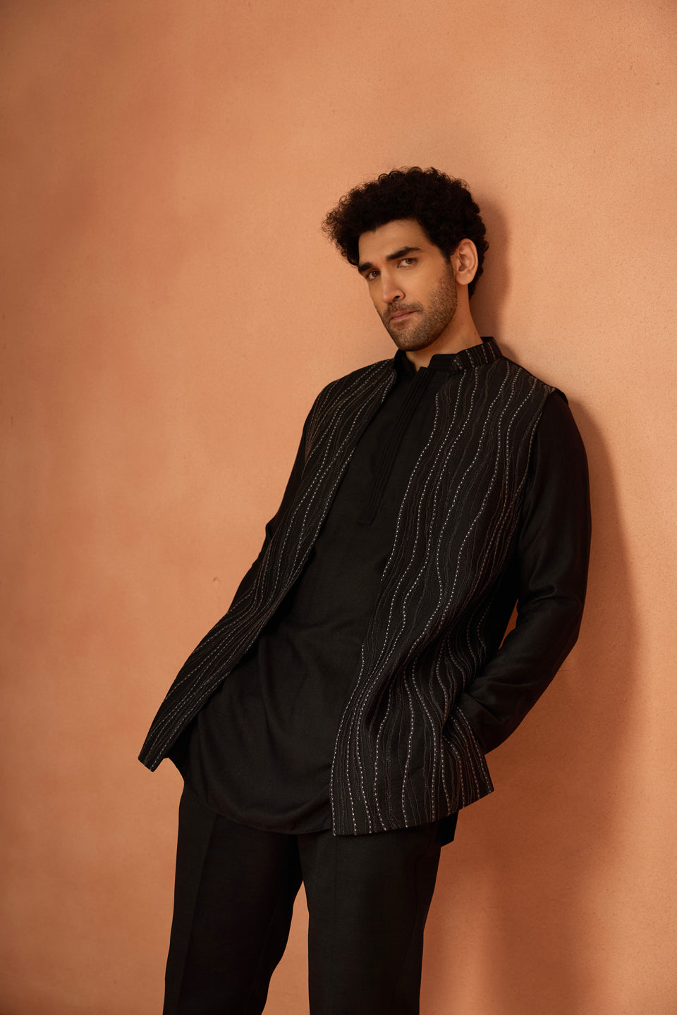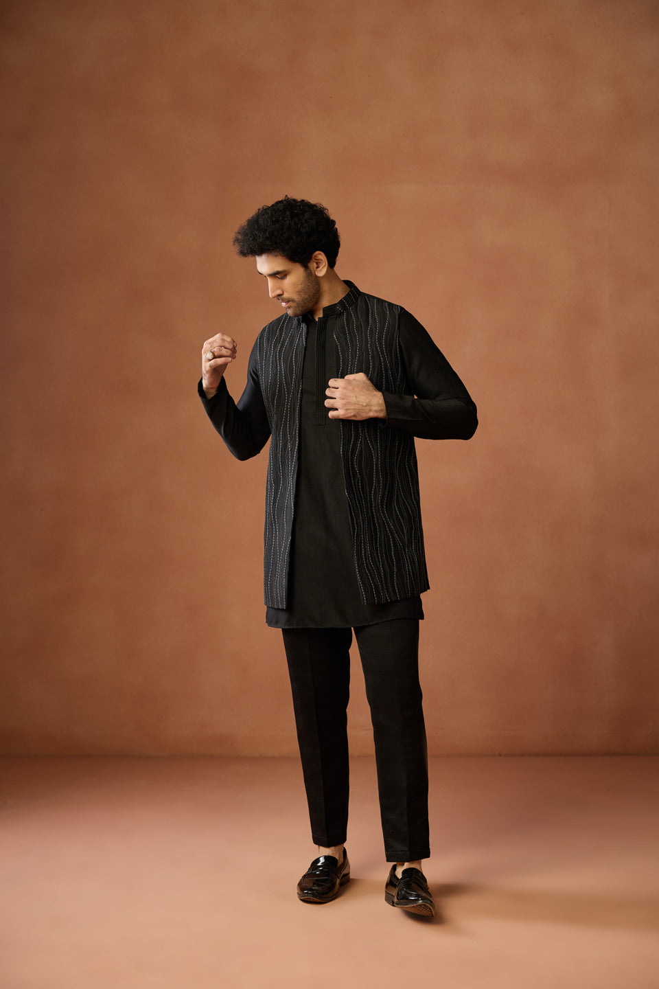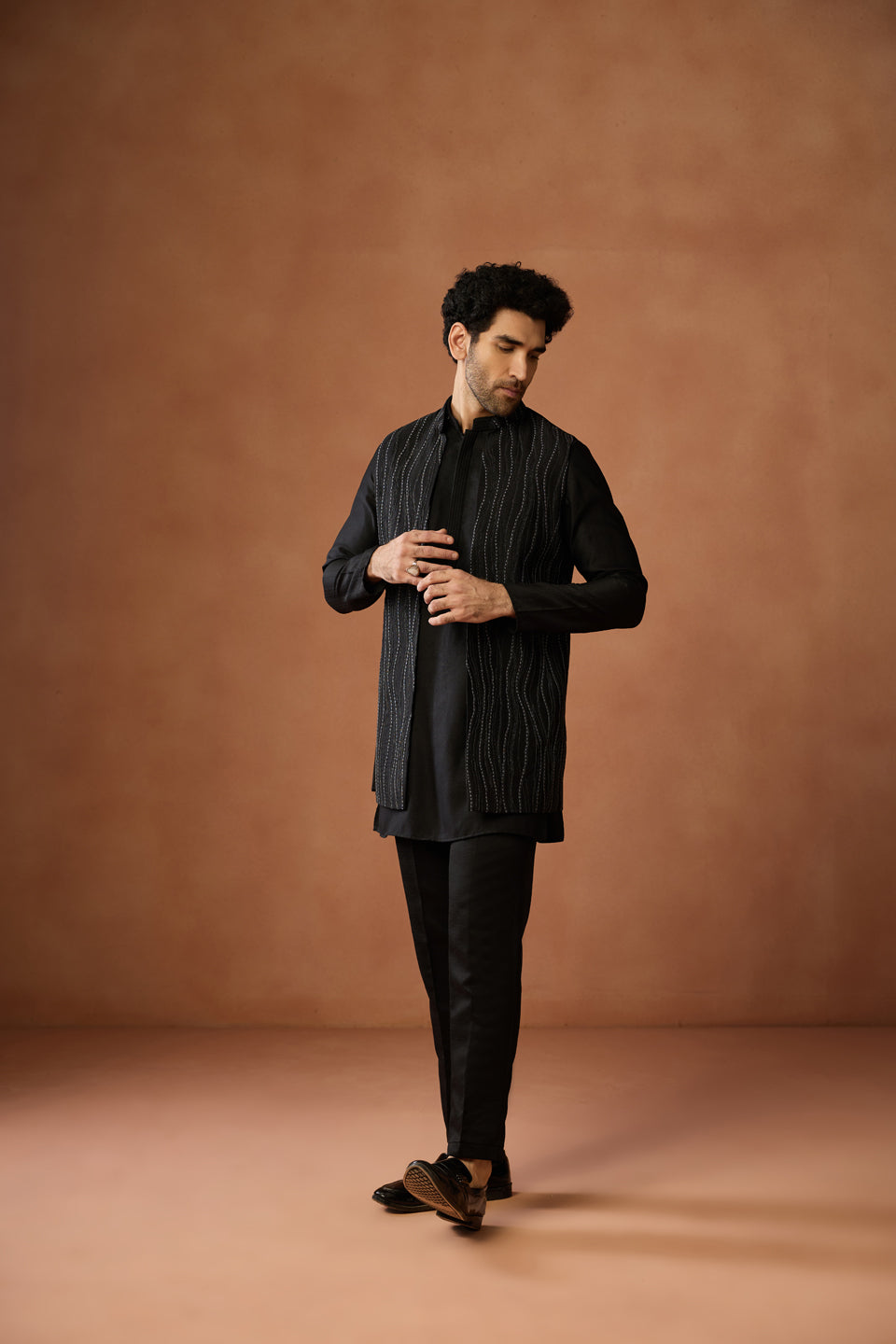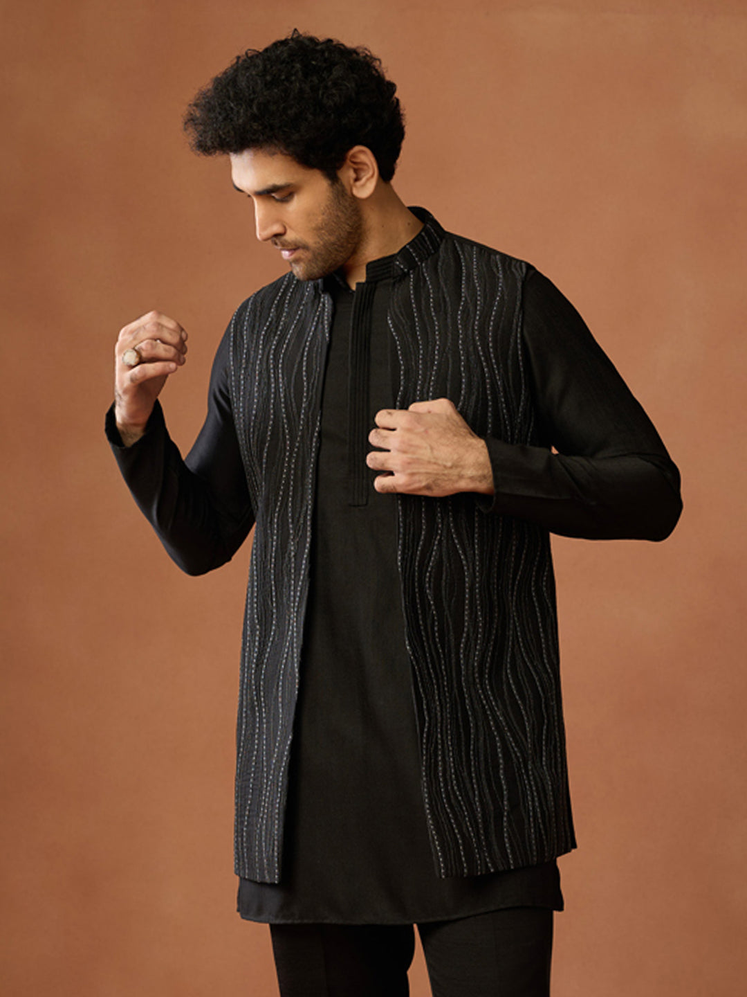 Kisah Black Silk Blend Mid Kurta Trouser Set with embroidered long jacket regal ethnic wear for weddings, receptions & cultural celebrations.