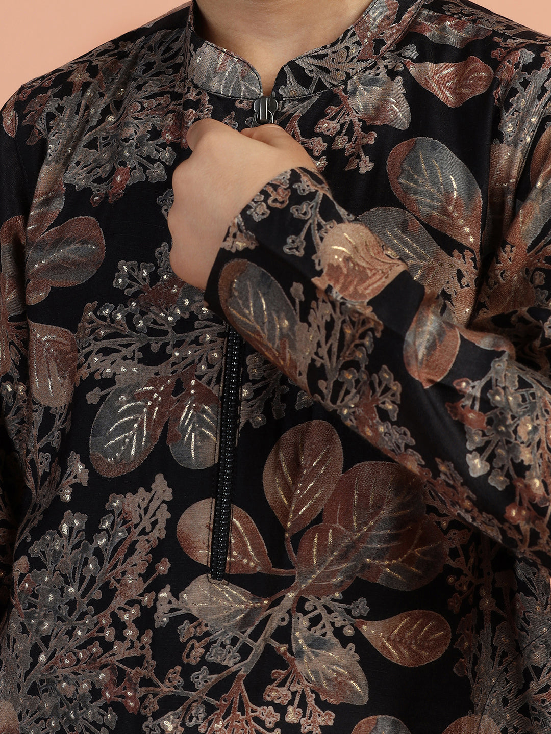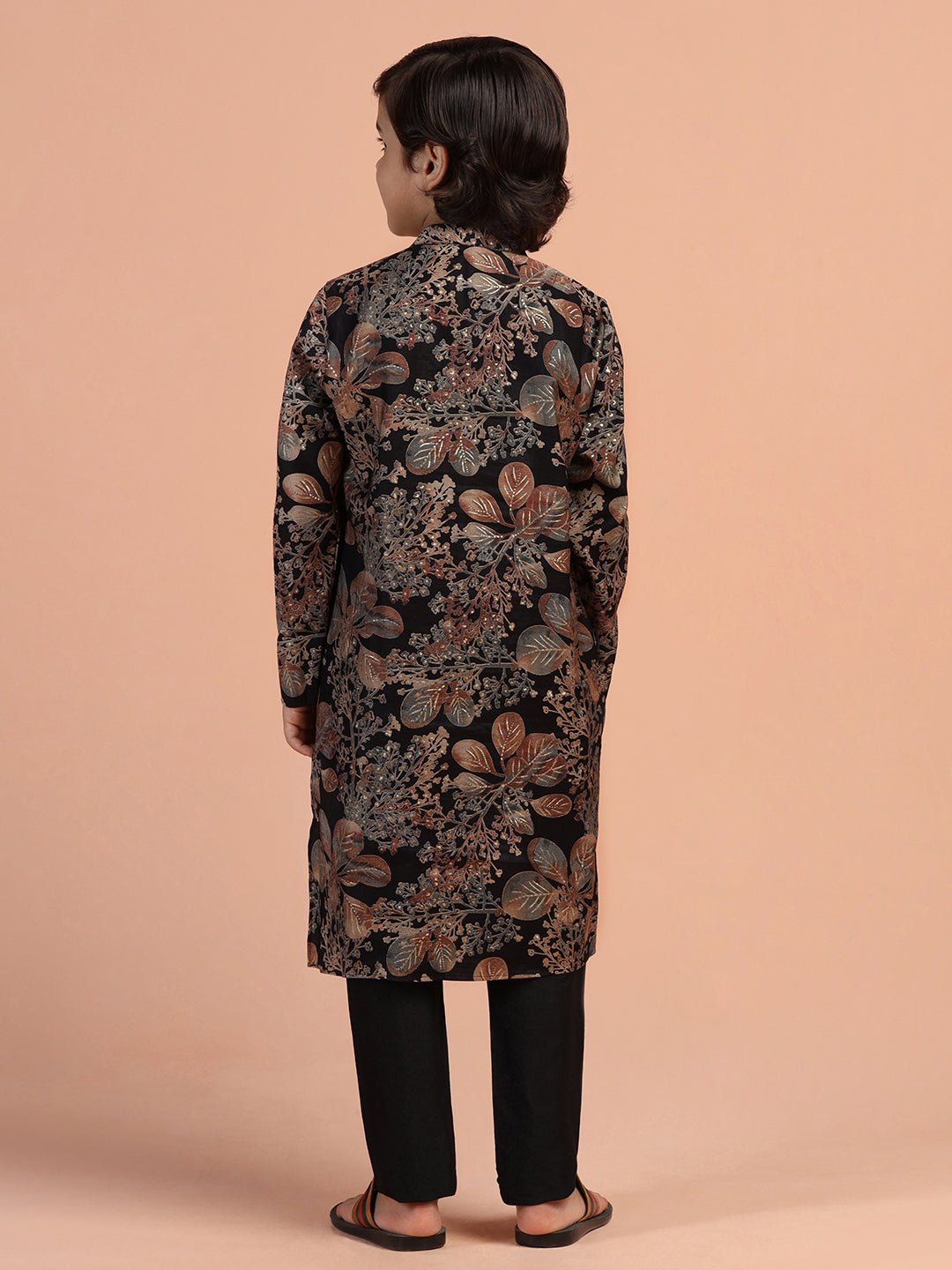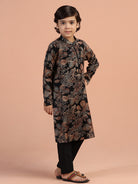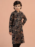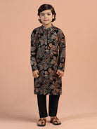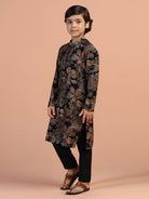 Boys’ black floral printed kurta in soft cotton blend – stylish festive wear perfect for weddings, parties, and ethnic celebrations.
