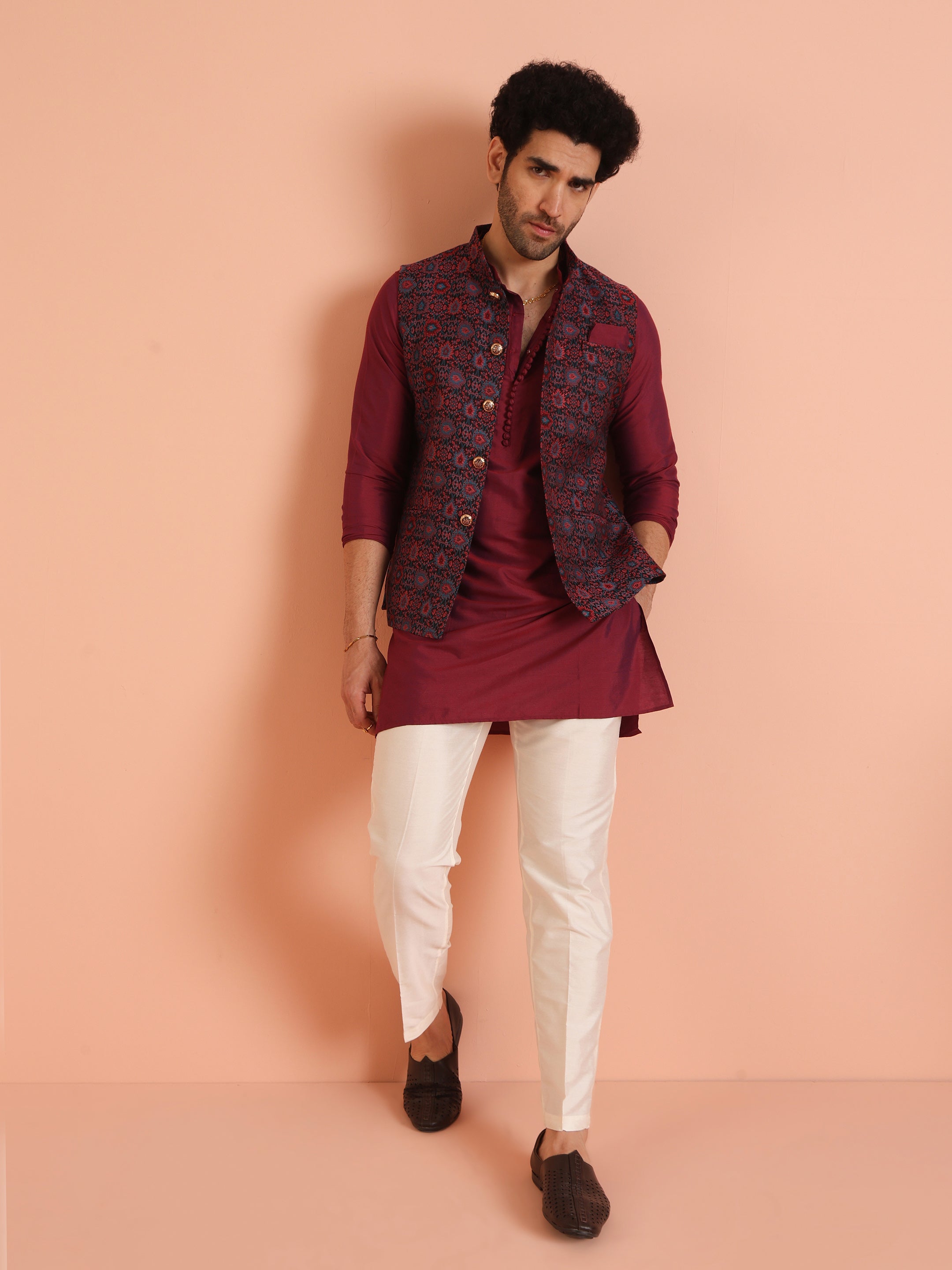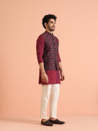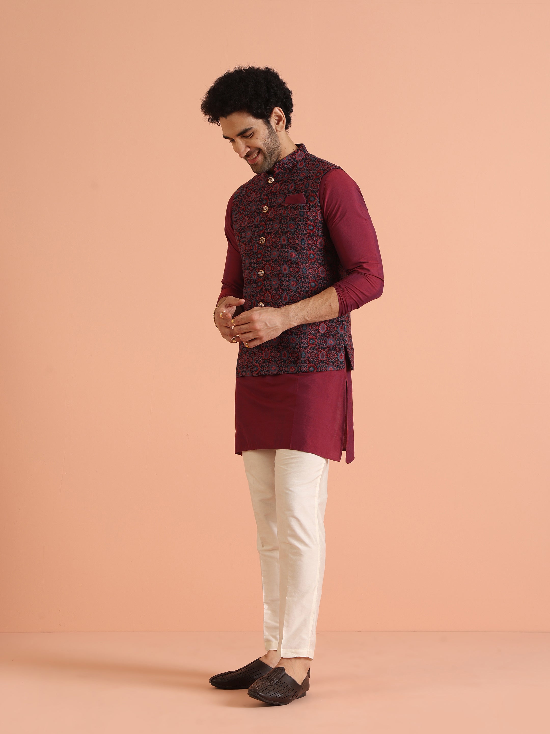 Kisah men’s black & maroon cotton silk Nehru jacket with woven motifs and metallic buttons. Ideal festive jacket for weddings, receptions & sangeet.