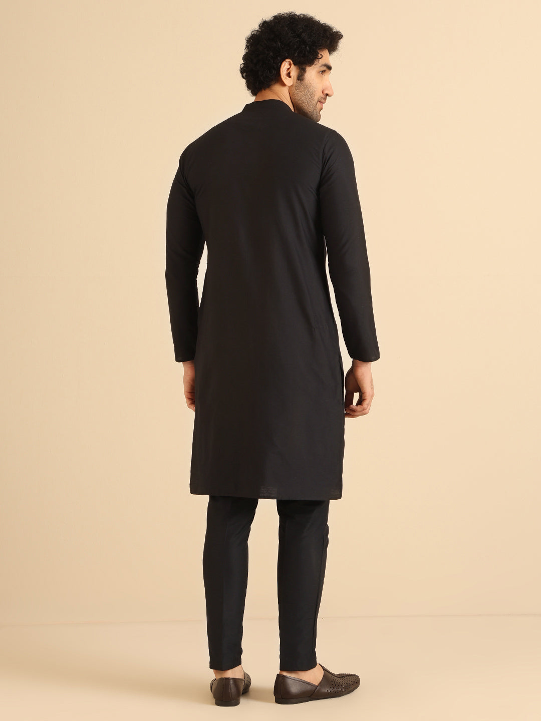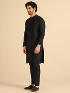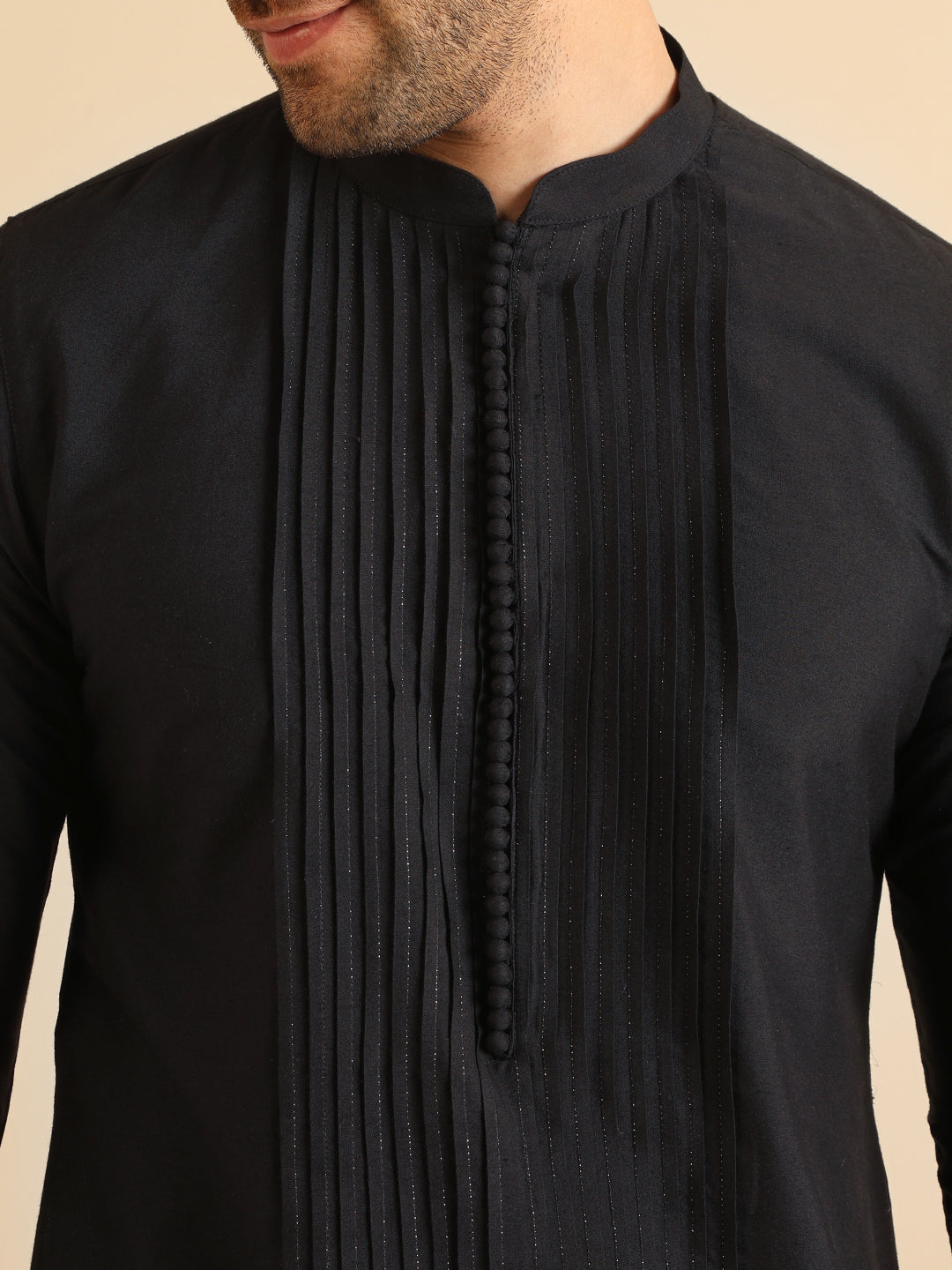 Kisah men’s black cotton silk kurta with pintuck detailing & fabric buttons. Perfect festive kurta for weddings, receptions, and traditional occasions.