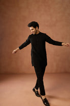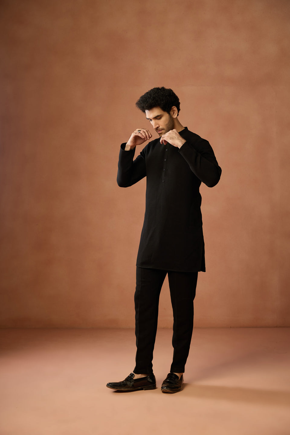Kisah Menss black silk blend solid mid kurta with mandarin collar and placket closure. Ideal for weddings, cocktails, and festive occasions.