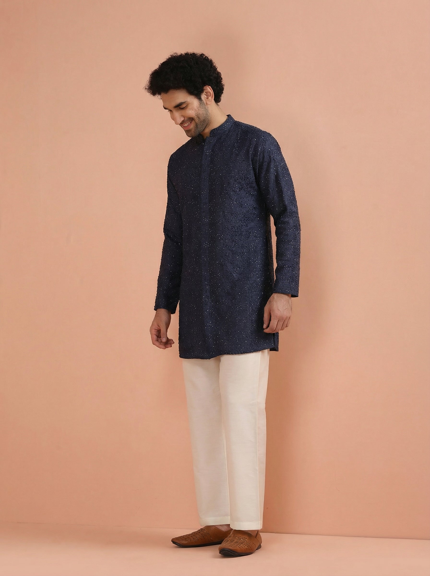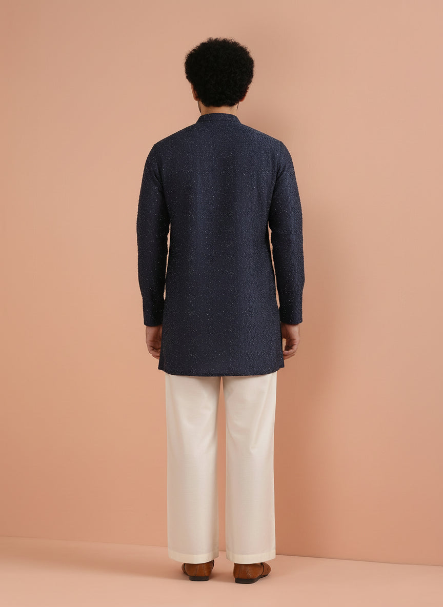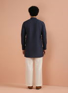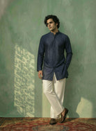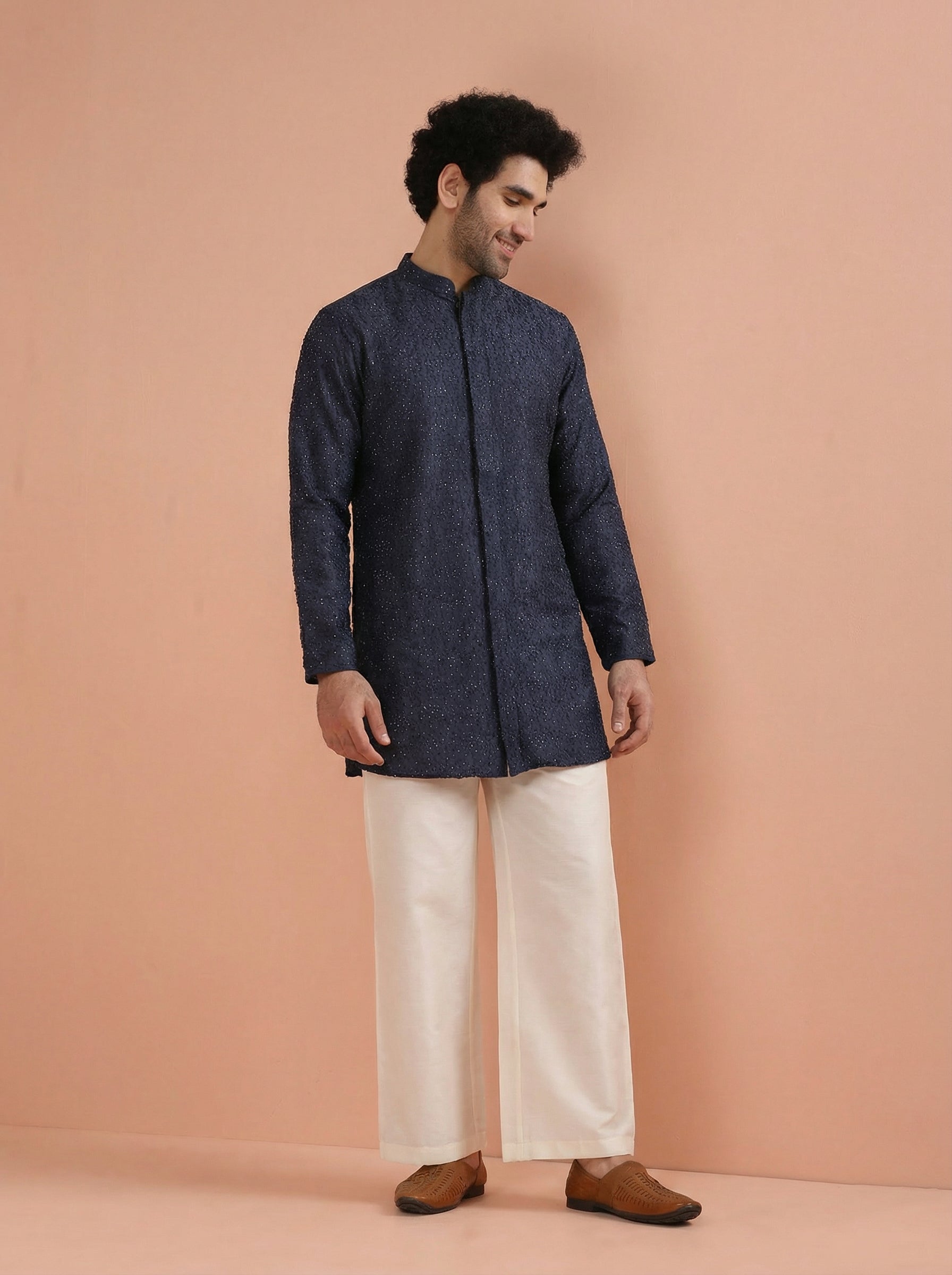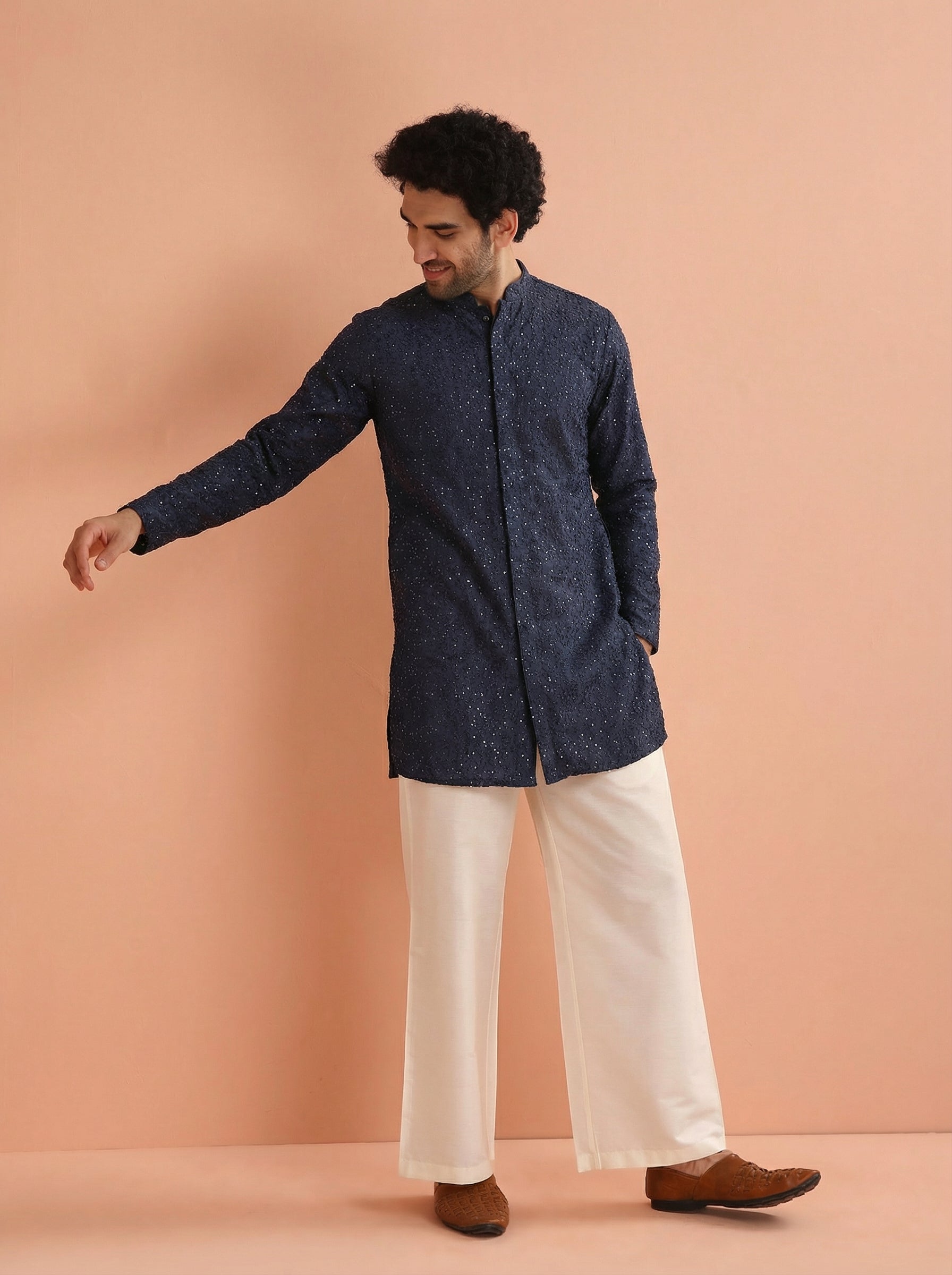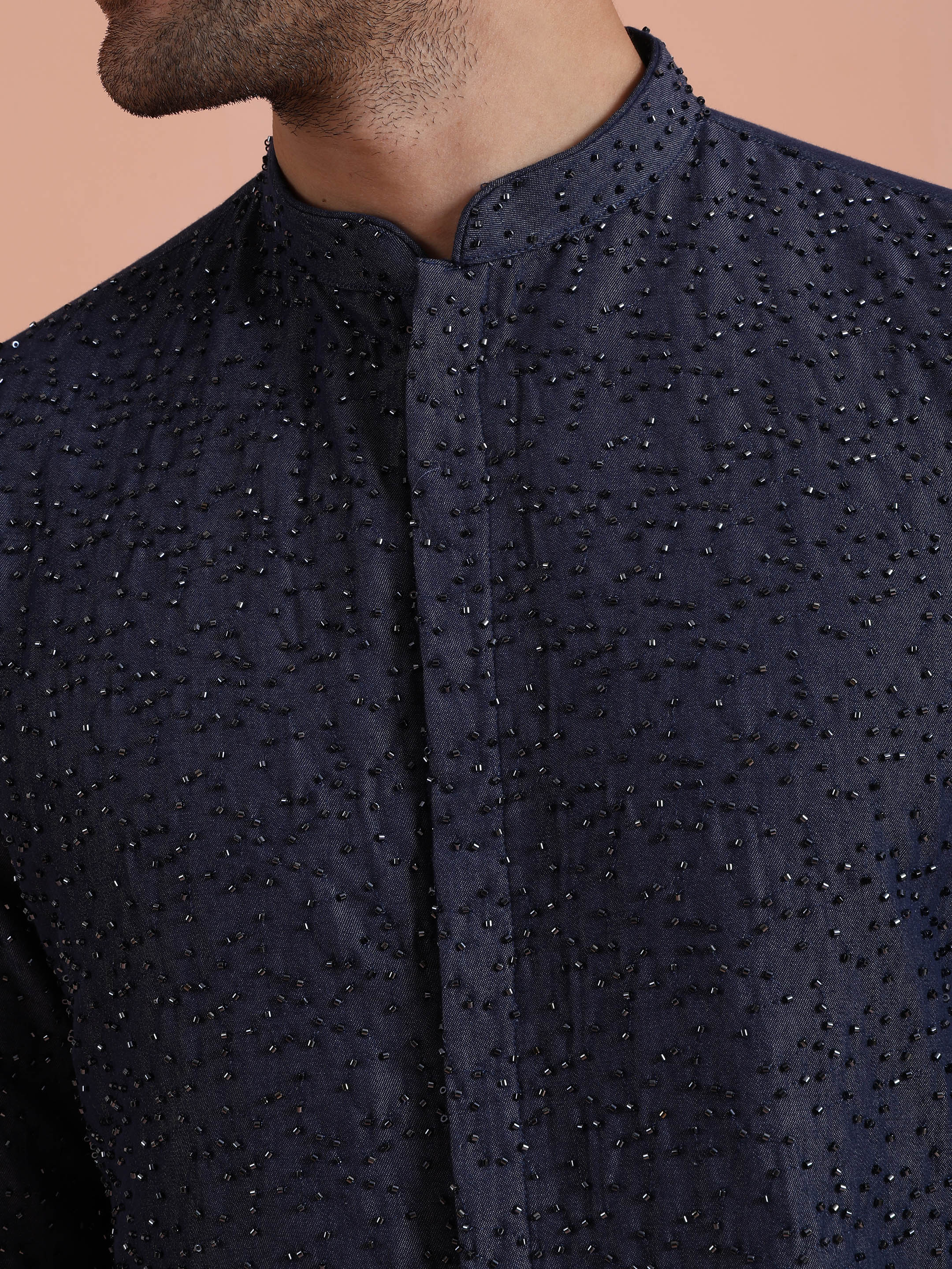 Elegant Front Open Mid Kurta Wide Leg Pant Set in Blue Denim with Embellished pattern. Perfect for festive and formal occasions. Ideal for Eid festival.