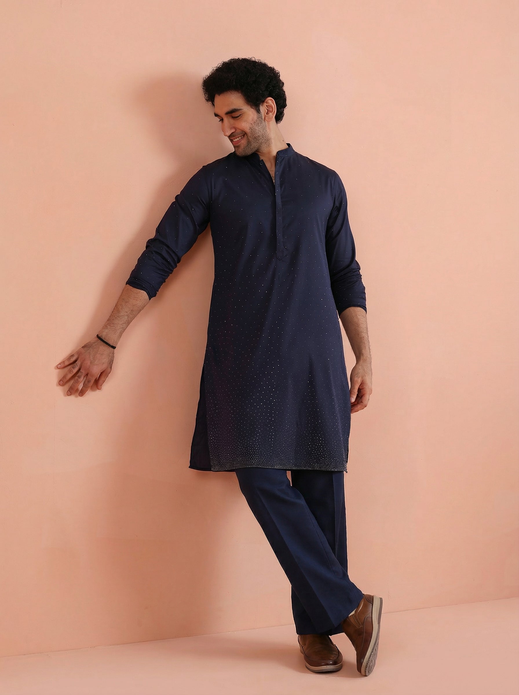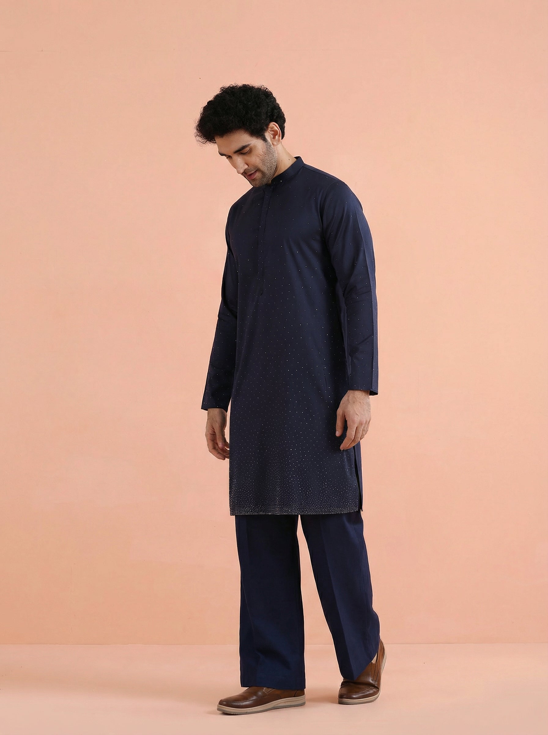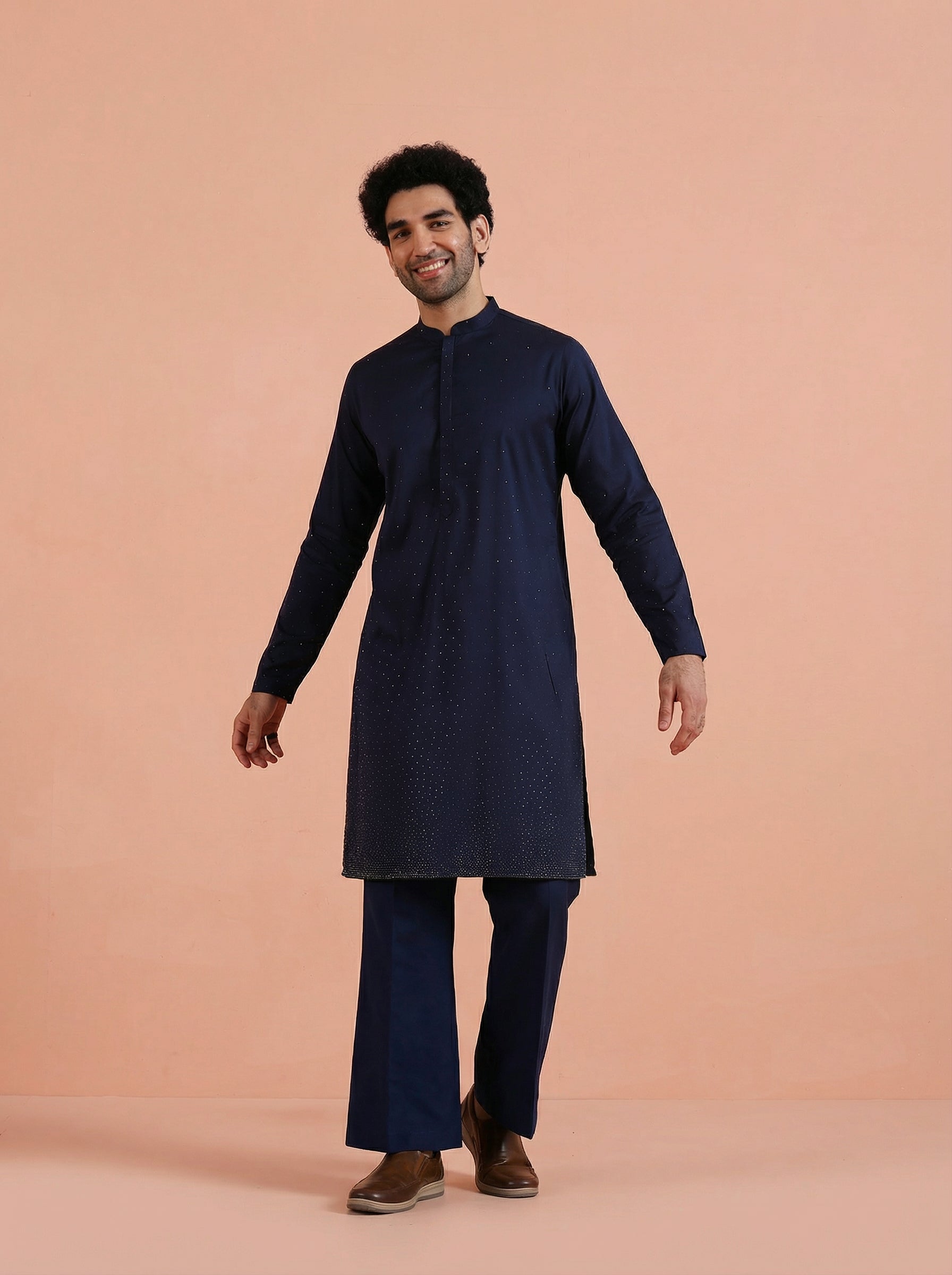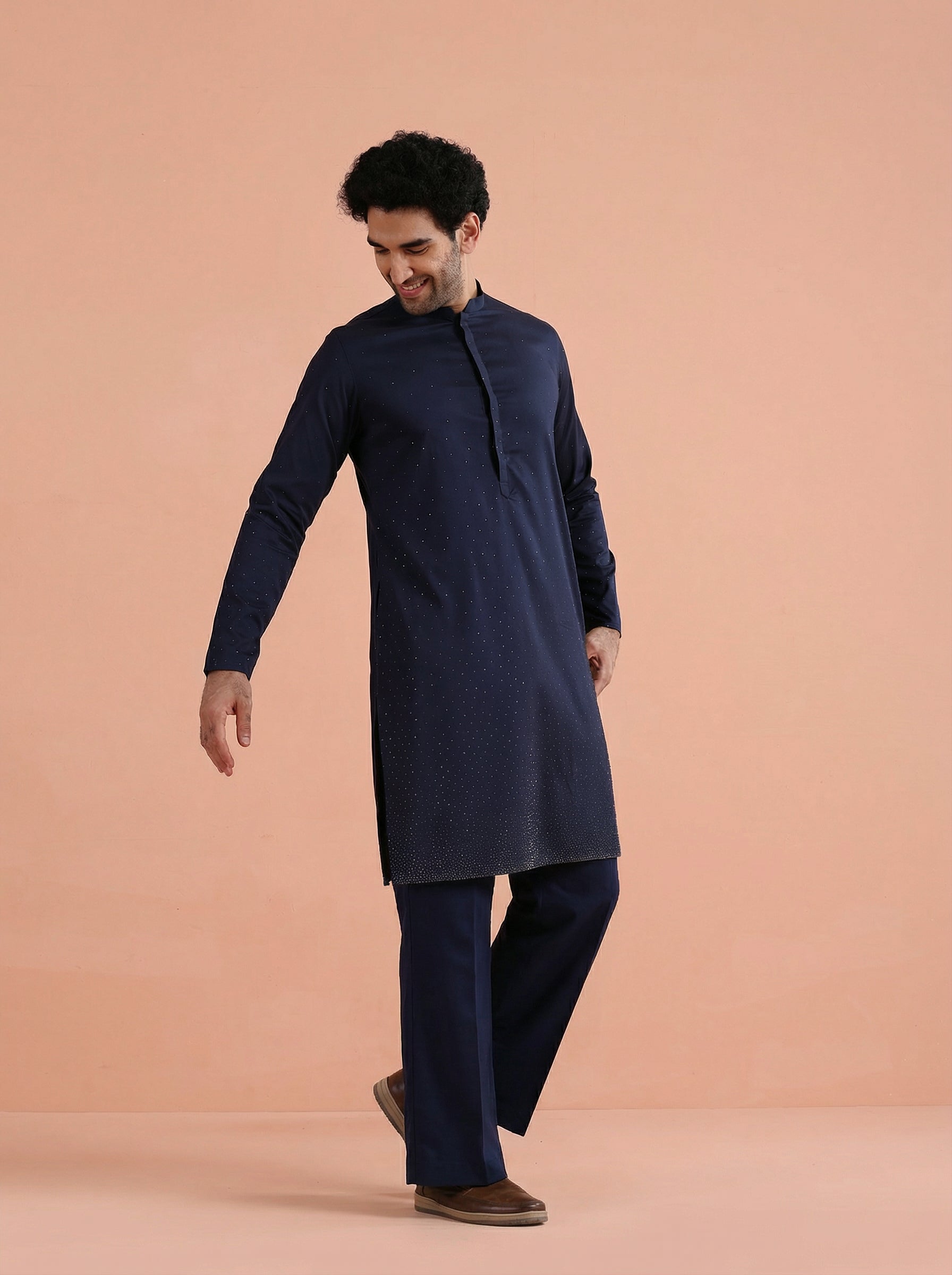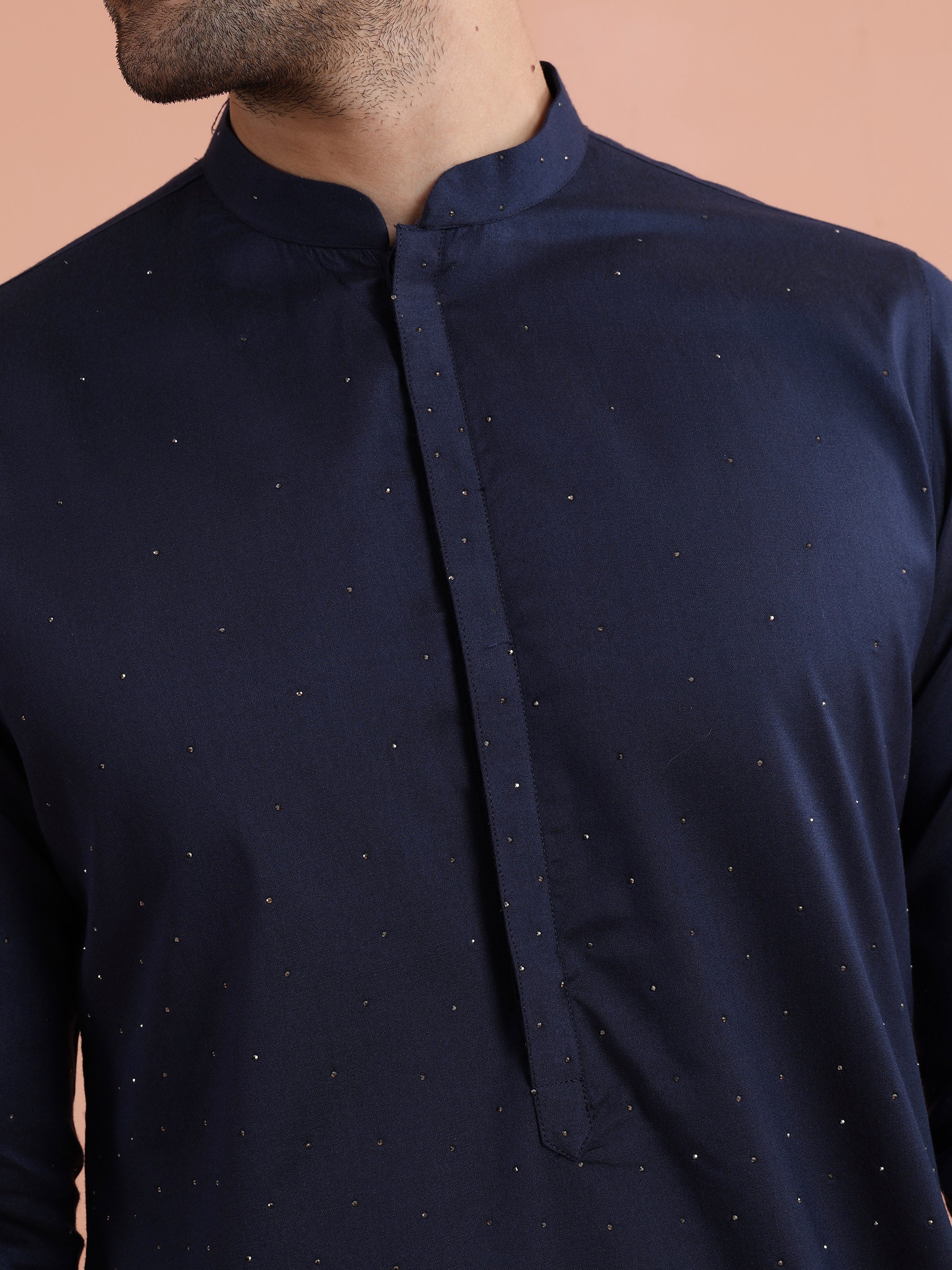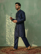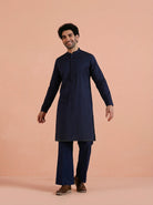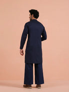 Elegant Blue Kurta Wide Leg Trouser Set crafted from Poly Silk with Swarovski detailing, perfect for festive and formal occasions. Ideal for Eid festival.