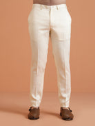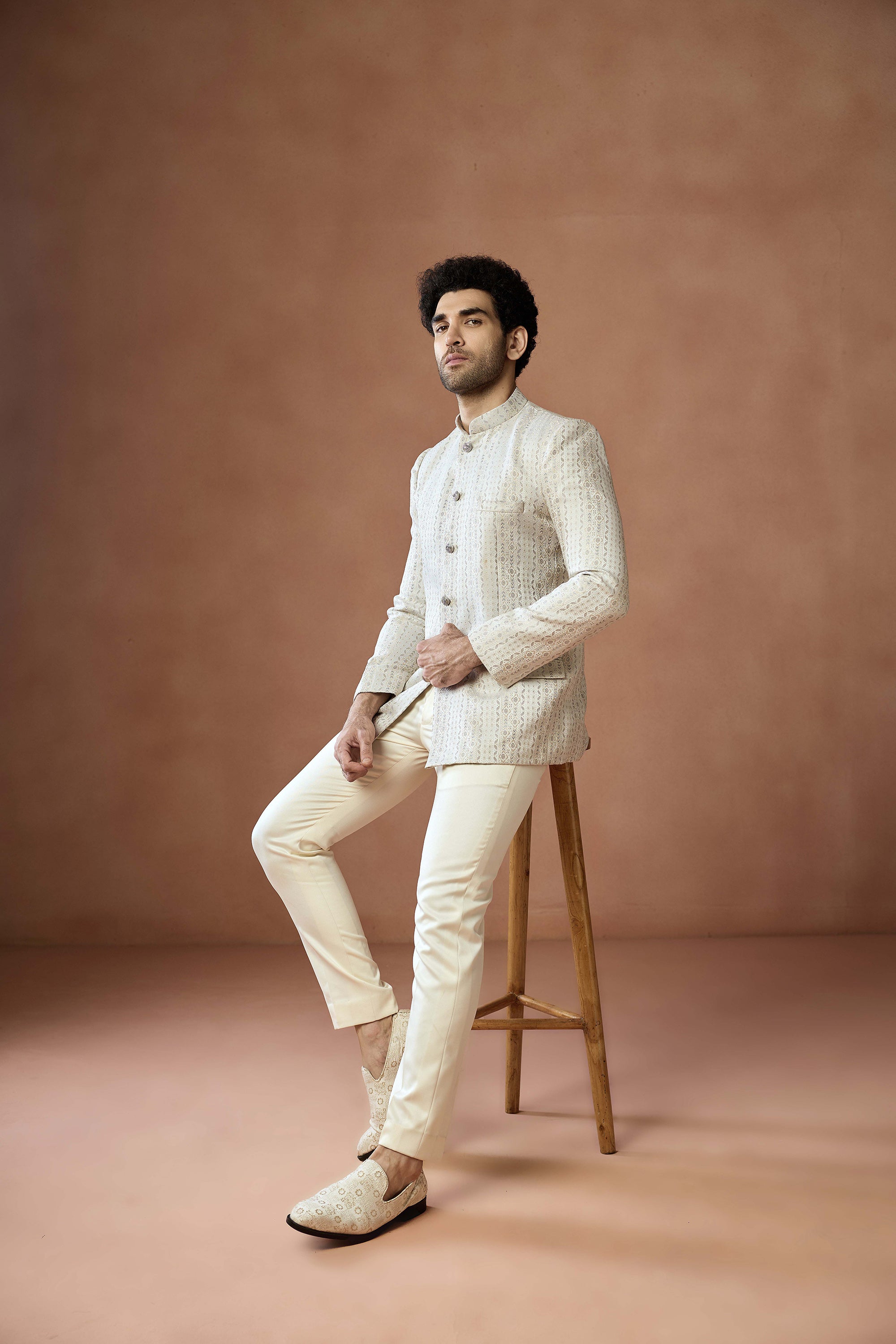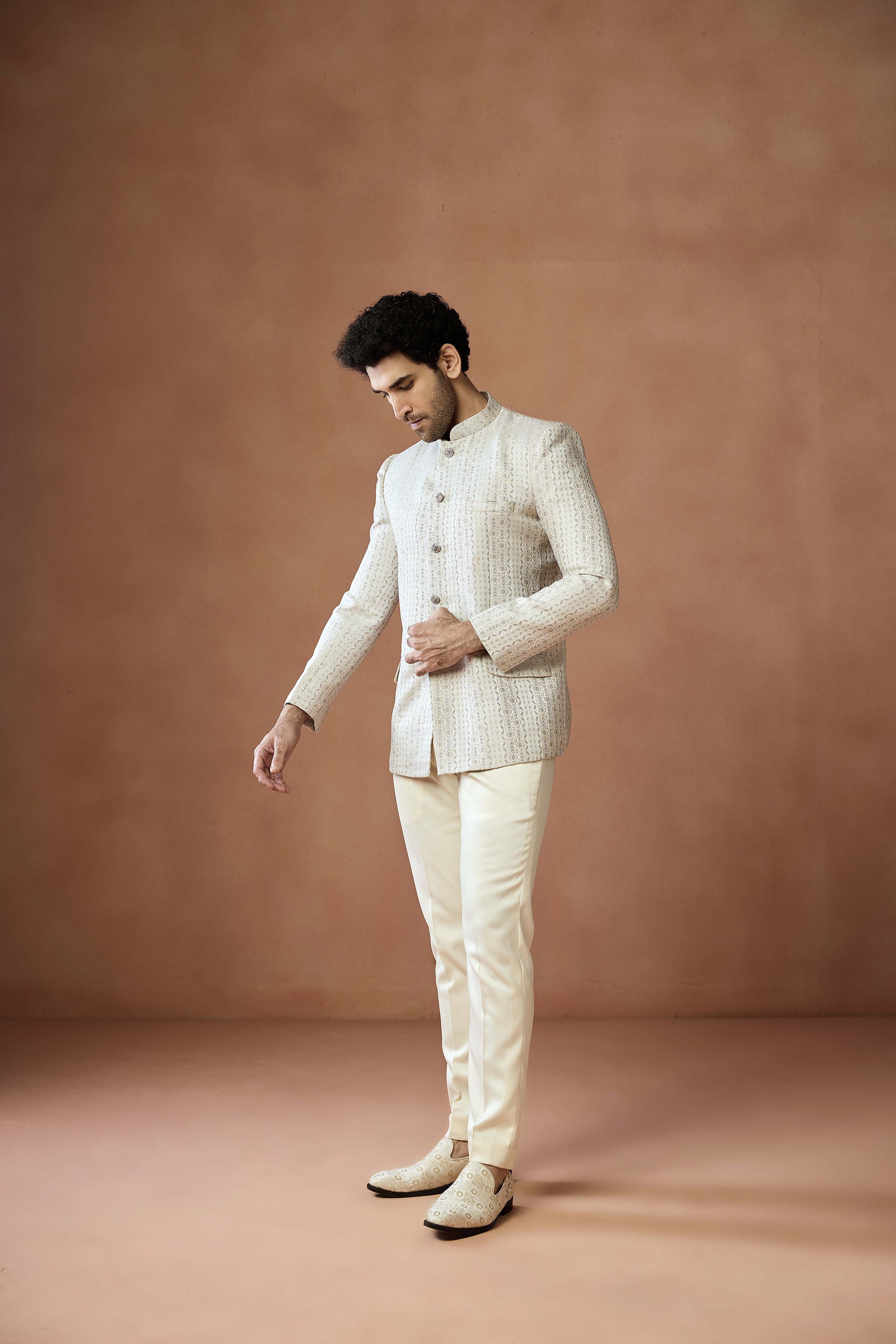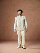 Cream silk blend jacquard bandhgala jacket for men. Jodhpuri style with silver buttons, perfect for weddings, receptions & festive occasions.