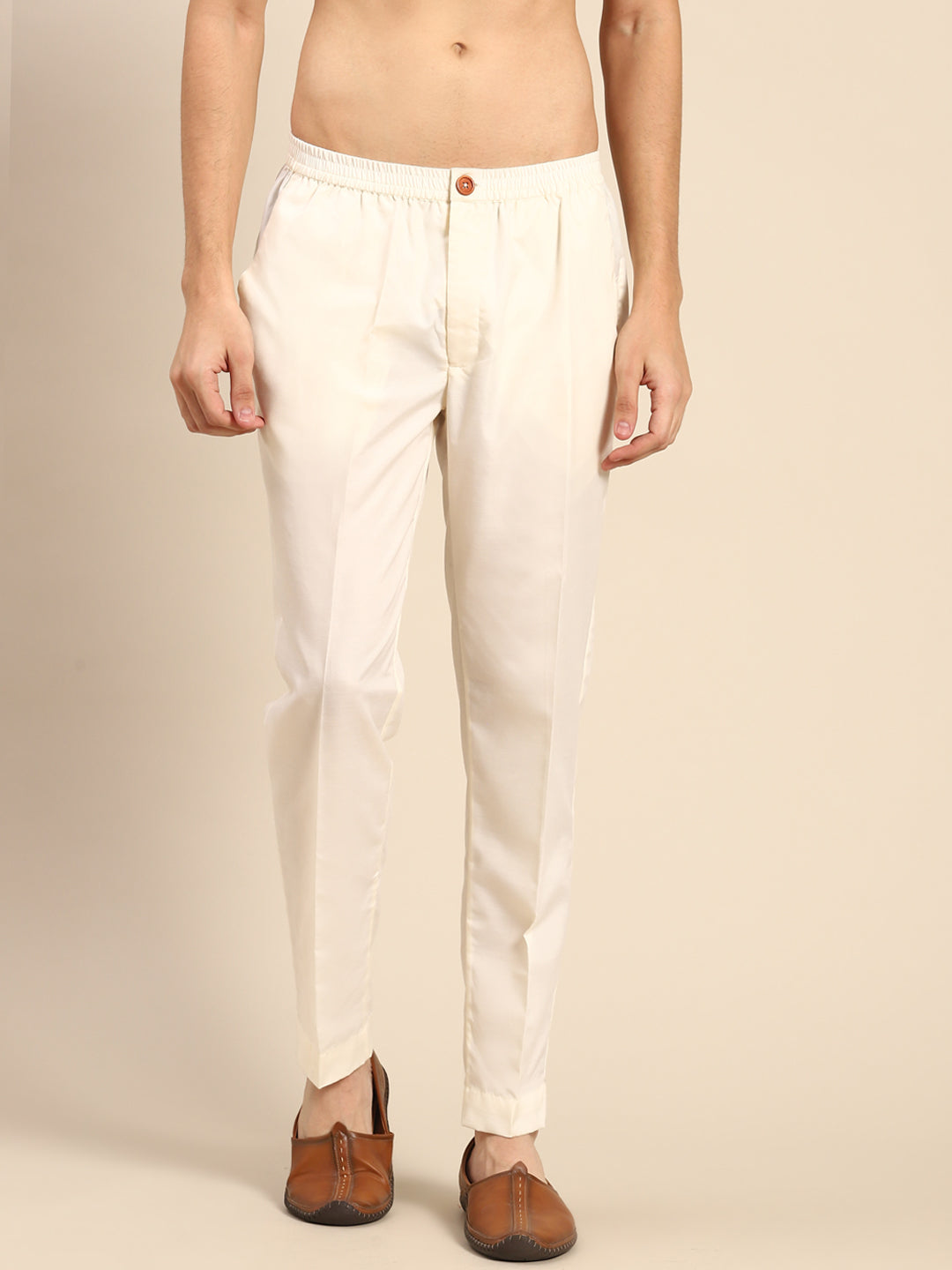 Cream solid trousers for men, perfect ethnic bottomwear to pair with kurtas or sherwanis for weddings and festive occasions.