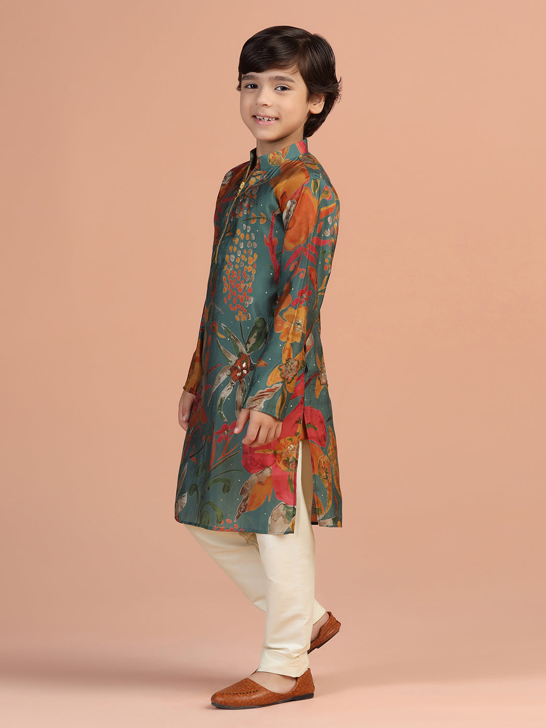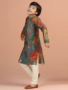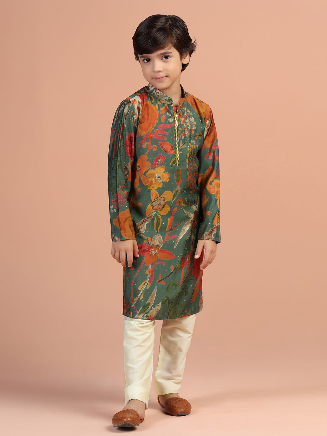 Stylish olive green floral printed satin kurta pyjama set for boys – vibrant, festive, and perfect for celebrations.