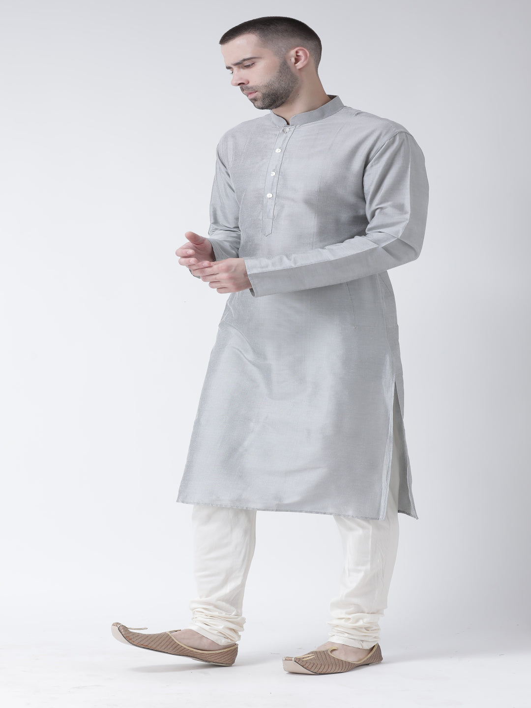 Kisah men’s grey cotton silk plain kurta with mandarin collar & button placket. A versatile minimal ethnic wear for festive and casual occasions.